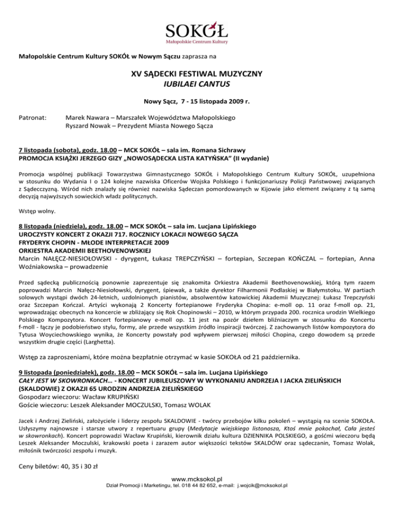 Małopolskie Centrum Kultury SOKÓŁ w Nowym Sączu zaprasza na XV SĄDECKI FESTIWAL MUZYCZNY IUBILAEI CANTUS Nowy Sącz, 7 ‐ 15 listopada 2009 r. Patronat: Marek Nawara – Marszałek Województwa Małopolskiego Ryszard Nowak – Prezydent Miasta Nowego Sącza 7 listopada (sobota), godz. 18.00 – MCK SOKÓŁ – sala im. Romana Sichrawy PROMOCJA KSIĄŻKI JERZEGO GIZY „NOWOSĄDECKA LISTA KATYŃSKA” (II wydanie) Promocja wspólnej publikacji Towarzystwa Gimnastycznego SOKÓŁ i Małopolskiego Centrum Kultury SOKÓŁ, uzupełniona w stosunku do Wydania I o 124 kolejne nazwiska Oficerów Wojska Polskiego i funkcjonariuszy Policji Państwowej związanych z Sądecczyzną. Wśród nich znalazły się również nazwiska Sądeczan pomordowanych w Kijowie jako element związany z tą samą decyzją najwyższych sowieckich władz politycznych. Wstęp wolny. 8 listopada (niedziela), godz. 18.00 – MCK SOKÓŁ – sala im. Lucjana Lipińskiego UROCZYSTY KONCERT Z OKAZJI 717. ROCZNICY LOKACJI NOWEGO SĄCZA FRYDERYK CHOPIN ‐ MŁODE INTERPRETACJE 2009 ORKIESTRA AKADEMII BEETHOVENOWSKIEJ Marcin NAŁĘCZ‐NIESIOŁOWSKI ‐ dyrygent, Łukasz TREPCZYŃSKI – fortepian, Szczepan KOŃCZAL – fortepian, Anna Woźniakowska – prowadzenie Przed sądecką publicznością ponownie zaprezentuje się znakomita Orkiestra Akademii Beethovenowskiej, którą tym razem poprowadzi Marcin Nałęcz‐Niesiołowski, dyrygent, śpiewak, a także dyrektor Filharmonii Podlaskiej w Białymstoku. W partiach solowych wystąpi dwóch 24‐letnich, uzdolnionych pianistów, absolwentów katowickiej Akademii Muzycznej: Łukasz Trepczyński oraz Szczepan Kończal. Artyści wykonają 2 Koncerty fortepianowe Fryderyka Chopina: e‐moll op. 11 oraz f‐moll op. 21, wprowadzając obecnych na koncercie w zbliżający się Rok Chopinowski – 2010, w którym przypada 200. rocznica urodzin Wielkiego Polskiego Kompozytora. Koncert fortepianowy e‐moll op. 11 jest na pozór dziełem bliźniaczym w stosunku do Koncertu f‐moll ‐ łączy je podobieństwo stylu, formy, ale przede wszystkim źródło inspiracji twórczej. Z zachowanych listów kompozytora do Tytusa Woyciechowskiego wynika, że Koncerty powstały pod wpływem pierwszej miłości Chopina, czego dowodem są przede wszystkim drugie części (Larghetta). Wstęp za zaproszeniami, które można bezpłatnie otrzymać w kasie SOKOŁA od 21 października. 9 listopada (poniedziałek), godz. 18.00 – MCK SOKÓŁ – sala im. Lucjana Lipińskiego CAŁY JEST W SKOWRONKACH… ‐ KONCERT JUBILEUSZOWY W WYKONANIU ANDRZEJA I JACKA ZIELIŃSKICH (SKALDOWIE) Z OKAZJI 65 URODZIN ANDRZEJA ZIELIŃSKIEGO Gospodarz wieczoru: Wacław KRUPIŃSKI Goście wieczoru: Leszek Aleksander MOCZULSKI, Tomasz WOLAK Jacek i Andrzej Zieliński, założyciele i liderzy zespołu SKALDOWIE ‐ twórcy przebojów kilku pokoleń – wystąpią na scenie SOKOŁA. Usłyszymy najnowsze i starsze utwory z repertuaru grupy (Medytacje wiejskiego listonosza, Ktoś mnie pokochał, Cała jesteś w skowronkach). Koncert poprowadzi Wacław Krupiński, kierownik działu kultura DZIENNIKA POLSKIEGO, a gośćmi wieczoru będą Leszek Aleksander Moczulski, krakowski poeta i zarazem autor większości tekstów SKALDÓW oraz sądeczanin, Tomasz Wolak, miłośnik twórczości zespołu i muzyk. Ceny biletów: 40, 35 i 30 zł www.mcksokol.pl Dział Promocji i Marketingu, tel. 018 44 82 652, e-mail: [email protected] 10 listopada (wtorek), godz. 11.00 i 18.00 – MCK SOKÓŁ – sala im. Lucjana Lipińskiego JULIUSZ SŁOWACKI – BALLADYNA – spektakle teatralne w wykonaniu Teatru GROTESKA w Krakowie Reżyseria: Bogdan CIOSEK, scenografia: Jerzy KALINA, muzyka: Paweł MOSZUMAŃSKI, ruch sceniczny lalek: Krzysztof FALKOWSKI Występują: Aldona JANKOWSKA (gościnnie), Włodzimierz JASIŃSKI, Franciszek MUŁA Rzadko zdarzają się w naszych teatrach tak czyste, klarowne przedstawienia, poetyckie i poruszające zarazem, w których na dodatek wszystko się zgadza. Logiczny wywód reżysera przełożony zostaje na sceniczny świat ludzi i lalek, budująca napięcie muzyka współbrzmi ze scenografią, prowadząc do finałowego pioruna, którego uderzenie przerwie poplątaną nić życia zbrodniarzy. A w uszach widzów pozostanie głuchy dźwięk uderzanych o siebie kamieni, o którym jeszcze długo po skończeniu spektaklu trudno będzie zapomnieć. (Magda Huzarska, Gazeta Krakowska, 1.03.2005r.) Ceny biletów: godz. 11.00 (spektakl dla młodzieży szkolnej) – 15 zł godz. 18.00 – 25, 20 i 15 zł 11 listopada (środa), godz. 19.00 ‐ Bazylika św. Małgorzaty w Nowym Sączu VIVA POLONIA – UROCZYSTY KONCERT Z OKAZJI ŚWIĘTA NIEPODLEGŁOŚCI Sądeckie chóry ‐ ECHO II, SCHERZO, PARAFIALNY CHÓR IM. KS. JERZEGO POPIEŁUSZKI W MARCINKOWICACH, CHÓR KAMERALNY BAZYLIKI ŚW. MAŁGORZATY, CHÓR PAŃSTWOWEJ SZKOŁY MUZYCZNEJ I i II STOPNIA, CHÓR PRZY PARAFII MATKI BOŻEJ BOLESNEJ W NOWYM SĄCZU‐ZAWADZIE, CHÓR IM. JANA PAWŁA II Dyrygenci chórów: Andrzej CITAK, Renata JONAKOWSKA‐OLSZOWSKA, Marzena PIKUŁA, Marian SALAMON, Stanisław WOLAK ORKIESTRA DĘTA OSP W OKULICACH POD DYR. WALDEMARA GRONIA 7 chórom sądeckim towarzyszyć będzie Orkiestra Dęta OSP z Okulic spod Bochni, znakomity zespół, laureat Grand Prix tegorocznego XXXII Małopolskiego Festiwalu Orkiestr Dętych ECHO TROMBITY. Wykonawcy (łącznie ok. 250 osób) wykonają utwory patriotyczne i religijne, co podkreśli uroczysty i podniosły charakter polskiego święta narodowego. Wstęp wolny. 14 listopada (sobota), godz. 19.00 – MCK SOKÓŁ – sala im. Romana Sichrawy NO I JAK TU NIE JECHAĆ… CZYLI POWRÓT STARSZYCH PANÓW – spektakl Teatru im. Konstantego Ildefonsa Gałczyńskiego w Michałowie i Towarzystwa Teatralnego „Pod Górkę” Scenariusz i reżyseria ‐ Grażyna MATYSZKIEWICZ, występują: Stanisław GÓRKA, Jerzy DERFEL ‐ fortepian Sięgnąć po mistrzowskie miniatury słowno‐muzyczne Przybory i Wasowskiego, oddać ich wdzięk i fine