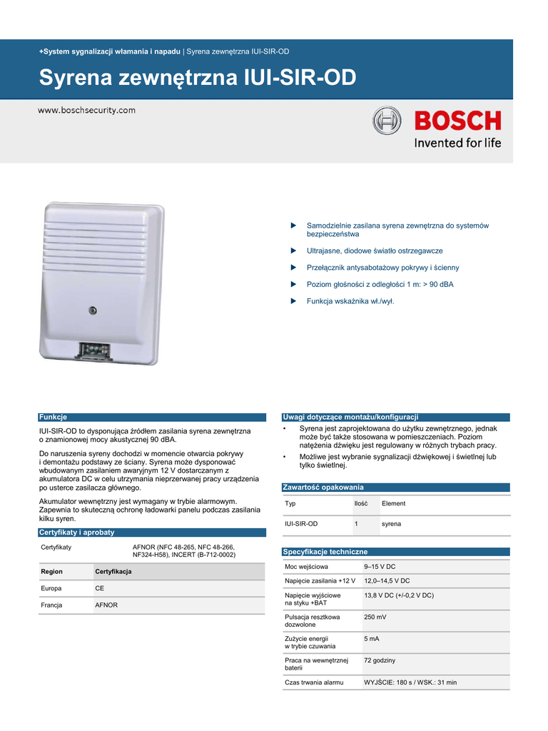 +System sygnalizacji włamania i napadu | Syrena zewnętrzna IUI-SIR-OD Syrena zewnętrzna IUI-SIR-OD Samodzielnie zasilana syrena zewnętrzna do systemów bezpieczeństwa Ultrajasne, diodowe światło ostrzegawcze Przełącznik antysabotażowy pokrywy i ścienny Poziom głośności z odległości 1 m: > 90 dBA Funkcja wskaźnika wł./wył. Funkcje Uwagi dotyczące montażu/konfiguracji IUI-SIR-OD to dysponująca źródłem zasilania syrena zewnętrzna o znamionowej mocy akustycznej 90 dBA. • Syrena jest zaprojektowana do użytku zewnętrznego, jednak może być także stosowana w pomieszczeniach. Poziom natężenia dźwięku jest regulowany w różnych trybach pracy. Do naruszenia syreny dochodzi w momencie otwarcia pokrywy i demontażu podstawy ze ściany. Syrena może dysponować wbudowanym zasilaniem awaryjnym 12 V dostarczanym z akumulatora DC w celu utrzymania nieprzerwanej pracy urządzenia po usterce zasilacza głównego. • Możliwe jest wybranie sygnalizacji dźwiękowej i świetlnej lub tylko świetlnej. Akumulator wewnętrzny jest wymagany w trybie alarmowym. Zapewnia to skuteczną ochronę ładowarki panelu podczas zasilania kilku syren. Zawartość opakowania Typ Ilość Element IUI-SIR-OD 1 syrena Certyfikaty i aprobaty Certyfikaty AFNOR (NFC 48-265, NFC 48-266, NF324-H58), INCERT (B-712-0002) Region Certyfikacja Europa CE Francja AFNOR Specyfikacje techniczne Moc wejściowa 9–15 V DC Napięcie zasilania +12 V 12,0–14,5 V DC Napięcie wyjściowe na styku +BAT 13,8 V DC (+/-0,2 V DC) Pulsacja resztkowa dozwolone 250 mV Zużycie energii w trybie czuwania 5 mA Praca na wewnętrznej baterii 72 godziny Czas trwania alarmu WYJŚCIE: 180 s / WSK.: 31 min 2 | Syrena zewnętrzna IUI-SIR-OD Zużycie energii w trybie alarmu i dźwięku WYJ. MAKS: 1,6 A, 109 dB na 1 m WYJ. MIN: 0,8 A, 100 dB na 1 m WSK. MAKS.: 1,6 A, 113 dB na 1 m WSK. MIN: 0,8 A, 110 dB na 1 m Zużycie energii w trybie alarmu świetlnego 20 mA Napięcie SIR i We/Wy 9–16 V DC Napięcie wywołania SIR i We/Wy poniżej 3 V DC: Napięcie zerowania SIR i We/Wy powyżej 9 V DC: Zasilanie awaryjne 12 V DC / 2 Ah Moc wyjściowa Minimum 90 dBA przy 1 m Zastosowania Syrena wewnętrzna Zakres temperatur Od -25°C do +70°C Obudowa Obudowa z odlewanego aluminium, światło błyskowe ze wzmocnionego poliwenglanu Stopień ochrony IP43 IK 08 Klasa środowiskowa Klasa IV – ogólne Wymiary 244 x 184 x 82 mm Masa 1700 g Typ akumulatorów zapasowych 12 V 2,1 Ah Yuasa NP2.1-12FR 12 V 2,1 Ah Yucell Y2.1 -12FR 12 V 2,0 Ah Powersonic PS 1220 V0 12 V 2,2A h Eleckson BEL 120022 12 V 2,3 Ah ACD ST20 12 V 2,3 Ah Sunlight SP 12-2.1V0 Informacje dotyczące zamawiania Syrena zewnętrzna IUI-SIR-OD IUI-SIR-OD to dysponująca źródłem zasilania syrena zewnętrzna o znamionowej mocy akustycznej 90 dBA. Nr zamówienia IUI-SIR-OD Przedstawiciel: Ameryki: Bosch Security Systems, Inc. 130 Perinton Parkway Fairport, Nowy Jork, 14450, USA Tel.: +1 800 289 0096 Faks: +1 585 223 9180 [email protected] www.boschsecurity.us Europa, Bliski Wschód, Afryka: Bosch Security Systems B.V. Skrz. poczt. 80002 5617 BA Eindhoven, Holandia Tel.: + 31 40 2577 284 Faks: +31 40 2577 330 [email protected] www.boschsecurity.com © Bosch Security Systems 2013 | Dane mogą ulec zmianie bez uprzedzenia 1413483403 | en, V1, 01. 10.2013 Azja i Pacyfik: Robert Bosch (SEA) Pte Ltd, Security Systems 11 Bishan Street 21 Singapur 573943 Tel.: +65 6571 2808 Faks: +65 6571 2699 [email protected] www.boschsecurity.asia Chiny: Bosch (Shanghai) Security Systems Ltd. 201 Building, No. 333 Fuquan Road North IBP Changning, Szanghaj 200335 Chiny Telefon: +86 21 22181111 Faks: +86 21 22182398 www.boschsecurity.com.cn Ameryka Łacińska: Robert Bosch Ltda Security Systems Division Via Anhanguera, Km 98 CEP 13065-900 Campinas, Sao Paulo, Brazylia Tel.: +55 19 2103 2860 Faks: +55 19 2103 2862 [email protected] www.boschsecurity.com