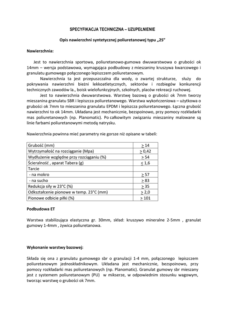 SPECYFIKACJA TECHNICZNA – UZUPEŁNIENIE Opis nawierzchni syntetycznej poliuretanowej typu „2S” Nawierzchnia: Jest to nawierzchnia sportowa, poliuretanowo-gumowa dwuwarstwowa o grubości ok 14mm – wersja podstawowa, wymagająca podbudowy z mieszaniny kruszywa kwarcowego i granulatu gumowego połączonego lepiszczem poliuretanowym. Nawierzchnia ta jest przepuszczalna dla wody, o zwartej strukturze, służy do pokrywania nawierzchni bieżni lekkoatletycznych, sektorów i rozbiegów konkurencji technicznych zawodów la., boisk wielofunkcyjnych, szkolnych, placów rekreacji ruchowej. Jest to nawierzchnia dwuwarstwowa. Warstwę bazową o grubości ok 7mm tworzy mieszanina granulatu SBR i lepiszcza poliuretanowego. Warstwa wykończeniowa – użytkowa o grubości ok 7mm to mieszanina granulatu EPDM i lepiszcza poliuretanowego. Łączna grubość nawierzchni to ok 14mm. Układana jest mechanicznie, bezspoinowo, przy pomocy rozkładarki mas poliuretanowych (np. Planomatic). Po całkowitym związaniu mieszaniny malowane są linie farbami poliuretanowymi metodą natrysku. Nawierzchnia powinna mieć parametry nie gorsze niż opisane w tabeli: Grubość (mm) Wytrzymałość na rozciąganie (Mpa) Wydłużenie względne przy rozciąganiu (%) Ścieralność , aparat Tabera (g) Tarcie - na mokro - na sucho Redukcja siły w 23°C (%) Odkształcenie pionowe w temp. 23°C (mm) Pionowe odbicie piłki (%) > 14 > 0,42 > 54 < 1,6 > 57 > 83 > 35 > 2,0 > 101 Podbudowa ET Warstwa stabilizująca elastyczna gr. 30mm, skład: kruszywo mineralne 2-5mm , granulat gumowy 1-4mm , żywica poliuretanowa. Wykonanie warstwy bazowej: Składa się ona z granulatu gumowego sbr o granulacji 1-4 mm, połączonego lepiszczem poliuretanowym jednoskładnikowym. Układana jest mechanicznie, bezspoinowo, przy pomocy rozkładarki mas poliuretanowych (np. Planomatic). Granulat gumowy sbr mieszany jest z systemem poliuretanowym (PU) w mikserze, w odpowiednim stosunku wagowym, tworząc warstwę o grubości ok 7mm. Wykonanie warstwy użytkowej: Składa się ona z granulatu gumowego epdm o granulacji 1-3.5 mm, połączonego lepiszczem poliuretanowym jednoskładnikowym. Układana jest mechanicznie, bezspoinowo, przy pomocy rozkładarki mas poliuretanowych (np. Planomatic). Granulat gumowy epdm mieszany jest z systemem poliuretanowym (PU) w mikserze, w odpowiednim stosunku wagowym, tworząc warstwę o grubości ok 7mm. Całkowita grubość systemu (nawierzchni) wynosi ok. 14-16 mm. Warunki niezbędne do prawidłowej instalacji nawierzchni: Podczas wykonywania prac , należy bezwzględnie przestrzegać aby wilgotność otoczenia oscylowała w przedziale 40-90% , a temperatura podłoża powinna być wyższa o co najmniej 3oC od panującej w danym miejscu temperatury punktu rosy. Sposób przeprowadzenia odbioru nawierzchni: • • • • • Nawierzchnia powinna mieć jednakową grubość, ok. 14 mm. Powinna posiadać jednorodną fakturę zewnętrzną oraz jednolity kolor. Nawierzchnia powinna być związana na trwałe z warstwą ET. Powstałe łączenia (wynikające z technologii instalacji) powinny być liniami prostymi, bez uskoków utrudniających późniejsze użytkowanie. Spadki poprzeczne i podłużne oraz grubości nawierzchni powinny odpowiadać wartościom określonych w przepisach IAAF i PZLA ( w przypadku stadionów la) lub innych przepisów ( w przypadku boisk, kortów itp). Wykonawca powinien przedłożyć komplet dokumentów odbiorowych dotyczących nawierzchni. Wymagane dokumenty dotyczące nawierzchni • Aktualna Aprobata lub Rekomendacja ITB lub Raport z badań przeprowadzonych przez specjalistyczne laboratorium (np. Labosport, ISA-Sport, Sports Labs Ltd lub inne) potwierdzające spełnienie stawianych wymagań oraz zgodność z normą PN-EN 14877 • Atest Higieniczny PZH dla oferowanego systemu nawierzchni sportowej • Atest Higieniczny PZH dla oferowanej warstwy stabilizacyjnej • Badania określające bezpieczeństwo ekologiczne (WWA, metale ciężkie) • Badania określające wskaźniki DOC i EOX dla oferowanego systemu nawierzchni • Karta techniczna zawierająca parametry oferowanej nawierzchni podbita przez producenta oferowanego systemu • Autoryzacja producenta nawierzchni poliuretanowej, podbita i wystawiona dla wykonawcy na realizowaną inwestycje wraz z potwierdzeniem gwarancji udzielonej przez producenta na tę nawierzchnie • Deklaracja zgodności potwierdzona przez producenta nawierzchni Sposób użytkowania i konserwacji nawierzchni OGÓLNA INSTRUKCJA UŻYTKOWANIA POLIURETANOWYCH ZEWNĘTRZNYCH NAWIERZCHNI SPORTOWYCH Nawierzchnie syntetyczne poliuretanowe są nawierzchniami sportowymi i do tego celu powinny służyć. Powinny być użytkowane w obuwiu sportowym. Nie należy dopuszczać do nadmiernego zabrudzenia nawierzchni piaskiem, który powoduje nadmierne zużycie nawierzchni. Unikać zabrudzeń olejem, emulsją asfaltową oraz innymi środkami chemicznymi powodującymi odbarwienie nawierzchni. Nie dopuszczać do jazdy na rolkach, rowerach, motorach. Przejazd samochodami (policja, straż, pogotowie ratunkowe i inne służby komunalne) powinien być kontrolowany - również ze względu na nośność podbudowy. Uwagi ogólne Wszelkie informacje zawarte w tym dokumencie są podawane w dobrej wierze i mają charakter ogólny. Jako że faktyczny stan nawierzchni sportowych jak też sposób użytkowania jest zróżnicowany i jest poza naszą kontrolą, nasze sugestie, bez względu na to czy zostały przekazane ustnie, na piśmie, nie zwalniają użytkownika od konieczności dbałości o produkt. UWAGI! - Wykładziny powinny być stosowane zgodnie z instrukcjami producenta i projektem technicznym opracowanym dla określonego zastosowania. - Projekt powinien być zgodny z właściwymi normami i obowiązującymi przepisami, w szczególności z rozporządzeniem Ministra Infrastruktury z dnia 12 kwietnia 2002r. w sprawie warunków technicznych, jakim powinny odpowiadać budynki i ich usytuowanie (Dz.U.