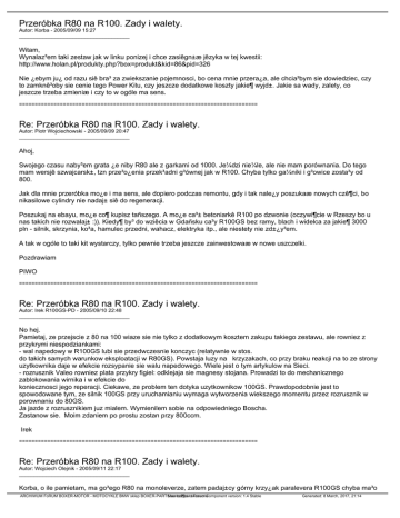 Przeróbka R80 na R100. Zady i walety. Autor: Korba - 2005/09/09 15:27 _____________________________________ Witam, Wynalaz³em taki zestaw jak w linku ponizej i chce zasiêgn±æ jêzyka w tej kwestii: http://www.holan.pl/produkty.php?box=produkt&kid=86&pid=326 Nie ¿ebym ju¿ od razu siê bra³ za zwiekszanie pojemnosci, bo cena mnie przera¿a, ale chcia³bym sie dowiedziec, czy to zamknê³oby sie cenie tego Power Kitu, czy jeszcze dodatkowe koszty jakie¶ wyjd±. Jakie sa wady, zalety, co jeszcze trzeba zmieniæ i czy to w ogóle ma sens. ============================================================================ Re: Przeróbka R80 na R100. Zady i walety. Autor: Piotr Wojciechowski - 2005/09/09 20:47 _____________________________________ Ahoj, Swojego czasu naby³em grata ¿e niby R80 ale z garkami od 1000. Je¼dzi nie¼le, ale nie mam porównania. Do tego mam wersjê szwajcarsk±, tzn prze³o¿enia przek³adni g³ównej jak w R100. Chyba tylko ga¼niki i g³owice zosta³y od 800. Jak dla mnie przeróbka mo¿e i ma sens, ale dopiero podczas remontu, gdy i tak nale¿y poszukaæ nowych czê¶ci, bo nikasilowe cylindry nie nadaj± siê do regeneracji. Poszukaj na ebayu, mo¿e co¶ kupisz tañszego. A mo¿e ca³± betoniarkê R100 po dzwonie (oczywi¶cie w Rzeszy bo u nas takich nie rozwalaj± :)). Kiedy¶ by³ do wziêcia w Gdañsku ca³y R100GS bez ramy, blach i widelca za jakie¶ 3000 pln - silnik, skrzynia, ko³a, hamulec przedni, wahacz, elektryka itp., ale niestety nie zd±¿y³em. A tak w ogóle to taki kit wystarczy, tylko pewnie trzeba jeszcze zainwestowaæ w nowe uszczelki. Pozdrawiam PIWO ============================================================================ Re: Przeróbka R80 na R100. Zady i walety. Autor: Irek R100GS-PD - 2005/09/10 22:48 _____________________________________ No hej. Pamietaj, ze przejscie z 80 na 100 wiaze sie nie tylko z dodatkowym kosztem zakupu takiego zestawu, ale rowniez z przykrymi niespodziankami: - wal napedowy w R100GS lubi sie przedwczesnie konczyc (relatywnie w stos. do takich samych warunkow eksploatacji w R80GS). Powstaja luzy na krzyzakach, co przy braku reakcji na to ze strony uzytkownika daje w efekcie rozsypanie sie walu napedowego. Wiele jest o tym artykulow na Sieci. - rozrusznik Valeo rowniez plata przykry figiel: odklejaja sie magnesy stojana. Prowadzi to do mechanicznego zablokowania wirnika i w efekcie do koniecznosci jego reperacji. Ciekawe, ze problem ten dotyka uzytkownikow 100GS. Prawdopodobnie jest to spowodowane tym, ze silnik 100GS przy uruchamianiu wymaga wytworzenia wiekszego momentu przez rozrusznik w porownaniu do 80GS. Ja jazde z rozrusznikiem juz mialem. Wymienilem sobie na odpowiedniego Boscha. Zastanow sie. Moim zdaniem po prostu zostan przy 800ccm. Irek ============================================================================ Re: Przeróbka R80 na R100. Zady i walety. Autor: Wojciech Olejnik - 2005/09/11 22:17 _____________________________________ Korba, o ile pamietam, ma go³ego R80 na monoleverze, zatem padaj±cy górny krzy¿ak paralevera R100GS chyba ma³o ARCHIWUM FoRUM BOXER-MOTOR - MOTOCYKLE BMW sklep BOXER-PARTS.eu MamboBoard czê¶ci i akcesoria Forum Component version: 1.4 Stable Generated: 8 March, 2017, 21:14 go interesuje. pozdr. WO ============================================================================ Re: Przeróbka R80 na R100. Zady i walety. Autor: Korba - 2005/09/12 09:07 _____________________________________ Dziêki za odpowiedzi. Tak jak napisa³em, pyta³em o to tylko z ciekawo¶ci, bo mój silnik jeszcze do remontu trochê czasu pohula mam nadziejê, choæ trochê wiêcej mocy i momentu mieæ, by³oby mi³o niew±tpliwie. Tak jak napisa³ WO mam go³± R80 która kiedy¶ by³a RT, a czy ten Power Kit jest tylko do GSa?? Bo mi siê wydaje ¿e do ka¿dego 2V 800ccm mo¿na to wsadziæ, ale mogê siê przecie¿ myliæ. ============================================================================ Re: Przeróbka R80 na R100. Zady i walety. Autor: Irek R100GS-PD - 2005/09/12 15:47 _____________________________________ Tytulem sprostowania: piszac o problemach dotyczacych rozrusznika i walu napedowego powolalem sie na informacje dostepne na Necie od uzytkownikow motocykli GS. Prawdopodobnie sa one prawdziwe dla inych wcielen R100 z Paraleverem oraz rozrusznikiem Valeo na pokladzie. Kit jest serwowalny oczywiscie nie tylko do GS. Oto co na ten temat mowi Wudo: http://www.wuedo.de/english/news2v.htm ============================================================================ ARCHIWUM FoRUM BOXER-MOTOR - MOTOCYKLE BMW sklep BOXER-PARTS.eu MamboBoard czê¶ci i akcesoria Forum Component version: 1.4 Stable Generated: 8 March, 2017, 21:14