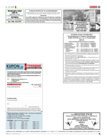 Nr 38 (1584) 21 Atrakcyjny lokal 150 m2 Zarząd Powiatu w Sandomierzu działając zgodnie z art. 35 ust. 1 ustawy z dnia 21 sierpnia 1997 roku o gospodarce nieruchomościami (Dz.U. z 2010 r. nr 102, poz. 651 z późn. zm.) pod bank, sklep i 2 pomieszczenia biurowe informuje wynajmę że na tablicy ogłoszeń w siedzibie Starostwa Powiatowego w Sandomierzu przy ul. Mickiewicza 34 (drugie piętro) w dniu 14 września 2011 roku został wywieszony wykaz nieruchomości stanowiącej własność Powiatu Sandomierskiego, położonej w Samborcu, oznaczonej działką nr 422/2, przeznaczonej do sprzedaży. przy placu targowym, Biedronce w Tarnobrzegu tel. 500 110 974 Syndyk masy upadłości Przedsiębiorstwa Usługowo-Handlowego NORA STONE sp. z o.o. w Nowej Dębie ogłasza ustny przetarg nieograniczony na sprzedaż: 1. Komin stalowy szt. 1 cena wywoławcza – 10.500,00 zł 2. Wycinarka linowa szt. 1 cena wywoławcza – 4.900,00 zł 3. Dehydrylator szt. 1 cena wywoławcza – 980,00 zł 4. Zestaw komputerowy szt. 1 cena wywoławcza – 150,00 zł 5. Wyposażenie biura: – biurka szt. 3 cena wywoławcza za 1 szt. – 50,00 zł – szafy biurowe szt. 3 cena wywoławcza za 1 szt. – 50,00 zł – krzesła szt. 4 cena wywoławcza za 1 szt. – 20,00 zł Do zaoferowanych cen sprzedaży doliczony będzie należny podatek VAT w wysokości i na zasadach określonych w odrębnych przepisach. Warunki uczestnictwa w przetargu: 1. Przetarg odbędzie się w dniu 06.10.2011 r. w Nowej Dębie przy ul. Szypowskiego 1 o godz. 10. 2. Warunkiem przystąpienia do przetargu jest wpłacenie wadium w wysokości 10% ceny wywoławczej w siedzibie upadłego, najpóźniej w dniu przetargu do godz. 9 lub na konto masy upadłości w Banku Spółdzielczym w Stalowej Woli nr 93 9430 0006 0037 3218 2000 0001. 3. Wadium przepada, jeśli żaden z uczestników przetargu nie zaoferuje ceny równej cenie wywoławczej. 4. Wadium uczestników przetargu, których oferty nie zostały przyjęte, zostanie zwrócone bezpośrednio po zakończeniu przetargu. 5. Wadium oferenta, którego oferta została przyjęta, zostanie zaliczone na poczet ceny zakupu. 6. Odstąpienie nabywcy wyłonionego w drodze przetargu od zawarcia umowy w terminie wyznaczonym przez syndyka skutkuje utratą wadium. Szczegółowych informacji dotyczących poszczególnych składników majątkowych oraz dodatkowych warunków związanych z ich zakupem zainteresowani mogą zasięgnąć w siedzibie upadłego przy ul. Szypowskiego 1 w Nowej Dębie lub biurze syndyka w Stalowej Woli przy al. Jana Pawła II 25, pokój 217. Telefon kontaktowy – 661 116 426. KUPON na ogłoszenie drobne Treść ogłoszenia należy napisać drukowanymi literami na kuponie. Kupon przesłać na podany niżej adres wraz z dowodem wpłaty. Kupony bez dołączonego dowodu wpłaty nie będą uwzględniane. Ogłoszenie ukaże się w najbliższym numerze Tygodnika Nadwiślańskiego (licząc od dnia nadejścia kuponu do redakcji). Adres: Wydawnictwo Samorządowe sp. z o.o. 39-400 Tarnobrzeg ul. 1 Maja 4a BS O/Tarnobrzeg 66 9434 0002 2001 1000 0818 0001 1 słowo – 1,21 zł (w tym VAT 23%) liczba emisji ...................... razy Prosimy o czytelne wpisanie treści: . . ...................................................................................................................... . . . . . . . . . . . . . . . . . . . . . . . . . . . . . . . . . . . . . . . . . . . . . . . . . . . . . . ...................................................................................................................... . . . . . . . . . . . . . . . . . . . . . . . . . . . . . . . . . . . . . . . . . . . . . . . . . . . . . . ...................................................................................................................... . . . . . . . . . . . . . . . . . . . . . . . . . . . . . . . . . . . . . . . . . . . . . . . . . . . . . . ...................................................................................................................... . . . . . . . . . . . . . . . . . . . . . . . . . . . . . . . . . . . . . . . . . . . . . . . . . . . . . . ...................................................................................................................... . . . . . . . . . . . . . . . . . . . . . . . . . . . . . . . . . . . . . . . . . . . . . . . . . . . . Do wiadomości redakcji: Imię i nazwisko zamawiającego .................................................................... . . . . . . . . . . . . . . . . . . . . . . . . . . . . . . . . . . . . . . . . . . . . . . . . . . . . . . ...................................................................................................................... . . . . . . . . . . . . . . . . . . . . . . . . . . . . . . . . . . . . . . . . . . . . . . . . . . . . Adres: ............................................................................................................. . . . . . . . . . . . . . . . . . . . . . . . . . . . . . . . . . . . . . . . . . . . . . . . . . . . . . . ........................................................................................ NIP ...................... . . . . . . . . . . . . . . . . . . . . . . . . . . . . . . . . . . . . . . . . . . . . . . . . . . . . (tylko do wystawienia faktury VAT) Uwaga: przyjmujemy ogłoszenie tylko na oryginalnym kuponie wyciętym z Tygodnika Nadwiślańskiego. Upoważniamy was do wystawienia faktury VAT bez podpisu odbiorcy. Oryginał faktury VAT za ogłoszenie kuponowe można odebrać w siedzibie Redakcji (Biuro reklamy i Ogłoszeń, p. 3, Tarnobrzeg, ul. 1 Maja 4a) Podajemy sposób liczenia: MIESZKANIE 60 mkw. w Tarnobrzegu, ul. Wyspiańskiego – sprzedam. Telefon 41 892 42 33, wieczorem. Tj. 11 słów, czyli 11 x 1,21 = 13,31 zł do zapłaty za 1 emisję. Jeśli ogłoszenie ma się ukazać np. 2 razy, to mnożymy 13,31 zł x 2 = 26,62 zł (do zapłaty za 2 emisje). SuperŚciĄga – podajemy informacje, ile należy zapłacić 1 słowo = 2 słowa = 3 słowa = 4 s