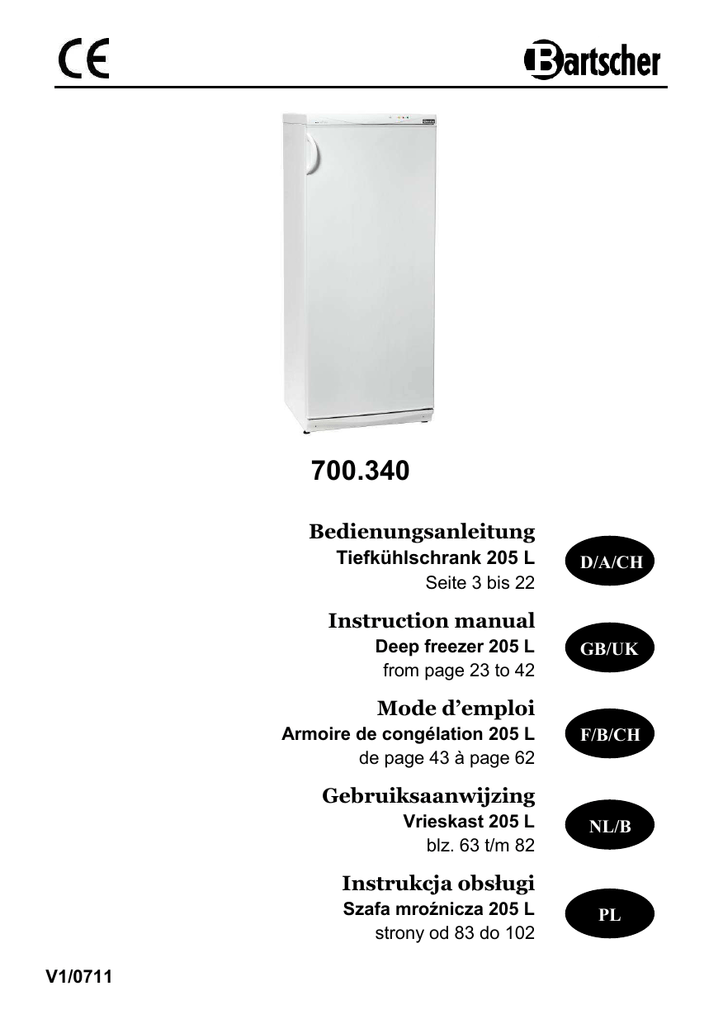 700.340 Bedienungsanleitung Tiefkühlschrank 205 L Seite 3 bis 22 D/A/CH Instruction manual Deep freezer 205 L from page 23 to 42 GB/UK Mode d’emploi Armoire de congélation 205 L de page 43 à page 62 F/B/CH Gebruiksaanwijzing Vrieskast 205 L blz. 63 t/m 82 NL/B Instrukcja obsługi Szafa mroźnicza 205 L strony od 83 do 102 V1/0711 PL -1- PL Instrukcja obsługi powinna być zawsze pod ręką! 1. Informacje ogólne 1.1 Informacje dotyczące instrukcji obsługi 1.2 Wyjaśnienie symboli 1.3 Odpowiedzialność producenta i gwarancja 1.4 Ochrona praw autorskich 1.5 Deklaracja Zgodności 84 84 84 85 85 85 2. Bezpieczeństwo 2.1 Informacje ogólne 2.2 Wskazówki dotyczące bezpieczeństwa przy zastosowaniach urządzenia 2.3 Użytkowanie zgodnie z przeznaczeniem 86 86 86-87 87 3. Transport, opakowanie i magazynowanie 3.1 Kontrola dostawy 3.2 Opakowanie 3.3 Magazynowanie 88 88 88 88 4. Parametry techniczne 4.1 Zestawienie podzespołów urządzenia 4.2 Dane techniczne 89 89-90 91 5. Instalacja i obsługa urządzenia 5.1 Wskazówki dotyczące bezpieczeństwa 5.2 Ustawienie i podłączenie urządzenia 5.3 Obsługa 91 91-92 92-94 95-98 6. Czyszczenie i konserwacja 6.1 Wskazówki dotyczące bezpieczeństwa 6.2 Czyszczenie 6.3 Wskazówki dotyczące bezpieczeństwa podczas konserwacji 7. Możliwe usterki 99 99 99-100 100 100-101 8. Utylizacja Bartscher GmbH Franz-Kleine-Straße 28 D-33154 Salzkotten Niemcy 102 Tel.: +49 (0) 5258 971-0 Faks: +49 (0) 5258 971-120 - 83 - 1. Informacje ogólne 1.1 Informacje dotyczące instrukcji obsługi Niniejsza instrukcja obsługi zawiera opis instalacji urządzenia, jego obsługi oraz konserwacji i służy jako ważne źródło informacji oraz poradnik. Znajomość i przestrzeganie wszystkich zawartych w niej wskazówek dotyczących bezpieczeństwa i obsługi stanowi warunek bezpiecznej i prawidłowej pracy z urządzeniem. Ponadto należy przestrzegać lokalnych przepisów dotyczących zapobiegania wypadkom oraz zasad BHP. Instrukcja obsługi stanowi integralny element urządzenia i należy ją przechowywać w pobliżu urządzenia, aby osoby instalujące urządzenie, prowadzące prace konserwacyjne i obsługujące lub czyszczące urządzenie miały do niej stały dostęp. 1.2 Wyjaśnienie symboli Ważne wskazówki dotyczące bezpieczeństwa oraz kwestii technicznych oznaczono w niniejszej instrukcji obsługi odpowiednimi symbolami. Wskazówek tych należy bezwzględnie przestrzegać, aby uniknąć ewentualnych wypadków, uszczerbku na życiu i zdrowiu osób oraz szkód rzeczowych. UWAGA! Symbol ten oznacza zagrożenia mogące prowadzić do powstania obrażeń ciała. Należy bezwzględnie i skrupulatnie przestrzegać niniejszych wskazówek BHP, a w odpowiednich sytuacjach zachować szczególną ostrożność. NIEBEZPIECZEŃSTWO! Zagrożenie prądem elektrycznym! Symbol ten zwraca uwagę na zagrożenia prądem elektrycznym. Ignorowanie wskazówek dotyczących bezpieczeństwa stwarza niebezpieczeństwo odniesienia obrażeń ciała lub utraty życia. OSTRZEŻENIE! Tym symbolem oznaczono wskazówki, których ignorowanie może, w konsekwencji, doprowadzić do uszkodzenia urządzenia, jego nieprawidłowego działania lub / i awarii. WSKAZÓWKA! Ten symbol wskazuje na porady oraz informacje istotne dla efektywnej i bezawaryjnej pracy urządzenia. - 84 - 1.3 Odpowiedzialność producenta i gwarancja Wszystkie informacje zawarte w niniejszej instrukcji obsługi zostały zestawione przy uwzględnieniu obowiązujących przepisów, aktualnej wiedzy konstruktorskiej i inżynierskiej oraz naszej wiedzy, a także naszych wieloletnich doświadczeń. Również tłumaczenia instrukcji obsługi zostały wykonane jak najbardziej rzetelnie. Nie możemy jednak przejąć odpowiedzialności za ewentualne błędy w tłumaczeniu. Wersją rozstrzygającą jest załączona instrukcja obsługi w języku niemieckim. W przypadku zamówienia modeli specjalnych lub opcji dodatkowych, oraz w sytuacji zastosowania najnowszych zdobyczy wiedzy technicznej, dostarczone urządzenie może różnić się od objaśnień oraz rysunków zawartych w niniejszej instrukcji obsługi. W razie wątpliwości prosimy o kontakt z producentem. WSKAZÓWKA! Przed rozpoczęciem jakichkolwiek prac, a w szczególności przed uruchomieniem urządzenia, należy dokładnie zapoznać się z treścią niniejszej instrukcji obsługi. Producent nie odpowiada za szkody i uszkodzenia powstałe wskutek nieprzestrzegania informacji zawartych w instrukcji obsługi. Instrukcję obsługi należy przechowywać bezpośrednio przy urządzeniu; ponadto musi być ona dostępna dla wszystkich osób pracujących z urządzeniem. Zastrzegamy sobie prawo do wprowadzania zmian technicznych w produkcie, służących poprawie właściwości użytkowych urządzenia oraz jego ulepszaniu. 1.4 Ochrona praw autorskich Niniejsza instrukcja obsługi oraz zawarte w niej teksty, rysunki, zdjęcia i inne elementy podlegają ochronie prawem autorskim. Bez uzyskania pisemnej zgody producenta, zabrania się powielania treści instrukcji obsługi w jakiejkolwiek formie i w jakikolwiek sposób (także fragmentów), oraz wykorzystywania lub / i przekazywania jej zawartości osobom trzecim. Naruszenia powyższego skutkują obowiązkiem wypłaty odszkodowania. Zastrzegamy sobie prawo do dochodzenia dalszych roszczeń. WSKAZÓWKA! Dane, teksty, rysunki, zdjęcia i inne opisy zawarte w niniejszej instrukcji, podlegają ochronie prawem autorskim oraz prawem ochrony własności przemysłowej. Każde nadużycie w jej wykorzystaniu jest karalne. 1.5 Deklaracja Zgodności Urządzenie spełnia aktualnie obowiązujące normy oraz wytyczne Unii Europejskiej. Powyższe potwierdzamy w Deklaracji Zgodności WE. W razie potrzeby chętnie prześlemy Państwu odpowiednią Deklarację Zgodności. - 85 - 2. Bezpieczeństwo Niniejszy rozdział zawiera zarys informacji, dotyczących wszystkich istotnych aspektów związanych z bezpieczeństwem. Ponadto poszczególne rozdziały zawierają