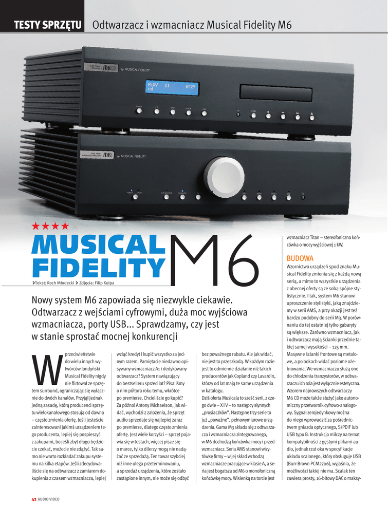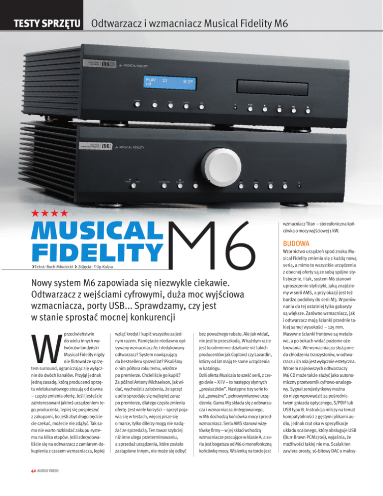 TESTY SPRZĘTU Odtwarzacz i wzmacniacz Musical Fidelity M6 M6 MUSICAL FIDELITY Tekst: Roch Młodecki Zdjęcia: Filip Kulpa Nowy system M6 zapowiada się niezwykle ciekawie. Odtwarzacz z wejściami cyfrowymi, duża moc wyjściowa wzmacniacza, porty USB... Sprawdzamy, czy jest w stanie sprostać mocnej konkurencji przeciwieństwie do wielu innych wytwórców londyński Musical Fidelity nigdy nie flirtował ze sprzętem surround, ograniczając się wyłącznie do dwóch kanałów. Przyjął jednak jedną zasadę, którą producenci sprzętu wielokanałowego stosują od dawna – często zmienia ofertę. Jeśli jesteście zainteresowani jakimś urządzeniem tego producenta, lepiej się pospieszyć z zakupami, bo jeśli zbyt długo będziecie czekać, możecie nie zdążyć. Tak samo nie warto rozkładać zakupu systemu na kilka etapów. Jeśli zdecydowaliście się na odtwarzacz z zamiarem dokupienia z czasem wzmacniacza, lepiej W 42 AUDIO VIDEO wziąć kredyt i kupić wszystko za jednym razem. Pamiętacie niedawno opisywany wzmacniacz A1 i dedykowany odtwarzacz? System nawiązujący do bestselleru sprzed lat? Pisaliśmy o nim półtora roku temu, wkrótce po premierze. Chcieliście go kupić? Za późno! Antony Michaelson, jak widać, wychodzi z założenia, że sprzęt audio sprzedaje się najlepiej zaraz po premierze, dlatego często zmienia ofertę. Jest wiele korzyści – sprzęt pojawia się w testach, więcej pisze się o marce, tylko dilerzy mogą nie nadążać ze sprzedażą. Ten towar szybciej niż inne ulega przeterminowaniu, a sprzedaż urządzenia, które zostało zastąpione innym, nie może się odbyć bez poważnego rabatu. Ale jak widać, nie jest to przeszkodą. W każdym razie jest to odmienne działanie niż takich producentów jak Copland czy Lavardin, którzy od lat mają te same urządzenia w katalogu. Dziś oferta Musicala to sześć serii, z czego dwie – X i V – to następcy słynnych „prosiaczków”. Następne trzy serie to już „poważne”, pełnowymiarowe urządzenia. Gama M3 składa się z odtwarzacza i wzmacniacza zintegrowanego, w M6 dochodzą końcówka mocy i przedwzmacniacz. Seria AMS stanowi wizytówkę firmy – w jej skład wchodzą wzmacniacze pracujące w klasie A, a seria jest bogatsza od M6 o monofoniczną końcówkę mocy. Wisienką na torcie jest wzmacniacz Titan – stereofoniczna końcówka o mocy wyjściowej 1 kW. BUDOWA Wzornictwo urządzeń spod znaku Musical Fidelity zmienia się z każdą nową serią, a mimo to wszystkie urządzenia z obecnej oferty są ze sobą spójne stylistycznie. I tak, system M6 stanowi uproszczenie stylistyki, jaką znajdziemy w serii AMS, a przy okazji jest też bardzo podobny do serii M3. W porównaniu do tej ostatniej tylko gabaryty są większe. Zarówno wzmacniacz, jak i odtwarzacz mają ścianki przednie takiej samej wysokości – 125 mm. Masywne ścianki frontowe są metalowe, a po bokach widać poziome ożebrowania. We wzmacniaczu służą one do chłodzenia tranzystorów, w odtwarzaczu ich rola jest wyłącznie estetyczna. Wzorem najnowszych odtwarzaczy M6 CD może także służyć jako autonomiczny przetwornik cyfrowo-analogowy. Sygnał zerojedynkowy można do niego wprowadzić za pośrednictwem gniazda optycznego, S/PDIF lub USB typu B. Instrukcja milczy na temat kompatybilności z gęstymi plikami audio, jednak rzut oka w specyfikacje układu scalonego, który obsługuje USB (Burr-Brown PCM2706), wyjaśnia, że możliwości takiej nie ma. Scalak ten zawiera prosty, 16-bitowy DAC o maksy- malnej częstotliwości próbkowania 48 kHz. Po podłączeniu do peceta lub maca komputer sam wykryje nowe urządzenie i posłuży się domyślnym oprogramowaniem do odtwarzania plików muzycznych. Mowa jedynie o plikach WAV i MP3. Czy to nie za mało? Na pewno przetwornik z odtwarzacza Musicala będzie lepszy, niż gdyby wyprowadzać sygnał z komputera w postaci analogowej, ale brzmienie plików skomprymowanych nigdy przecież nie dorówna brzmieniu płyt CD, nie mówiąc o FLAC-ach w wysokiej rozdzielczości. Wybór źródła cyfrowego dokonamy jednym z przycisków pod błękitnym wyświetlaczem. Ten, podobnie jak w innych urządzeniach Musicala, jest błękitny, mało czytelny z większej odległości, więc najlepiej go wyłączyć. Z tyłu znalazły się wspomniane wejścia cyfrowe, ale też wyjścia (optyczne i S/PDIF) i dwie pary wyjść analogowych (RCA i XLR). Żeby zamieszanie było jeszcze większe, wzmacniacz też dysponuje wejściem USB. Podobnie w odtwarzaczu zostało umieszczone na tylnej ściance. Jeśli bardzo nam zależy na podłączeniu komputera, lepiej podłączyć go wprost do wzmacniacza. Dlaczego? Obróbka sygnału w obu urządzeniach identyczna – także w integrze zastosowano Burr-Browna PCM2706. Wygląd wzmacniacza jest dosyć klasyczny – pokrętło ustawiające siłę głosu jest na tyle duże, że pozwala na bardzo precyzyjne regulacje. Wyboru źródła dokonamy jednym z przycisków, co zostanie potwierdzone zapaleniem się błękitnej diody. Cztery wejścia za pośrednictwem gniazd RCA zostały uzupełnione o wejście z XLR (sygnał z niego jest kawałek dalej desymetryzowany – połączenie to nie ma zatem większego sensu), wspomniane wejście USB, pętlę magnetofonową i wyjście pre-out. Jedno z wejść liniowych można przekształcić w bezpośredni dostęp do końcówki mocy – w tym celu należy przestawić suwak na tylnej ściance z pozycji „Aux” na „HT”. Gniazda słuchawkowego nie przewidziano ani w odtwarzaczu, ani we wzmacniaczu – amatorzy nauszników będą musieli kupić dedykowany słuchawkom wzmacniacz z serii X lub V. Pojedyncze wyjścia głośnikowe wyglądają przeciętnie. Gdy stosujemy widełki, warto mocno je dokręcić, żeby uniknąć ryzyka spięcia. Najbezpieczniej skorzystać z końcówek bananowych. Zasilacz wzmacniacza przejęto z poprzednika A5.5 Za obsługę wejścia USB odpowiada uniwersalny scalak PCM2706. Do empetrójek starczy Jed