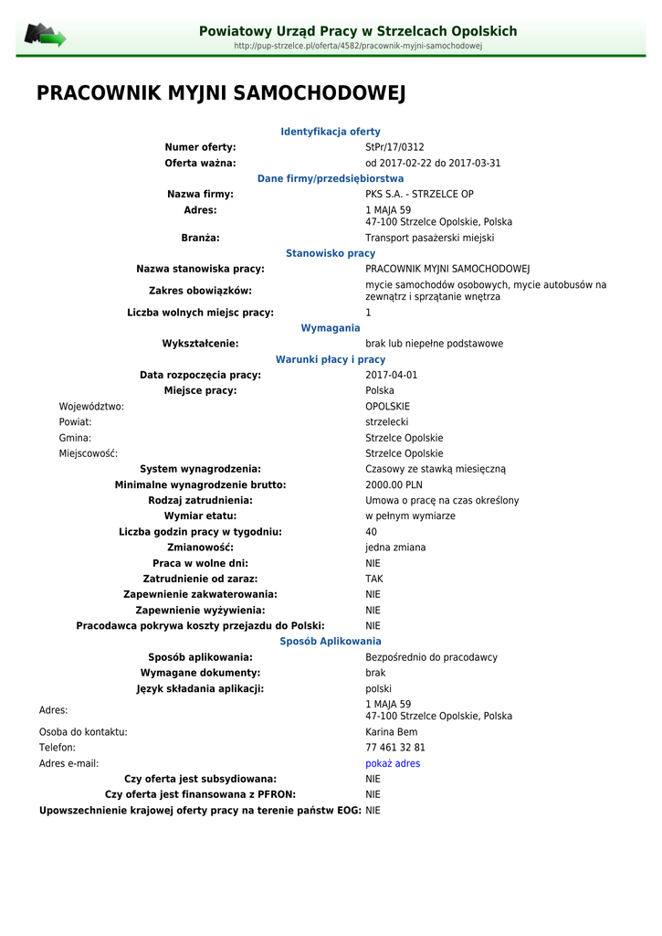 Powiatowy Urząd Pracy w Strzelcach Opolskich http://pup-strzelce.pl/oferta/4582/pracownik-myjni-samochodowej PRACOWNIK MYJNI SAMOCHODOWEJ Identyfikacja oferty Numer oferty: StPr/17/0312 Oferta ważna: od 2017-02-22 do 2017-03-31 Dane firmy/przedsiębiorstwa Nazwa firmy: PKS S.A. - STRZELCE OP Adres: 1 MAJA 59 47-100 Strzelce Opolskie, Polska Branża: Transport pasażerski miejski Stanowisko pracy Nazwa stanowiska pracy: PRACOWNIK MYJNI SAMOCHODOWEJ mycie samochodów osobowych, mycie autobusów na zewnątrz i sprzątanie wnętrza Zakres obowiązków: Liczba wolnych miejsc pracy: 1 Wymagania Wykształcenie: brak lub niepełne podstawowe Warunki płacy i pracy Data rozpoczęcia pracy: 2017-04-01 Miejsce pracy: Polska Województwo: OPOLSKIE Powiat: strzelecki Gmina: Strzelce Opolskie Miejscowość: Strzelce Opolskie System wynagrodzenia: Czasowy ze stawką miesięczną Minimalne wynagrodzenie brutto: Rodzaj zatrudnienia: 2000.00 PLN Umowa o pracę na czas określony Wymiar etatu: w pełnym wymiarze Liczba godzin pracy w tygodniu: Zmianowość: 40 jedna zmiana Praca w wolne dni: NIE Zatrudnienie od zaraz: TAK Zapewnienie zakwaterowania: NIE Zapewnienie wyżywienia: NIE Pracodawca pokrywa koszty przejazdu do Polski: NIE Sposób Aplikowania Sposób aplikowania: Bezpośrednio do pracodawcy Wymagane dokumenty: brak Język składania aplikacji: polski Adres: 1 MAJA 59 47-100 Strzelce Opolskie, Polska Osoba do kontaktu: Karina Bem Telefon: 77 461 32 81 Adres e-mail: pokaż adres Czy oferta jest subsydiowana: NIE Czy oferta jest finansowana z PFRON: NIE Upowszechnienie krajowej oferty pracy na terenie państw EOG: NIE
