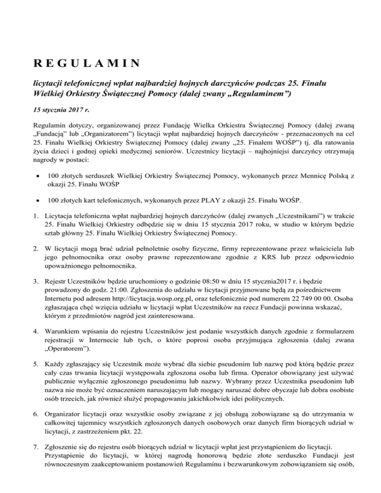 REGULAMIN licytacji telefonicznej wpłat najbardziej hojnych darczyńców podczas 25. Finału Wielkiej Orkiestry Świątecznej Pomocy (dalej zwany „Regulaminem”) 15 stycznia 2017 r. Regulamin dotyczy, organizowanej przez Fundację Wielka Orkiestra Świątecznej Pomocy (dalej zwaną „Fundacją” lub „Organizatorem”) licytacji wpłat najbardziej hojnych darczyńców - przeznaczonych na cel 25. Finału Wielkiej Orkiestry Świątecznej Pomocy (dalej zwany „25. Finałem WOŚP”) tj. dla ratowania życia dzieci i godnej opieki medycznej seniorów. Uczestnicy licytacji – najhojniejsi darczyńcy otrzymają nagrody w postaci: 100 złotych serduszek Wielkiej Orkiestry Świątecznej Pomocy, wykonanych przez Mennicę Polską z okazji 25. Finału WOŚP 100 złotych kart telefonicznych, wykonanych przez PLAY z okazji 25. Finału WOŚP. 1. Licytacja telefoniczna wpłat najbardziej hojnych darczyńców (dalej zwanych „Uczestnikami”) w trakcie 25. Finału Wielkiej Orkiestry odbędzie się w dniu 15 stycznia 2017 roku, w studio w którym będzie sztab główny 25. Finału Wielkiej Orkiestry Świątecznej Pomocy. 2. W licytacji mogą brać udział pełnoletnie osoby fizyczne, firmy reprezentowane przez właściciela lub jego pełnomocnika oraz osoby prawne reprezentowane zgodnie z KRS lub przez odpowiednio upoważnionego pełnomocnika. 3. Rejestr Uczestników będzie uruchomiony o godzinie 08:50 w dniu 15 stycznia2017 r. i będzie prowadzony do godz. 21:00. Zgłoszenia do udziału w licytacji przyjmowane będą za pośrednictwem Internetu pod adresem http://licytacja.wosp.org.pl, oraz telefonicznie pod numerem 22 749 00 00. Osoba zgłaszająca chęć wzięcia udziału w licytacji wpłat Uczestników na rzecz Fundacji powinna wskazać, którym z przedmiotów nagród jest zainteresowana. 4. Warunkiem wpisania do rejestru Uczestników jest podanie wszystkich danych zgodnie z formularzem rejestracji w Internecie lub tych, o które poprosi osoba przyjmująca zgłoszenia (dalej zwana „Operatorem”). 5. Każdy zgłaszający się Uczestnik może wybrać dla siebie pseudonim lub nazwę pod którą będzie przez cały czas trwania licytacji występowała zgłoszona osoba lub firma. Operator obowiązany jest używać publicznie wyłącznie zgłoszonego pseudonimu lub nazwy. Wybrany przez Uczestnika pseudonim lub nazwa nie może być oznaczeniem naruszającym lub mogący naruszać dobre obyczaje lub dobra osobiste osób trzecich, jak również służyć propagowaniu jakichkolwiek idei politycznych. 6. Organizator licytacji oraz wszystkie osoby związane z jej obsługą zobowiązane są do utrzymania w całkowitej tajemnicy wszystkich zgłoszonych danych osobowych oraz danych firm biorących udział w licytacji, z zastrzeżeniem pkt. 22. 7. Zgłoszenie się do rejestru osób biorących udział w licytacji wpłat jest przystąpieniem do licytacji. Przystąpienie do licytacji, w której nagrodą honorową będzie złote serduszko Fundacji jest równoczesnym zaakceptowaniem postanowień Regulaminu i bezwarunkowym zobowiązaniem się osób, które pod względem wysokości zgłoszonych wpłat, zajęły pierwszych 100 miejsc - do wpłacenia pełnej zgłoszonej w czasie licytacji kwoty. Przystąpienie do licytacji, w której nagrodą honorową będzie złota karta telefoniczna jest równoczesnym zaakceptowaniem postanowień Regulaminu i bezwarunkowym zobowiązaniem się osób, które pod względem wysokości zgłoszonych wpłat, zajęły pierwszych 100 miejsc - do wpłacenia pełnej zgłoszonej w czasie licytacji kwoty. 8. Deklarowane wpłaty Uczestników na rzecz Fundacji zgłaszamy za pośrednictwem Internetu lub telefonicznie, pod specjalnie uruchomionym w dniu 25. Finału WOŚP numerem telefonu 227490000. 9. Każdy Uczestnik zobowiązany jest podać swój adres stałego zameldowania, adres do korespondencji (na który wysyłane będą wszystkie pisemne informacje związane z licytacją) a także stacjonarny (w miarę możliwości) lub komórkowy kontakt telefoniczny i adres e-mail, oraz dodatkowo, na prośbę Operatora, miejsce pobytu, w którym będzie osiągalny w dniu licytacji. Wszystkie adresy powinny zawierać kod pocztowy. 10. Uczestnik deklarujący w licytacji wpłatę na rzecz Fundacji kwoty 10 000 PLN lub większej, zobowiązany jest do udostępnienia – na prośbę Operatora - numeru swojej karty kredytowej. Operator jest również uprawniony do zażądania dokonania przez Uczestnika weryfikacji przy pomocy systemu Payeezy, która skutkuje wpłatą 10 zł na konto Fundacji. Uczestnik wyraża zgodę by w przypadku braku odmiennego oświadczenia kwota ta stanowiła darowiznę na rzecz Fundacji. 11. Główna część licytacji zamknięta zostanie o godzinie 21:00, od tej godziny operatorzy zaprzestają przyjmowania zgłoszeń uczestniczenia w licytacji wpłat Uczestników. O godzinie 21:30 zamknięta zostanie możliwość podwyższania kwot. Organizator zastrzega, iż do czasu ostatecznej weryfikacji wszystkich zadeklarowanych wpłat miejsca Uczestników na liście mogą ulec zmianie (tj. także po zamknięciu możliwości podwyższania deklarowanych wpłat). 12. Około godziny 22:30 rozpocznie się transmitowana na żywo w TV „finałowa licytacja wpłat najbardziej hojnych darczyńców” o zajęcie pierwszych trzech miejsc pod względem wysokości wpłat zgłaszanych w darze Fundacji. Do udziału w tej licytacji będzie zaproszonych trzech Uczestników, którzy w licytacji zamkniętej o godzinie 21:30 (patrz pkt. 11) zajmą pierwsze trzy miejsca pod względem wysokości zgłoszonych w darze wpłat, za które przewidziana jest nagroda w postaci 3 złotych serduszek oraz pierwsze trzy miejsca pod względem wysokości zgłoszonych w darze wpłat, za które przewidziana jest nagroda w postaci 3 złotych kart telefonicznych. W przypadku, gdyby którykolwiek z Uczestników zaproszonych do udziału w „finałowej licytacji wpłat najbardziej hojnych darczyńców” nie wyraził zgody na udzia
