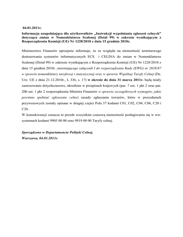 04.01.2011r. Informacja uzupełniająca dla uŜytkowników „Instrukcji wypełniania zgłoszeń celnych” dotycząca zmian w Nomenklaturze Scalonej (Dział 99) w zakresie wynikającym z Rozporządzenia Komisji (UE) Nr 1228/2010 z dnia 15 grudnia 2010r. Ministerstwo Finansów uprzejmie informuje, Ŝe ze względu na niemoŜność terminowego dostosowania systemów informatycznych ECS i CELINA do zmian w Nomenklaturze Scalonej (Dział 99) w zakresie wynikającym z Rozporządzenia Komisji (UE) Nr 1228/2010 z dnia 15 grudnia 2010r. zmieniającego załącznik I do rozporządzenia Rady (EWG) nr 2658/87 w sprawie nomenklatury taryfowej i statystycznej oraz w sprawie Wspólnej Taryfy Celnej (Dz. Urz. UE z dnia 21.12.2010r., L 336, s. 17) w okresie do dnia 31 marca 2011r. będą miały zastosowanie dotychczasowe, określone w przepisach krajowych (par. 7 ust. 1 pkt 2 oraz par. 20b ust. 1 pkt 2 rozporządzenia Ministra Finansów w sprawie szczegółowych wymogów, jakie powinno spełniać zgłoszenie celne) zasady zgłaszania towarów, które w procedurach przywozowych zostały opisane w drugiej części Pola 37 kodami C01, C02, C04, C06, C20 i C26. W konsekwencji oznacza to przede wszystkim czasową niemoŜność posługiwania się w ww. systemach kodami 9905 00 00 oraz 9919 00 00 Taryfy celnej. Sporządzono w Departamencie Polityki Celnej, Warszawa, 04.01.2011r.
