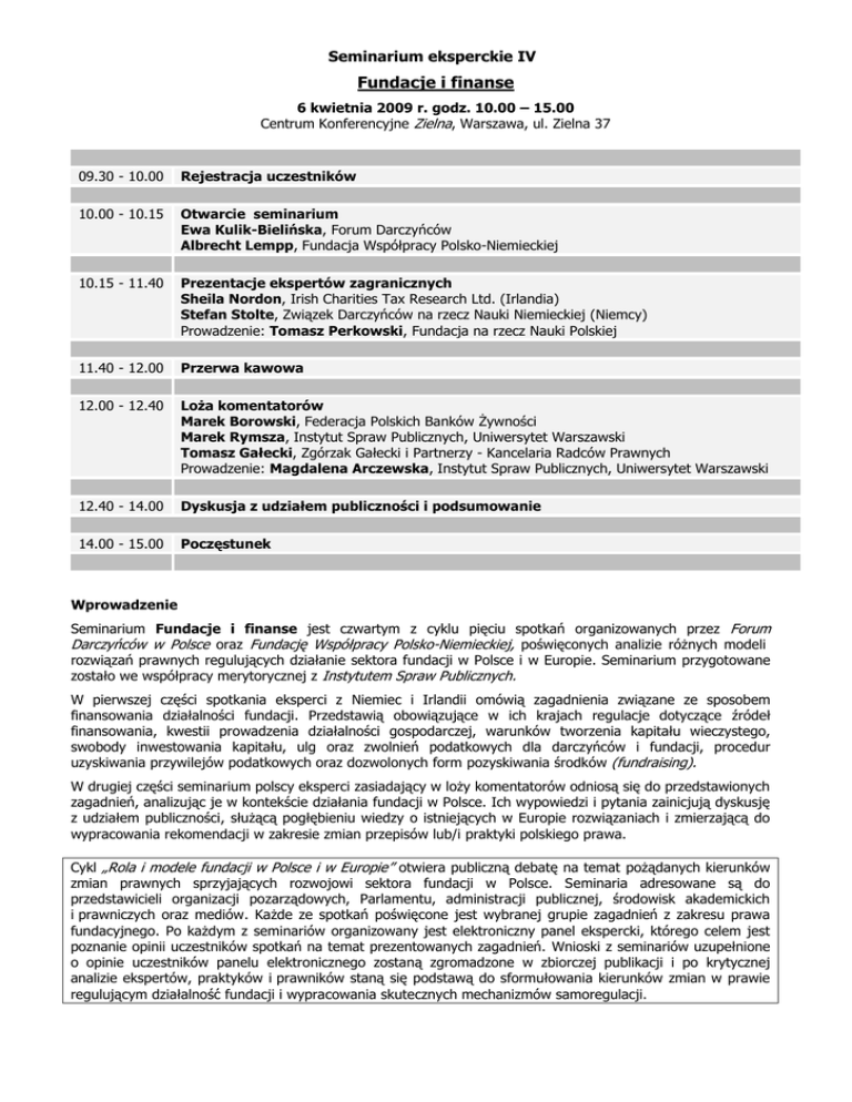 Seminarium eksperckie IV Fundacje i finanse 6 kwietnia 2009 r. godz. 10.00 – 15.00 Centrum Konferencyjne Zielna, Warszawa, ul. Zielna 37 09.30 - 10.00 Rejestracja uczestników 10.00 - 10.15 Otwarcie seminarium Ewa Kulik-Bielińska, Forum Darczyńców Albrecht Lempp, Fundacja Współpracy Polsko-Niemieckiej 10.15 - 11.40 Prezentacje ekspertów zagranicznych Sheila Nordon, Irish Charities Tax Research Ltd. (Irlandia) Stefan Stolte, Związek Darczyńców na rzecz Nauki Niemieckiej (Niemcy) Prowadzenie: Tomasz Perkowski, Fundacja na rzecz Nauki Polskiej 11.40 - 12.00 Przerwa kawowa 12.00 - 12.40 Loża komentatorów Marek Borowski, Federacja Polskich Banków Żywności Marek Rymsza, Instytut Spraw Publicznych, Uniwersytet Warszawski Tomasz Gałecki, Zgórzak Gałecki i Partnerzy - Kancelaria Radców Prawnych Prowadzenie: Magdalena Arczewska, Instytut Spraw Publicznych, Uniwersytet Warszawski 12.40 - 14.00 Dyskusja z udziałem publiczności i podsumowanie 14.00 - 15.00 Poczęstunek Wprowadzenie Seminarium Fundacje i finanse jest czwartym z cyklu pięciu spotkań organizowanych przez Forum Darczyńców w Polsce oraz Fundację Współpracy Polsko-Niemieckiej, poświęconych analizie różnych modeli rozwiązań prawnych regulujących działanie sektora fundacji w Polsce i w Europie. Seminarium przygotowane zostało we współpracy merytorycznej z Instytutem Spraw Publicznych. W pierwszej części spotkania eksperci z Niemiec i Irlandii omówią zagadnienia związane ze sposobem finansowania działalności fundacji. Przedstawią obowiązujące w ich krajach regulacje dotyczące źródeł finansowania, kwestii prowadzenia działalności gospodarczej, warunków tworzenia kapitału wieczystego, swobody inwestowania kapitału, ulg oraz zwolnień podatkowych dla darczyńców i fundacji, procedur uzyskiwania przywilejów podatkowych oraz dozwolonych form pozyskiwania środków (fundraising). W drugiej części seminarium polscy eksperci zasiadający w loży komentatorów odniosą się do przedstawionych zagadnień, analizując je w kontekście działania fundacji w Polsce. Ich wypowiedzi i pytania zainicjują dyskusję z udziałem publiczności, służącą pogłębieniu wiedzy o istniejących w Europie rozwiązaniach i zmierzającą do wypracowania rekomendacji w zakresie zmian przepisów lub/i praktyki polskiego prawa. Cykl „Rola i modele fundacji w Polsce i w Europie” otwiera publiczną debatę na temat pożądanych kierunków zmian prawnych sprzyjających rozwojowi sektora fundacji w Polsce. Seminaria adresowane są do przedstawicieli organizacji pozarządowych, Parlamentu, administracji publicznej, środowisk akademickich i prawniczych oraz mediów. Każde ze spotkań poświęcone jest wybranej grupie zagadnień z zakresu prawa fundacyjnego. Po każdym z seminariów organizowany jest elektroniczny panel ekspercki, którego celem jest poznanie opinii uczestników spotkań na temat prezentowanych zagadnień. Wnioski z seminariów uzupełnione o opinie uczestników panelu elektronicznego zostaną zgromadzone w zbiorczej publikacji i po krytycznej analizie ekspertów, praktyków i prawników staną się podstawą do sformułowania kierunków zmian w prawie regulującym działalność fundacji i wypracowania skutecznych mechanizmów samoregulacji.