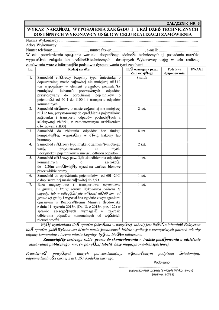 ZAŁĄCZNIK NR 6 WYKAZ NARZĘDZI, WYPOSAŻENIA ZAKŁADU I URZĄDZEŃ TECHNICZNYCH DOSTĘPNYCH WYKONAWCY USŁUG W CELU REALIZACJI ZAMÓWIENIA Nazwa Wykonawcy : ................................................................................................................................. Adres Wykonawcy : ................................................................................................................................... Numer telefonu: ................................., numer fax-u: ..............................., e-mail: ...................................... W celu potwierdzenia spełniania warunku dotyczącego zdolności technicznych tj. posiadania narzędzi, wyposażenia zakładu lub urządzeń technicznych dostępnych Wykonawcy usług w celu realizacji zamówienia wraz z informacją o podstawie dysponowania tymi zasobami Lp. Rodzaj sprzętu Ilość wymagana przez Zamawiającego 1. Samochód ciężarowy bezpylny typu śmieciarka o dopuszczalnej masie całkowitej nie mniejszej niż 12 ton wyposażony w element prasujący, pozwalający zmniejszyć kubaturę przewożonych odpadów, przystosowany do opróżniania pojemników o pojemności od 60 l do 1100 l i transportu odpadów komunalnych Samochód ciężarowy o masie całkowitej nie mniejszej niż 12 ton, przystosowany do opróżniania pojemników, załadunku i transportu odpadów pochodzących z selektywnej zbiórki, z zamontowanym urządzeniem dźwigowym (HDS) Samochód do zbierania odpadów bez funkcji kompaktującej, wyposażony w dźwig hakowy lub bramowy Samochód ciężarowy typu myjka, o zamkniętym obiegu wody, przystosowany do mycia i dezynfekcji pojemników w miejscu odbioru odpadów Samochód ciężarowy pow. 3,5t .do odbierania odpadów komunalnych o szerokości do 2,20m umożliwiający wjazd na wnętrza blokowe przez wąskie bramy Samochód do opróżniania pojemników od 60l -240l o dopuszczalnej masie całkowitej do 3,5 t. Baza magazynowo – transportowa usytuowana w gminie, z której terenu Wykonawca odbiera te odpady, lub w odległości nie większej niż 60 km od granic tej gminy i wyposażona zgodnie z wymaganiami opisanymi w Rozporządzeniu Ministra Środowiska z dnia 11 stycznia 2013r. (Dz. U. z 2013r. poz. 122) w sprawie szczegółowych wymagań w zakresie odbierania odpadów komunalnych od właścicieli nieruchomości. 8 sztuk 2. 3. 4. 5. 6. 7. Podstawa dysponowania UWAGI 2 szt. 8 szt. 2 szt. 1 szt. 1 szt. 1 szt. Wyżej wymieniona ilość sprzętu (określona w powyższej tabeli) jest ilością minimalną. Faktyczna ilość sprzętu, jaką Wykonawca będzie musiał zastosować będzie wynikała z rzeczywistych potrzeb tak aby odpady komunalne z terenu miasta Legnicy były na bieżąco odbierane. Zamawiający zastrzega sobie prawo do skontrolowania w trakcie postępowania o udzielenie zamówienia publicznego ww. (w powyższej tabeli) bazy magazynowo-transportowej. Prawdziwość powyższych danych potwierdzam(my) odpowiedzialności karnej z art. 297 Kodeksu karnego. własnoręcznym podpisem świadom(mi) Podpisano ............................................................. (upoważnieni przedstawiciele Wykonawcy) (nazwa, adres) UWAGA: Jeżeli Wykonawca zgodnie z art. 22a uPzp polegał będzie na zdolnościach technicznych – tj. posiadał dostęp do ww. narzędzi, wyposażenia zakładu lub urządzeń technicznych, innych podmiotów, niezależnie od charakteru prawnego łączących go z nim stosunków prawnych- do powyższego załącznika dołączyć musi zobowiązanie tych podmiotów do oddania mu do dyspozycji niezbędnych zasobów na potrzeby realizacji zamówienia. Do załącznika należy załączyć: - informacje o podstawie do dysponowania tymi zasobami (rubryka nr 3) potwierdzone np. oświadczeniem Wykonawcy o własności; oświadczeniem innego podmiotu -właściciela o wynajmie, leasingu, dzierżawie, użyczeniu, udostępnieniu itp. - jeżeli Wykonawca zgodnie z art. 22a uPzp polegał będzie na zdolnościach technicznych – tj. posiadał dostęp do ww. narzędzi, wyposażenia zakładu lub urządzeń technicznych, innych podmiotów, niezależnie od charakteru prawnego łączących go z nim stosunków prawnych- do powyższego załącznika dołączyć musi zobowiązanie tych podmiotów do oddania mu do dyspozycji niezbędnych zasobów na potrzeby realizacji zamówienia.