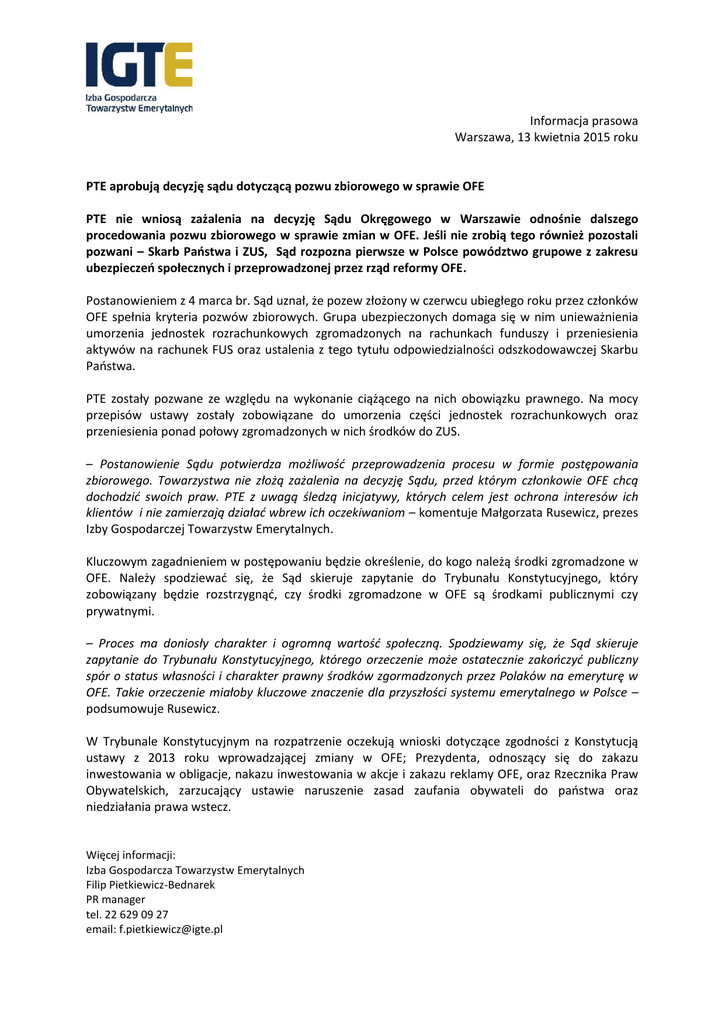 Informacja prasowa Warszawa, 13 kwietnia 2015 roku PTE aprobują decyzję sądu dotyczącą pozwu zbiorowego w sprawie OFE PTE nie wniosą zażalenia na decyzję Sądu Okręgowego w Warszawie odnośnie dalszego procedowania pozwu zbiorowego w sprawie zmian w OFE. Jeśli nie zrobią tego również pozostali pozwani – Skarb Państwa i ZUS, Sąd rozpozna pierwsze w Polsce powództwo grupowe z zakresu ubezpieczeń społecznych i przeprowadzonej przez rząd reformy OFE. Postanowieniem z 4 marca br. Sąd uznał, że pozew złożony w czerwcu ubiegłego roku przez członków OFE spełnia kryteria pozwów zbiorowych. Grupa ubezpieczonych domaga się w nim unieważnienia umorzenia jednostek rozrachunkowych zgromadzonych na rachunkach funduszy i przeniesienia aktywów na rachunek FUS oraz ustalenia z tego tytułu odpowiedzialności odszkodowawczej Skarbu Państwa. PTE zostały pozwane ze względu na wykonanie ciążącego na nich obowiązku prawnego. Na mocy przepisów ustawy zostały zobowiązane do umorzenia części jednostek rozrachunkowych oraz przeniesienia ponad połowy zgromadzonych w nich środków do ZUS. – Postanowienie Sądu potwierdza możliwość przeprowadzenia procesu w formie postępowania zbiorowego. Towarzystwa nie złożą zażalenia na decyzję Sądu, przed którym członkowie OFE chcą dochodzić swoich praw. PTE z uwagą śledzą inicjatywy, których celem jest ochrona interesów ich klientów i nie zamierzają działać wbrew ich oczekiwaniom – komentuje Małgorzata Rusewicz, prezes Izby Gospodarczej Towarzystw Emerytalnych. Kluczowym zagadnieniem w postępowaniu będzie określenie, do kogo należą środki zgromadzone w OFE. Należy spodziewać się, że Sąd skieruje zapytanie do Trybunału Konstytucyjnego, który zobowiązany będzie rozstrzygnąć, czy środki zgromadzone w OFE są środkami publicznymi czy prywatnymi. – Proces ma doniosły charakter i ogromną wartość społeczną. Spodziewamy się, że Sąd skieruje zapytanie do Trybunału Konstytucyjnego, którego orzeczenie może ostatecznie zakończyć publiczny spór o status własności i charakter prawny środków zgormadzonych przez Polaków na emeryturę w OFE. Takie orzeczenie miałoby kluczowe znaczenie dla przyszłości systemu emerytalnego w Polsce – podsumowuje Rusewicz. W Trybunale Konstytucyjnym na rozpatrzenie oczekują wnioski dotyczące zgodności z Konstytucją ustawy z 2013 roku wprowadzającej zmiany w OFE; Prezydenta, odnoszący się do zakazu inwestowania w obligacje, nakazu inwestowania w akcje i zakazu reklamy OFE, oraz Rzecznika Praw Obywatelskich, zarzucający ustawie naruszenie zasad zaufania obywateli do państwa oraz niedziałania prawa wstecz. Więcej informacji: Izba Gospodarcza Towarzystw Emerytalnych Filip Pietkiewicz-Bednarek PR manager tel. 22 629 09 27 email: [email protected]