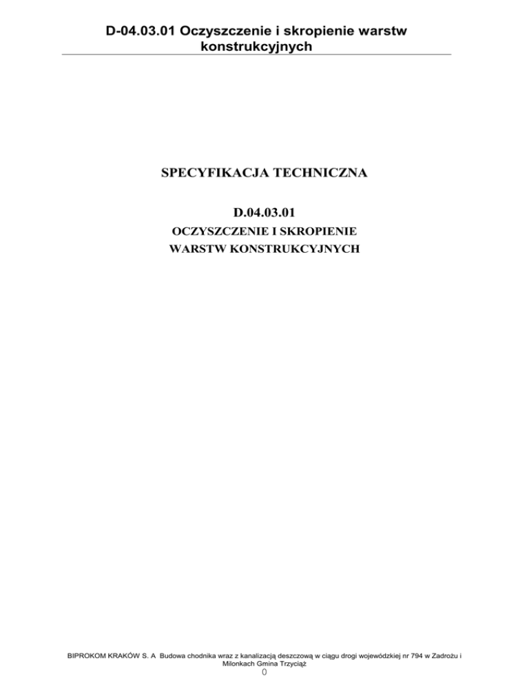 D-04.03.01 Oczyszczenie i skropienie warstw konstrukcyjnych SPECYFIKACJA TECHNICZNA D.04.03.01 OCZYSZCZENIE I SKROPIENIE WARSTW KONSTRUKCYJNYCH BIPROKOM KRAKÓW S. A Budowa chodnika wraz z kanalizacją deszczową w ciągu drogi wojewódzkiej nr 794 w Zadrożu i Milonkach Gmina Trzyciąż 0 D-04.03.01 Oczyszczenie i skropienie warstw konstrukcyjnych 1. WSTĘP 1.1. Przedmiot Specyfikacji Technicznej Przedmiotem niniejszej Specyfikacji Technicznej są wymagania dotyczące wykonania i odbioru robót związanych, z oczyszczeniem i skropieniem warstw konstrukcyjnych nawierzchni, które zostaną wykonane w ramach projektu Budowa chodnika wraz z kanalizacją deszczową w ciągu drogi wojewódzkiej nr 794 w Zadrożu i Milonkach Gmina Trzyciąż Roboty w zakresie budowy dróg Zakres robót podstawowych obejmuje: - ręczne oczyszczenie warstw konstrukcyjnych, - mechaniczne oczyszczenie warstw konstrukcyjnych, - skropienie warstw konstrukcyjnych. 1.2 Zakres stosowania Specyfikacji Technicznej Specyfikacja Techniczna jest stosowana jako dokument przetargowy i kontraktowy przy zlecaniu i realizacji robót wymienionych w punkcie 1.1. 1.3 Zakres robót objętych Specyfikacją Techniczną Ustalenia zawarte w niniejszej ST dotyczą zasad prowadzenia robót związanych z oczyszczeniem i skropieniem warstw konstrukcyjnych przed ułożeniem następnej warstwy nawierzchni i obejmują: a. ręczne oczyszczenie warstw konstrukcyjnych– ok. 30% robót -nawierzchnia nieulepszona -nawierzchnia bitumiczna b. mechaniczne oczyszczenie warstw konstrukcyjnych– ok. 70% robót -nawierzchnia nieulepszona -nawierzchnia bitumiczna c. skropienie warstw konstrukcyjnych emulsją asfaltową kationową. . 1.4. Określenia podstawowe Określenia podstawowe są zgodne z obowiązującymi, odpowiednimi polskimi normami i z definicjami podanymi w ST D-00.00.00 „Wymagania ogólne” pkt 1.4. 1.5. Ogólne wymagania dotyczące robót Ogólne wymagania dotyczące robót podano w ST D-00.00.00 „Wymagania ogólne” pkt 1.5. 2. MATERIAŁY 2.1. Ogólne wymagania dotyczące materiałów Ogólne wymagania dotyczące materiałów, ich pozyskiwania i składowania, podano w ST D-00.00.00 „Wymagania ogólne” pkt 2. 2.2. Rodzaje materiałów do wykonania skropienia Materiałami stosowanymi przy skropieniu warstw konstrukcyjnych nawierzchni są: a) do skropienia podbudowy nieulepszonych (nieasfaltowej): - kationowe emulsje średniorozpadowe wg WT.EmA-1999 , b) do skropienia podbudów asfaltowych, betonowych i warstw z mieszanek mineralno-asfaltowych: - kationowe emulsje szybkorozpadowe wg WT.EmA-1999 , 2.3. Wymagania dla materiałów Wymagania dla kationowej emulsji asfaltowej podano w EmA-99 . 2.4. Zużycie lepiszczy do skropienia 2.4.1 Przygotowanie podłoża Podłoże pod warstwę nawierzchni z betonu asfaltowego powinno być wyprofilowane i równe. Powierzchnia podłoża powinna być sucha i czysta. W przypadku gdy nierówności, podłoże należy wyrównać poprzez frezowanie lub ułożenie warstwy wyrównawczej. BIPROKOM KRAKÓW S. A Budowa chodnika wraz z kanalizacją deszczową w ciągu drogi wojewódzkiej nr 794 w Zadrożu1 Milonkach Gmina Trzyciąż 1 D-04.03.01 Oczyszczenie i skropienie warstw konstrukcyjnych Przed rozłożeniem warstwy nawierzchni z betonu asfaltowego, podłoże należy skropić emulsją asfaltową w ilości ustalonej w ST. Zalecane ilości asfaltu po odparowaniu wody z emulsji lub upłynniacza podano w tablicy 2. Powierzchnie czołowe krawężników, włazów, wpustów itp. urządzeń powinny być pokryte asfaltem lub materiałem uszczelniającym określonym w ST i zaakceptowanym przez Inżyniera. 2.4.2 Orientacyjne zużycie lepiszczy do skropienia warstw konstrukcyjnych nawierzchni podano w tablicy 2. Tablica 2. Zalecane ilości asfaltu po odparowaniu wody z emulsji asfaltowej Podłoże do wykonania warstwy z mieszanki betonu asfaltowego Ilość asfaltu po odparowaniu wody z emulsji kg/m2 od 0,7 do 1,0 Podbudowa z kruszywa stabilizowanego mechanicznie Podbudowa z chudego betonu lub gruntu stabilizowanego cementem Nawierzchnia asfaltowa o chropowatej powierzchni od 0,5 do 0,7 od 0,3 do 0,5 od 0,2 do 0,5 Dokładne zużycie lepiszczy powinno być ustalone w zależności od rodzaju warstwy i stanu jej powierzchni i zaakceptowane przez Inżyniera. 2.4.3 Połączenie międzywarstwowe Każdą ułożoną warstwę należy skropić emulsją asfaltową lub asfaltem upłynnionym przed ułożeniem następnej, w celu zapewnienia odpowiedniego połączenia międzywarstwowego, w ilości ustalonej w ST. Zalecane ilości asfaltu po odparowaniu wody z emulsji asfaltowej lub upłynniacza podano w tablicy 3. Tablica 3. Zalecane ilości asfaltu po odparowaniu wody z emulsji asfaltowej Lp. 1 2 3 Połączenie nowych warstw Ilość asfaltu po odparowaniu wody z emulsji lub upłynniacza z asfaltu upłynnionego kg/m2 Podbudowa asfaltowa Asfaltowa warstwa wyrównawcza Asfaltowa warstwa wiążąca od 0,3 do 0,5 od 0,1 do 0,3 Skropienie powinno być wykonane z wyprzedzeniem w czasie przewidzianym na odparowanie wody; orientacyjny czas wyprzedzenia wynosi co najmniej: − 8 h przy ilości powyżej 1,0 kg/m2 emulsji lub asfaltu upłynnionego, − 2 h przy ilości od 0,5 do 1,0 kg/m2 emulsji lub asfaltu upłynnionego, − 0,5 h przy ilości od 0,2 do 0,5 kg/m2 emulsji lub asfaltu upłynnionego. Wymaganie nie dotyczy skropienia rampą otaczarki. 2.5. Składowanie lepiszczy Warunki przechowywania nie mogą powodować utraty cech lepiszcza i obniżenia jego jakości. Lepiszcze należy przechowywać w zbiornikach stalowych wyposażonych w urządzenia grzewcze i zabezpieczonych przed dostępem wody i zanieczyszczeniem. Dopuszcza się magazynowanie lepiszczy w zbiornikach murowanych, betonowych lub żelbetowych przy spełnieniu tych samych warunków, jakie podano dla zbiorników stalowych. Emulsję można magazynować w opakowaniach transportowych lub stacjonarnych zbiornikach pionowych z nalewaniem od dna. Nie należy stosować zbiornika walcowe