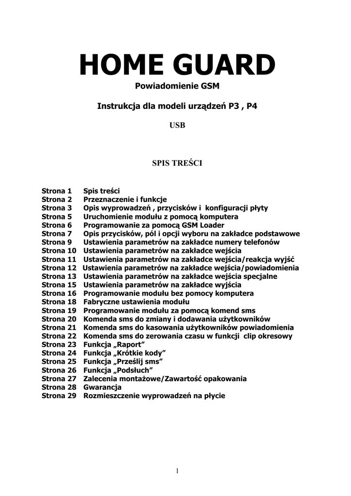 HOME GUARD Powiadomienie GSM Instrukcja dla modeli urządzeń P3 , P4 USB SPIS TREŚCI Strona 1 Strona 2 Strona 3 Strona 5 Strona 6 Strona 7 Strona 9 Strona 10 Strona 11 Strona 12 Strona 13 Strona 15 Strona 16 Strona 18 Strona 19 Strona 20 Strona 21 Strona 22 Strona 23 Strona 24 Strona 25 Strona 26 Strona 27 Strona 28 Strona 29 Spis treści Przeznaczenie i funkcje Opis wyprowadzeń , przycisków i konfiguracji płyty Uruchomienie modułu z pomocą komputera Programowanie za pomocą GSM Loader Opis przycisków, pól i opcji wyboru na zakładce podstawowe Ustawienia parametrów na zakładce numery telefonów Ustawienia parametrów na zakładce wejścia Ustawienia parametrów na zakładce wejścia/reakcja wyjść Ustawienia parametrów na zakładce wejścia/powiadomienia Ustawienia parametrów na zakładce wejścia specjalne Ustawienia parametrów na zakładce wyjścia Programowanie modułu bez pomocy komputera Fabryczne ustawienia modułu Programowanie modułu za pomocą komend sms Komenda sms do zmiany i dodawania uŜytkowników Komenda sms do kasowania uŜytkowników powiadomienia Komenda sms do zerowania czasu w funkcji clip okresowy Funkcja „Raport” Funkcja „Krótkie kody” Funkcja „Prześlij sms” Funkcja „Podsłuch” Zalecenia montaŜowe/Zawartość opakowania Gwarancja Rozmieszczenie wyprowadzeń na płycie 1 Instrukcja Home Guard P3/P4 1. Przeznaczenie Moduły Powiadomienia GSM serii Home Guard P3, P4 przeznaczone są do współpracy z dowolnym systemem sygnalizacji alarmowej. Moduł moŜe być wykorzystywany jako układ monitorujący lub sterujący w alarmowych układach zabezpieczających, automatyki bramowej oraz wszędzie tam, gdzie występuje potrzeba zdalnego sterowania i powiadamiania. 2. Funkcje 2.1 Osiem wejść konfigurowalnych niezaleŜnie IN 1-8. 2.2 Wejście uzbrajające ARM/DISARM. 2.3 Wejście sabotaŜowe SAB. 2.4 Wejście REP do powiadomienia clip-em uŜytkownika 1 2.5 Dwa wyjścia OUT sterowane za pomocą sms i clip-a o programowanym działaniu. 2.6 Dwa wyjścia OUT sterowane sms-em (w wersji Home Guard P4) 2.7 Funkcja clip okresowy testująca działanie powiadomienia 2.8 Funkcja raportu wysyłająca w jednym sms-ie stany wejść, wyjść oraz zasięgu sieci 2.9 Funkcja podsłuchu. 2.10 Funkcja przesyłania lub blokowania nierozpoznanych sms-ów wchodzących do modułu 2.11 Funkcje krótkie kody do zdalnego zasilania SIM komendami prepaid 2.12 Funkcja Prześlij sms do zdalnego sterowania usługami operatora gsm 2.13 Wbudowany na płycie wskaźnik zasięgu sieci GSM. 2.14 Wskaźniki LED: zasilania, pracy modułu GSM oraz procesora głównego. 2.15 Pełna konfiguracja ustawień za pomocą aplikacji PC „GSM Loader”. 2.16 Zdalna konfiguracja uŜytkowników modułu za pomocą sms. 2.17 Czterech niezaleŜnych uŜytkowników, do których wysyłane są powiadomienia 2 3. Opis wyprowadzeń , przycisków i konfiguracji na płycie Home Guard Wejścia „IN1-IN8” (reagujące na podanie lub zanik masy) Do kaŜdego z wejść moŜliwe jest przypisanie oddzielnych treści komunikatów sms dla reakcji wejścia na podanie i zanik masy. Dla kaŜdej reakcji zarówno podanie masy, jak równieŜ zanik masy na dowolnym wejściu moŜliwe jest przypisanie powiadomień: CLIP – krótkiego połączenia do zaprogramowanego numeru, SMS – wiadomości tekstowej (35 znaków składających się z liter lub cyfr), CLIP oraz SMS. Wejście uzbrajające „ARM/DIS” (podanie masy wyłącza czuwanie wejść IN1-IN8) Do wejścia moŜliwe jest przypisanie treści komunikatów sms dla reakcji wejścia na podanie lub zanik masy. Dla kaŜdej reakcji zarówno podanie masy, jak równieŜ zanik masy moŜliwe jest przypisanie powiadomienia do kaŜdego z czterech uŜytkowników: CLIP – krótkiego połączenia do zaprogramowanego numeru, SMS – wiadomości tekstowej (35 znaków składających się z liter lub cyfr) CLIP oraz SMS Wejście sabotaŜowe „SAB” (reaguje na podanie lub zanik masy) Wejście działa bez względu na stan na wejściu uzbrajającym. Dla kaŜdej reakcji zarówno podanie masy, jak równieŜ zanik masy moŜliwe jest przypisanie powiadomienia do kaŜdego z czterech uŜytkowników: CLIP – krótkiego połączenia do zaprogramowanego numeru SMS – wiadomości tekstowej (35 znaków składających się z liter lub cyfr) CLIP oraz SMS Wejście „REP” (reaguje na podanie masy) Wejście działa bez względu na stan na wejściu uzbrajającym. Po podaniu masy na wejście zostaje wykonane połączenie do uŜytkownika 1. Wyjście OUT1 (podaje masę 100mA) - Załączane lub wyłączane reakcją na wejściu IN1-IN8. - Załączane lub wyłączane sms-em przesyłanym do Home Guard. - Załączane lub wyłączane za pomocą połączenia telefonicznego clip do Home Guard. Dla kaŜdej reakcji zarówno załączenia masy, jak równieŜ wyłączenia masy moŜliwe jest przypisanie powiadomienia: SMS – wiadomości tekstowej (35 znaków składających się z liter lub cyfr). - Załączanie wyjścia tylko na zaprogramowany czas. Wyjście OUT2 (podaje masę 100mA) - Załączane lub wyłączane reakcją na wejściu IN1-IN8. - Załączane lub wyłączane sms-em przesyłanym do Home Guard. - Załączane lub wyłączane za pomocą połączenia telefonicznego clip do Home Guard. Dla kaŜdej reakcji zarówno załączenia masy, jak równieŜ wyłączenia masy moŜliwe jest przypisanie powiadomienia: SMS – wiadomości tekstowej (35 znaków składających się z liter lub cyfr). - Załączanie wyjścia tylko na zaprogramowany czas. Wyjście OUT3 dostępne tylko w wersji Home Guard P4 (podaje masę 100mA) - Załączane sms-em o treści Z3 przesyłanym do Home Guard. -Wyłączane sms-em o treści W3 przesyłanym do Home Guard. - Załączane na 1 sekundę sms-em o treści A3 przesyłanym do Home Guard. Wyjście OUT4 dostępne tylko w wersji Home Guard P4 (podaje masę 100mA) - Załączane sms-em o treści Z4 przesyłanym do Home Guard. -Wyłączane sms-em o treści W4 przesyłanym do Home Guard.