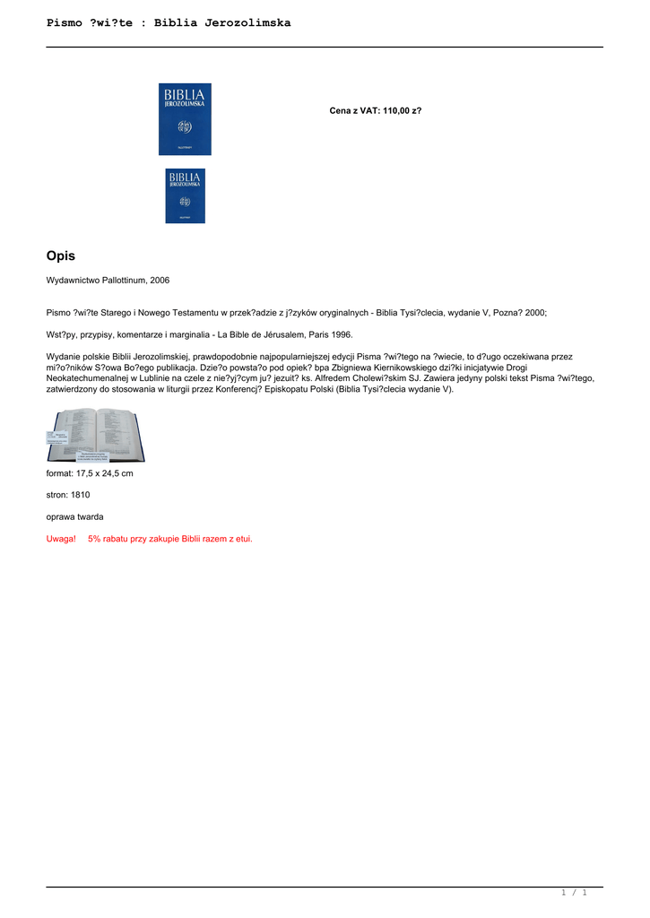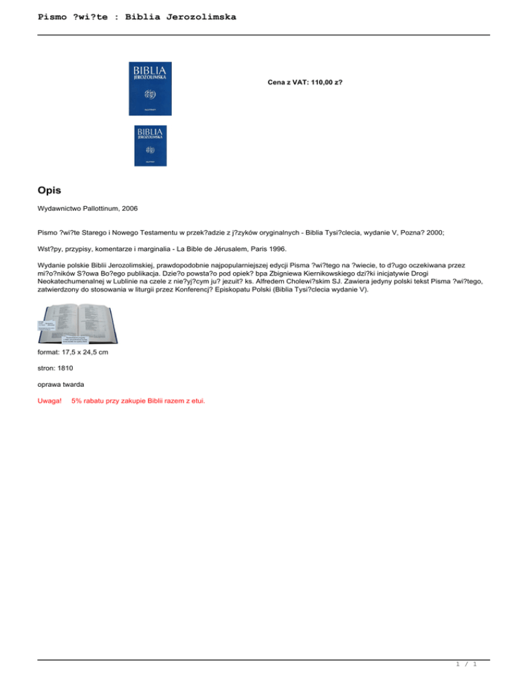 Pismo ?wi?te : Biblia Jerozolimska Cena z VAT: 110,00 z? Opis Wydawnictwo Pallottinum, 2006 Pismo ?wi?te Starego i Nowego Testamentu w przek?adzie z j?zyków oryginalnych - Biblia Tysi?clecia, wydanie V, Pozna? 2000; Wst?py, przypisy, komentarze i marginalia - La Bible de Jérusalem, Paris 1996. Wydanie polskie Biblii Jerozolimskiej, prawdopodobnie najpopularniejszej edycji Pisma ?wi?tego na ?wiecie, to d?ugo oczekiwana przez mi?o?ników S?owa Bo?ego publikacja. Dzie?o powsta?o pod opiek? bpa Zbigniewa Kiernikowskiego dzi?ki inicjatywie Drogi Neokatechumenalnej w Lublinie na czele z nie?yj?cym ju? jezuit? ks. Alfredem Cholewi?skim SJ. Zawiera jedyny polski tekst Pisma ?wi?tego, zatwierdzony do stosowania w liturgii przez Konferencj? Episkopatu Polski (Biblia Tysi?clecia wydanie V). format: 17,5 x 24,5 cm stron: 1810 oprawa twarda Uwaga! 5% rabatu przy zakupie Biblii razem z etui. 1 / 1 Powered by TCPDF (www.tcpdf.org)