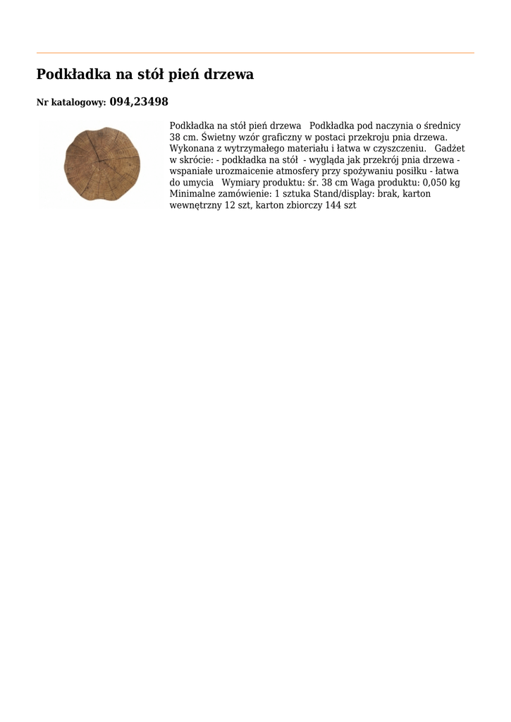 Podkładka na stół pień drzewa Nr katalogowy: 094,23498 Podkładka na stół pień drzewa Podkładka pod naczynia o średnicy 38 cm. Świetny wzór graficzny w postaci przekroju pnia drzewa. Wykonana z wytrzymałego materiału i łatwa w czyszczeniu. Gadżet w skrócie: - podkładka na stół - wygląda jak przekrój pnia drzewa wspaniałe urozmaicenie atmosfery przy spożywaniu posiłku - łatwa do umycia Wymiary produktu: śr. 38 cm Waga produktu: 0,050 kg Minimalne zamówienie: 1 sztuka Stand/display: brak, karton wewnętrzny 12 szt, karton zbiorczy 144 szt