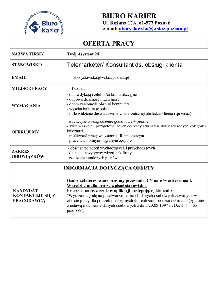 BIURO KARIER Ul. RóŜana 17A, 61-577 Poznań e-mail: [email protected] OFERTA PRACY NAZWA FIRMY Twój Asystent 24 STANOWISKO Telemarketer/ Konsultant ds. obsługi klienta EMAIL MIEJSCE PRACY WYMAGANIA [email protected] Poznań - dobra dykcją i zdolności komunikacyjne - odpowiedzialność i rzetelność - dobra znajomość obsługi komputera - wysoka kultura osobista - mile widziane doświadczenie w telefonicznej obsłudze klienta (sprzedaŜ) OFERUJEMY - atrakcyjne wynagrodzenie godzinowe + premie - system szkoleń przygotowujących do pracy i wsparcie doświadczonych kolegów i koleŜanek - moŜliwość pracy w systemie III zmianowym - pracę w ambitnym i zgranym zespole ZAKRES OBOWIĄZKÓW - obsługa połączeń wychodzących i przychodzących - dbanie o pozytywny wizerunek firmy - realizacja ustalonych planów INFORMACJA DOTYCZĄCA OFERTY KANDYDAT KONTAKTUJE SIĘ Z PRACODAWCĄ Osoby zainteresowane prosimy przesłanie CV na w/w adres e-mail. W treści e-maila proszę wpisać stanowisko. Proszę o umieszczenie w aplikacji następującej klauzuli: "WyraŜam zgodę na przetwarzanie moich danych osobowych zawartych w ofercie pracy dla potrzeb niezbędnych do realizacji procesu rekrutacji (zgodnie z ustawą o ochronie danych osobowych z dnia 29.08.1997 r.: Dz.U. Nr 133, poz. 883).