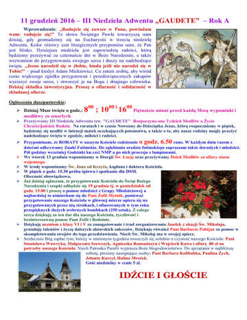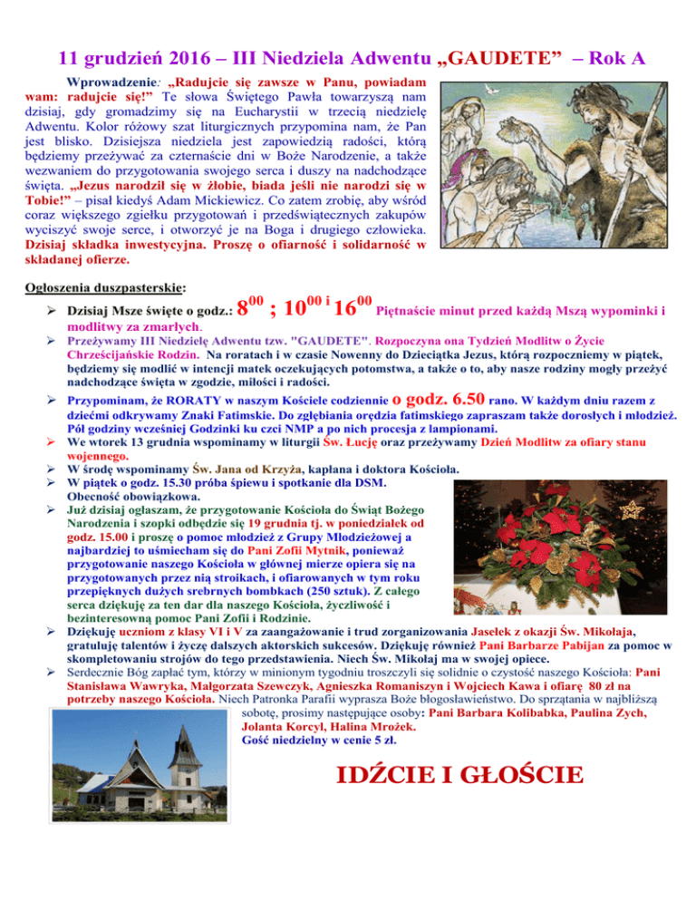 11 grudzień 2016 – III Niedziela Adwentu „GAUDETE” – Rok A Wprowadzenie: „Radujcie się zawsze w Panu, powiadam wam: radujcie się!” Te słowa Świętego Pawła towarzyszą nam dzisiaj, gdy gromadzimy się na Eucharystii w trzecią niedzielę Adwentu. Kolor różowy szat liturgicznych przypomina nam, że Pan jest blisko. Dzisiejsza niedziela jest zapowiedzią radości, którą będziemy przeżywać za czternaście dni w Boże Narodzenie, a także wezwaniem do przygotowania swojego serca i duszy na nadchodzące święta. „Jezus narodził się w żłobie, biada jeśli nie narodzi się w Tobie!” – pisał kiedyś Adam Mickiewicz. Co zatem zrobię, aby wśród coraz większego zgiełku przygotowań i przedświątecznych zakupów wyciszyć swoje serce, i otworzyć je na Boga i drugiego człowieka. Dzisiaj składka inwestycyjna. Proszę o ofiarność i solidarność w składanej ofierze. Ogłoszenia duszpasterskie: Dzisiaj Msze święte o godz.: modlitwy za zmarłych. 800 ; 1000 i 1600 Piętnaście minut przed każdą Mszą wypominki i Przeżywamy III Niedzielę Adwentu tzw. "GAUDETE". Rozpoczyna ona Tydzień Modlitw o Życie Chrześcijańskie Rodzin. Na roratach i w czasie Nowenny do Dzieciątka Jezus, którą rozpoczniemy w piątek, będziemy się modlić w intencji matek oczekujących potomstwa, a także o to, aby nasze rodziny mogły przeżyć nadchodzące święta w zgodzie, miłości i radości. Przypominam, że RORATY w naszym Kościele codziennie o godz. 6.50 rano. W każdym dniu razem z dziećmi odkrywamy Znaki Fatimskie. Do zgłębiania orędzia fatimskiego zapraszam także dorosłych i młodzież. Pół godziny wcześniej Godzinki ku czci NMP a po nich procesja z lampionami. We wtorek 13 grudnia wspominamy w liturgii Św. Łucję oraz przeżywamy Dzień Modlitw za ofiary stanu wojennego. W środę wspominamy Św. Jana od Krzyża, kapłana i doktora Kościoła. W piątek o godz. 15.30 próba śpiewu i spotkanie dla DSM. Obecność obowiązkowa. Już dzisiaj ogłaszam, że przygotowanie Kościoła do Świąt Bożego Narodzenia i szopki odbędzie się 19 grudnia tj. w poniedziałek od godz. 15.00 i proszę o pomoc młodzież z Grupy Młodzieżowej a najbardziej to uśmiecham się do Pani Zofii Mytnik, ponieważ przygotowanie naszego Kościoła w głównej mierze opiera się na przygotowanych przez nią stroikach, i ofiarowanych w tym roku przepięknych dużych srebrnych bombkach (250 sztuk). Z całego serca dziękuję za ten dar dla naszego Kościoła, życzliwość i bezinteresowną pomoc Pani Zofii i Rodzinie. Dziękuję uczniom z klasy VI i V za zaangażowanie i trud zorganizowania Jasełek z okazji Św. Mikołaja, gratuluję talentów i życzę dalszych aktorskich sukcesów. Dziękuję również Pani Barbarze Pabijan za pomoc w skompletowaniu strojów do tego przedstawienia. Niech Św. Mikołaj ma w swojej opiece. Serdecznie Bóg zapłać tym, którzy w minionym tygodniu troszczyli się solidnie o czystość naszego Kościoła: Pani Stanisława Wawryka, Małgorzata Szewczyk, Agnieszka Romaniszyn i Wojciech Kawa i ofiarę 80 zł na potrzeby naszego Kościoła. Niech Patronka Parafii wyprasza Boże błogosławieństwo. Do sprzątania w najbliższą sobotę, prosimy następujące osoby: Pani Barbara Kolibabka, Paulina Zych, Jolanta Korcyl, Halina Mrożek. Gość niedzielny w cenie 5 zł. IDŹCIE I GŁOŚCIE