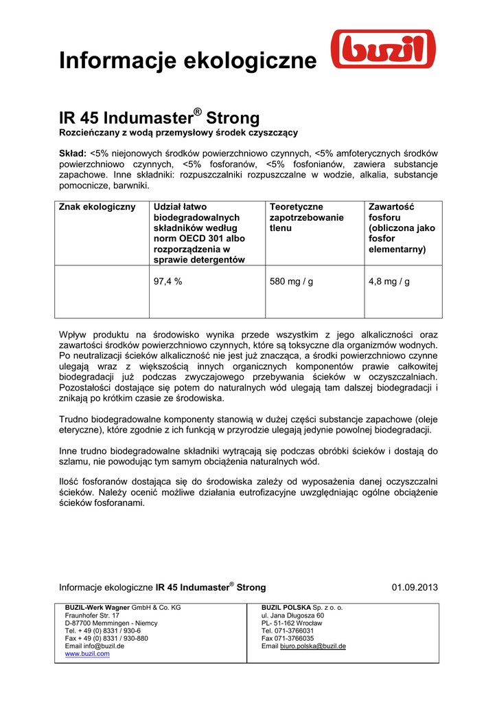 Informacje ekologiczne IR 45 Indumaster® Strong Rozcieńczany z wodą przemysłowy środek czyszczący Skład: <5% niejonowych środków powierzchniowo czynnych, <5% amfoterycznych środków powierzchniowo czynnych, <5% fosforanów, <5% fosfonianów, zawiera substancje zapachowe. Inne składniki: rozpuszczalniki rozpuszczalne w wodzie, alkalia, substancje pomocnicze, barwniki. Znak ekologiczny Udział łatwo biodegradowalnych składników według norm OECD 301 albo rozporządzenia w sprawie detergentów Teoretyczne zapotrzebowanie tlenu Zawartość fosforu (obliczona jako fosfor elementarny) 97,4 % 580 mg / g 4,8 mg / g Wpływ produktu na środowisko wynika przede wszystkim z jego alkaliczności oraz zawartości środków powierzchniowo czynnych, które są toksyczne dla organizmów wodnych. Po neutralizacji ścieków alkaliczność nie jest już znacząca, a środki powierzchniowo czynne ulegają wraz z większością innych organicznych komponentów prawie całkowitej biodegradacji już podczas zwyczajowego przebywania ścieków w oczyszczalniach. Pozostałości dostające się potem do naturalnych wód ulegają tam dalszej biodegradacji i znikają po krótkim czasie ze środowiska. Trudno biodegradowalne komponenty stanowią w dużej części substancje zapachowe (oleje eteryczne), które zgodnie z ich funkcją w przyrodzie ulegają jedynie powolnej biodegradacji. Inne trudno biodegradowalne składniki wytrącają się podczas obróbki ścieków i dostają do szlamu, nie powodując tym samym obciążenia naturalnych wód. Ilość fosforanów dostająca się do środowiska zależy od wyposażenia danej oczyszczalni ścieków. Należy ocenić możliwe działania eutrofizacyjne uwzględniając ogólne obciążenie ścieków fosforanami. Informacje ekologiczne IR 45 Indumaster® Strong BUZIL-Werk Wagner GmbH & Co. KG Fraunhofer Str. 17 D-87700 Memmingen - Niemcy Tel. + 49 (0) 8331 / 930-6 Fax + 49 (0) 8331 / 930-880 Email [email protected] www.buzil.com BUZIL POLSKA Sp. z o. o. ul. Jana Długosza 60 PL- 51-162 Wrocław Tel. 071-3766031 Fax 071-3766035 Email [email protected] 01.09.2013