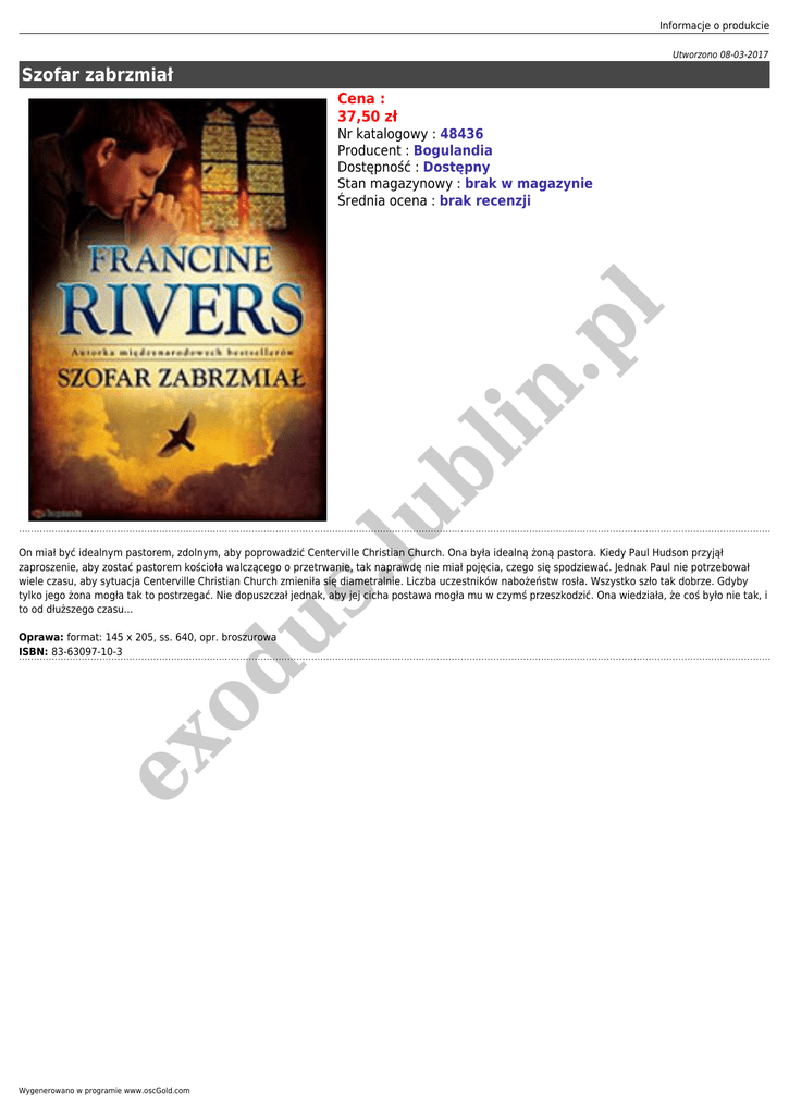 Informacje o produkcie Utworzono 08-03-2017 Szofar zabrzmiał Cena : 37,50 zł .lu bl in .p l Nr katalogowy : 48436 Producent : Bogulandia Dostępność : Dostępny Stan magazynowy : brak w magazynie Średnia ocena : brak recenzji od us On miał być idealnym pastorem, zdolnym, aby poprowadzić Centerville Christian Church. Ona była idealną żoną pastora. Kiedy Paul Hudson przyjął zaproszenie, aby zostać pastorem kościoła walczącego o przetrwanie, tak naprawdę nie miał pojęcia, czego się spodziewać. Jednak Paul nie potrzebował wiele czasu, aby sytuacja Centerville Christian Church zmieniła się diametralnie. Liczba uczestników nabożeństw rosła. Wszystko szło tak dobrze. Gdyby tylko jego żona mogła tak to postrzegać. Nie dopuszczał jednak, aby jej cicha postawa mogła mu w czymś przeszkodzić. Ona wiedziała, że coś było nie tak, i to od dłuższego czasu... ex Oprawa: format: 145 x 205, ss. 640, opr. broszurowa ISBN: 83-63097-10-3 Wygenerowano w programie www.oscGold.com