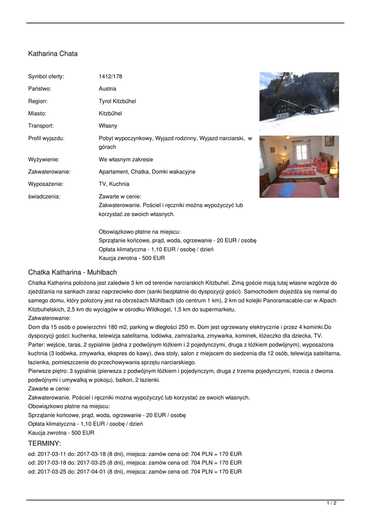 Katharina Chata Symbol oferty: 1412/178 Państwo: Austria Region: Tyrol Kitzbűhel Miasto: Kitzbűhel Transport: Własny Profil wyjazdu: Pobyt wypoczynkowy, Wyjazd rodzinny, Wyjazd narciarski, w Wyżywienie: We własnym zakresie Zakwaterowanie: Apartament, Chatka, Domki wakacyjne Wyposażenie: TV, Kuchnia świadczenia: Zawarte w cenie: górach Zakwaterowanie. Pościel i ręczniki można wypożyczyć lub korzystać ze swoich własnych. Obowiązkowo płatne na miejscu: Sprzątanie końcowe, prąd, woda, ogrzewanie - 20 EUR / osobę Opłata klimatyczna - 1,10 EUR / osobę / dzień Kaucja zwrotna - 500 EUR Chatka Katharina - Muhlbach Chatka Katharina położona jest zaledwie 3 km od terenów narciarskich Kitzbuhel. Zimą goście mają tutaj własne wzgórze do zjeżdżania na sankach zaraz naprzeciwko dom (sanki bezpłatnie do dyspozycji gości). Samochodem dojeżdża się niemal do samego domu, który położony jest na obrzeżach Mühlbach (do centrum 1 km), 2 km od kolejki Panoramacable-car w Alpach Kitzbuhelskich, 2,5 km do wyciągów w ośrodku Wildkogel, 1,5 km do supermarketu. Zakwaterowanie: Dom dla 15 osób o powierzchni 180 m2, parking w dległości 250 m. Dom jest ogrzewany elektrycznie i przez 4 kominki.Do dyspozycji gości: kuchenka, telewizja satelitarna, lodówka, zamrażarka, zmywarka, kominek, łóżeczko dla dziecka, TV. Parter: wejście, taras, 2 sypialnie (jedna z podwójnym łóżkiem i 2 pojedynczymi, druga z łóżkiem podwójnym), wyposażona kuchnia (3 lodówka, zmywarka, ekspres do kawy), dwa stoły, salon z miejscem do siedzenia dla 12 osób, telewizja satelitarna, łazienka, pomieszczenie do przechowywania sprzętu narciarskiego. Pierwsze piętro: 3 sypialnie (pierwsza z podwójnym łóżkiem i pojedynczym, druga z trzema pojedynczymi, trzecia z dwoma podwójnymi i umywalką w pokoju), balkon, 2 łazienki. Zawarte w cenie: Zakwaterowanie. Pościel i ręczniki można wypożyczyć lub korzystać ze swoich własnych. Obowiązkowo płatne na miejscu: Sprzątanie końcowe, prąd, woda, ogrzewanie - 20 EUR / osobę Opłata klimatyczna - 1,10 EUR / osobę / dzień Kaucja zwrotna - 500 EUR TERMINY: od: 2017-03-11 do: 2017-03-18 (8 dni), miejsca: zamów cena od: 704 PLN = 170 EUR od: 2017-03-18 do: 2017-03-25 (8 dni), miejsca: zamów cena od: 704 PLN = 170 EUR od: 2017-03-25 do: 2017-04-01 (8 dni), miejsca: zamów cena od: 704 PLN = 170 EUR 1/2 od: 2017-04-01 do: 2017-04-08 (8 dni), miejsca: zamów cena od: 704 PLN = 170 EUR od: 2017-04-08 do: 2017-04-15 (8 dni), miejsca: zamów cena od: 704 PLN = 170 EUR od: 2017-04-15 do: 2017-04-22 (8 dni), miejsca: zamów cena od: 704 PLN = 170 EUR CENNIK: Długość pobytu: 8 dni Grupa cenowa: B Ubezpieczenie (obligatoryjne) (*) Ubezpieczenie KL, NW, SKI 14 (*) Turystyczny Fundusz Gwarancyjny Pobyt w obiekcie (do wyboru) 2.5 (*) Dom 15 osobowy standardowo dla osób: 15 minimalnie: 1 Rodzaj osoby (do wyboru) (*) Uczestnik 2339 (-) Waluta: EUR Aktualne ceny z systemu S.A.R.T. (-) - cena usługi, podatku kalkulowana przy osobie lub gratis (*) - kwota wliczona w cenę standardową 2/2