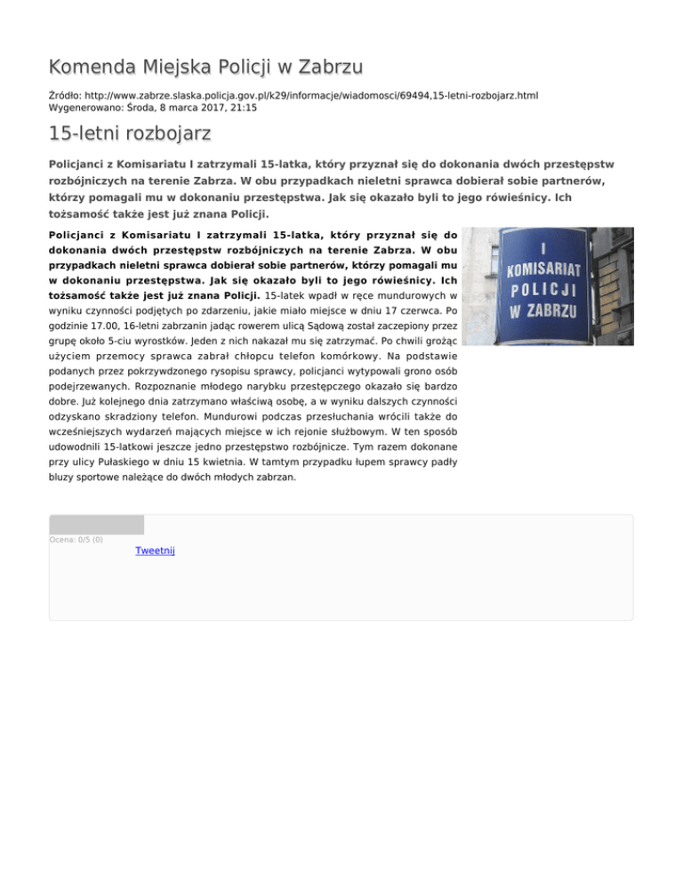 Komenda Miejska Policji w Zabrzu Źródło: http://www.zabrze.slaska.policja.gov.pl/k29/informacje/wiadomosci/69494,15-letni-rozbojarz.html Wygenerowano: Środa, 8 marca 2017, 21:15 15-letni rozbojarz Policjanci z Komisariatu I zatrzymali 15-latka, który przyznał się do dokonania dwóch przestępstw rozbójniczych na terenie Zabrza. W obu przypadkach nieletni sprawca dobierał sobie partnerów, którzy pomagali mu w dokonaniu przestępstwa. Jak się okazało byli to jego rówieśnicy. Ich tożsamość także jest już znana Policji. Policjanci z Komisariatu I zatrzymali 15-latka, który przyznał się do dokonania dwóch przestępstw rozbójniczych na terenie Zabrza. W obu przypadkach nieletni sprawca dobierał sobie partnerów, którzy pomagali mu w dokonaniu przestępstwa. Jak się okazało byli to jego rówieśnicy. Ich tożsamość także jest już znana Policji. 15-latek wpadł w ręce mundurowych w wyniku czynności podjętych po zdarzeniu, jakie miało miejsce w dniu 17 czerwca. Po godzinie 17.00, 16-letni zabrzanin jadąc rowerem ulicą Sądową został zaczepiony przez grupę około 5-ciu wyrostków. Jeden z nich nakazał mu się zatrzymać. Po chwili grożąc użyciem przemocy sprawca zabrał chłopcu telefon komórkowy. Na podstawie podanych przez pokrzywdzonego rysopisu sprawcy, policjanci wytypowali grono osób podejrzewanych. Rozpoznanie młodego narybku przestępczego okazało się bardzo dobre. Już kolejnego dnia zatrzymano właściwą osobę, a w wyniku dalszych czynności odzyskano skradziony telefon. Mundurowi podczas przesłuchania wrócili także do wcześniejszych wydarzeń mających miejsce w ich rejonie służbowym. W ten sposób udowodnili 15-latkowi jeszcze jedno przestępstwo rozbójnicze. Tym razem dokonane przy ulicy Pułaskiego w dniu 15 kwietnia. W tamtym przypadku łupem sprawcy padły bluzy sportowe należące do dwóch młodych zabrzan. Ocena: 0/5 (0) Tweetnij