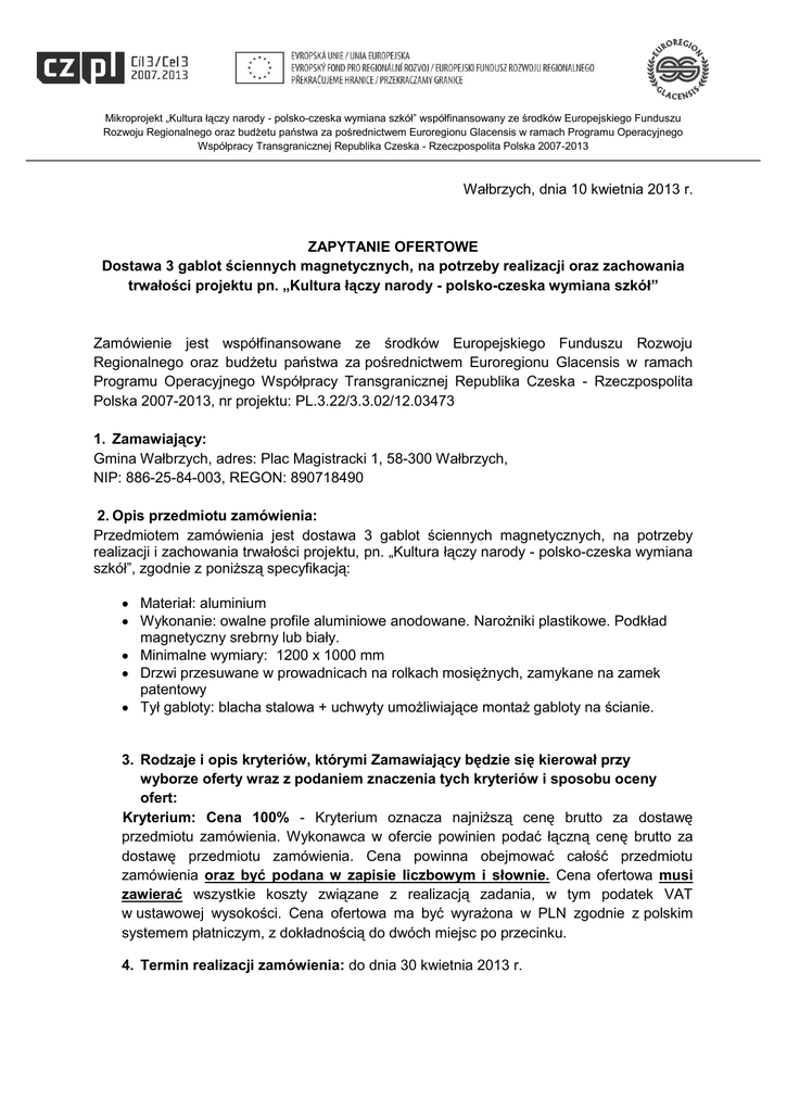 Mikroprojekt „Kultura łączy narody - polsko-czeska wymiana szkół” współfinansowany ze środków Europejskiego Funduszu Rozwoju Regionalnego oraz budżetu państwa za pośrednictwem Euroregionu Glacensis w ramach Programu Operacyjnego Współpracy Transgranicznej Republika Czeska - Rzeczpospolita Polska 2007-2013 Wałbrzych, dnia 10 kwietnia 2013 r. ZAPYTANIE OFERTOWE Dostawa 3 gablot ściennych magnetycznych, na potrzeby realizacji oraz zachowania trwałości projektu pn. „Kultura łączy narody - polsko-czeska wymiana szkół” Zamówienie jest współfinansowane ze środków Europejskiego Funduszu Rozwoju Regionalnego oraz budżetu państwa za pośrednictwem Euroregionu Glacensis w ramach Programu Operacyjnego Współpracy Transgranicznej Republika Czeska - Rzeczpospolita Polska 2007-2013, nr projektu: PL.3.22/3.3.02/12.03473 1. Zamawiający: Gmina Wałbrzych, adres: Plac Magistracki 1, 58-300 Wałbrzych, NIP: 886-25-84-003, REGON: 890718490 2. Opis przedmiotu zamówienia: Przedmiotem zamówienia jest dostawa 3 gablot ściennych magnetycznych, na potrzeby realizacji i zachowania trwałości projektu, pn. „Kultura łączy narody - polsko-czeska wymiana szkół”, zgodnie z poniższą specyfikacją: Materiał: aluminium Wykonanie: owalne profile aluminiowe anodowane. Narożniki plastikowe. Podkład magnetyczny srebrny lub biały. Minimalne wymiary: 1200 x 1000 mm Drzwi przesuwane w prowadnicach na rolkach mosiężnych, zamykane na zamek patentowy Tył gabloty: blacha stalowa + uchwyty umożliwiające montaż gabloty na ścianie. 3. Rodzaje i opis kryteriów, którymi Zamawiający będzie się kierował przy wyborze oferty wraz z podaniem znaczenia tych kryteriów i sposobu oceny ofert: Kryterium: Cena 100% - Kryterium oznacza najniższą cenę brutto za dostawę przedmiotu zamówienia. Wykonawca w ofercie powinien podać łączną cenę brutto za dostawę przedmiotu zamówienia. Cena powinna obejmować całość przedmiotu zamówienia oraz być podana w zapisie liczbowym i słownie. Cena ofertowa musi zawierać wszystkie koszty związane z realizacją zadania, w tym podatek VAT w ustawowej wysokości. Cena ofertowa ma być wyrażona w PLN zgodnie z polskim systemem płatniczym, z dokładnością do dwóch miejsc po przecinku. 4. Termin realizacji zamówienia: do dnia 30 kwietnia 2013 r. 5. Miejsce dostawy zamówienia: Wykonawca dostarczy przedmiot zamówienia na własny koszt, do następujących szkół na terenie miasta Wałbrzycha: - Publiczna Szkoła Podstawowa nr 5, ul. Poznańska 8, 58-303 Wałbrzych, - Publiczne Gimnazjum nr 4, ul. 1 Maja 105, 58-304 Wałbrzych, - Publiczne Gimnazjum nr 9 w Zespole Szkół Integracyjnych, ul. Palisadowa 48, 58-316 Wałbrzych. 6. Miejsce, sposób i termin składania ofert: Oferty należy składać w terminie do dnia: 16 kwietnia 2013 r., do godz. 12:00 Oferta może być przesłana za pośrednictwem: a). poczty na adres: Urząd Miejski w Wałbrzychu, Biuro Zarządzania Strategicznego, Nadzoru Właścicielskiego, Funduszy Europejskich i Rozwoju Gospodarczego, ul. Kopernika 2, 58-300 Wałbrzych b). faksu pod nr: 74 66 55 319, w godz. 8:00-14:00 c). poczty elektronicznej e-mail: [email protected] 7. Opis warunków udziału w postępowaniu: W przypadku ofert składanych pocztą tradycyjną oraz faksem, oferta musi być podpisana przez osoby do tego upoważnione. 8. Sposób zapłaty: Dostawca wystawi fakturę VAT (lub rachunek). Płatność przelewem na rachunek bankowy Dostawcy w terminie 14 dni od daty otrzymania faktury VAT/ rachunku Osoba upoważniona do udzielania informacji na temat zapytania ofertowego: Łukasz Kowalski, tel. 74 66 55 319, e-mail: [email protected]