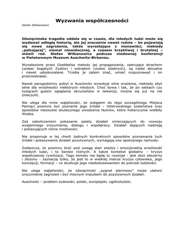 Wyzwania współczesności Stefan Wilkanowicz Oświęcimska tragedia oddala się w czasie, dla młodych ludzi może się wydawać odległą historią, ale jej znaczenie nawet rośnie – bo pojawiają się nowe zagrożenia, także wyrastające z nienawiści, niekiedy „pełzającej”, niemal niewidocznej, a czasem krzykliwej i brutalnej – mówił red. Stefan Wilkanowicz podczas niedawnej konferencji w Państwowym Muzeum Auschwitz-Birkenau. Wynalezione przez Goebbelsa metody jej propagowania, operujące strachem (wobec bogatych Żydów) i wstrętem (wobec biednych), są nadal aktualne i nawet udoskonalane. Trzeba je zatem znać, umieć rozpoznawać i im przeciwdziałać. Nawet parogodzinny pobyt w Auschwitz wywołuje silne wrażenia, niekiedy zbyt silne dla wrażliwości niektórych młodych. Choć bywa i tak, że po setkach czy tysiącach godzin oglądania okrucieństw w telewizji, można się już na nie znieczulić. Nie ulega dla mnie wątpliwości, że wstępem do tego szczególnego Miejsca Pamięci powinno być poznanie jego źródeł – hitlerowskiego szaleństwa oraz sposobów niezwykle skutecznego uwodzenia tłumów, które histerycznie wielbiły Wodza. Zaś zakończeniem pokazanie palety działań zmierzających do rozwoju wzajemnego zrozumienia, dialogu i współpracy. Działań dających nadzieję i pokazujących różne możliwości. Nie proponuje w tej chwili żadnych konkretnych sposobów poznawania tych źródeł i pokazywania działań pozytywnych, wymagają one spokojnego namysłu. Zwłaszcza, że powinny brać pod uwagę stan wiedzy i emocjonalną wrażliwość młodych ludzi, i to bardzo różnych. A także kontekst globalny – kryzys współczesnej cywilizacji. Tego tematu nie będę tu rozwijał - jest zbyt obszerny i złożony - zaznaczę tylko, że jest to w wielkiej mierze kryzys człowieka, jego koncepcji, formacji – co skutkuje jego niedostosowaniem do potrzeb ludzkości. Nie ulega wątpliwości, że oświęcimski „sygnał alarmowy” może zrozumienie zagrożeń i być mocnym impulsem do pozytywnych działań. Auschwitz – problem żydowski, polski, europejski, ogólnoludzki. ułatwić
