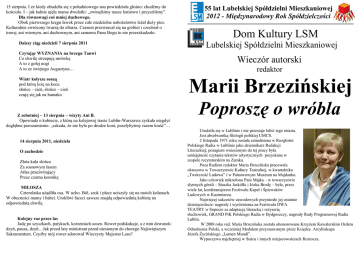 15 sierpnia. I że kiedy obudziła się z południowego snu powiedziała głośno: chodźmy do kościoła. I – jak ładnie ujęła mama dwulatki: „zwinęliśmy nasze lenistwo i przyszliśmy”. Dla równowagi coś mniej duchowego. Obok pierwszego kręgu ławek przez całe niedzielne nabożeństwo leżał duży pies. Kulturalnie zwrócony twarzą do ołtarza. Czasem przewracał się na grzbiet i czochrał o trawę; ani wiernym, ani duchownym, ani samemu Panu Bogu to nie przeszkadzało. Dalszy ciąg niedzieli 7 sierpnia 2011 Czytając WYZNANIA na brzegu Tanwi Co chwilę strzepuję mrówkę A to z gołej nogi A to ze świętego Augustyna… Wiatr kołysze sosną pod którą leżę na kocu słońce – cień, słońce – cień czuję się jak na hamaku Z sobotniej – 13 sierpnia – wizyty Ani B. Opowiada o kobiecie, z którą na kolejowej trasie Lublin-Warszawa zyskała niegdyś dogłębne porozumienie: „szkoda, że nie było po drodze koni, poszłybyśmy razem kraść”… 14 sierpnia 2011, niedziela O zachodzie Złota kula słońca Za sosnowym lasem Atłas prześwitujący Przez czarna koronkę MIŁOSZA Czterolatka użądliła osa. W ucho. Ból, szok i płacz uciszyły się na moich kolanach. W obecności mamy i babci. Urokliwi faceci zawsze znajdą odpowiednią kobietę na odpowiednią chwilę. Kolejny raz przez las Jadę po szyszkach, patykach, korzeniach sosen. Rower podskakuje, a z nim dzwonek: dzyń, pauza, dzyń…Jak przed laty ministrant przed niesionym do chorego Najświętszym Sakramentem. Czyżby mój rower adorował Wieczysty Majestat Lasu? 55 lat Lubelskiej Spółdzielni Mieszkaniowej 2012 - Międzynarodowy Rok Spółdzielczości Dom Kultury LSM Lubelskiej Spółdzielni Mieszkaniowej Wieczór autorski redaktor Marii Brzezińskiej Poproszę o wróbla Urodziła się w Lublinie i nie przestaje lubić tego miasta. Jest absolwentką filologii polskiej UMCS. 2 listopada 1971 roku została zatrudniona w Rozgłośni Polskiego Radia w Lublinie jako dziennikarz Redakcji Literackiej; posagiem wniesionym do tej pracy była umiejętność czytania tekstów artystycznych pozyskana w zespole recytatorskim na Zamku. Poza Radiem redaktor Maria Brzezińska pracowała okresowo w Towarzystwie Kultury Teatralnej, w kwartalniku „Twórczość Ludowa” i w Państwowym Muzeum na Majdanku. Jako człowiek mikrofonu Pani Majka – w towarzystwie słynnych górali – Staszka Jaskółki i Józka Brody – była, przez wiele lat, konferansjerem Festiwalu Kapel i Śpiewaków Ludowych w Kazimierzu. Najwięcej sukcesów zawodowych przyniosło jej ostatnie dziesięciolecie: nagrody i wyróżnienia na Festiwalu DWA TEATRY w Sopocie za adaptację literacką i reżyserię słuchowisk, GRAND PiK Polskiego Radia w Bydgoszczy, nagrody Rady Programowej Radia Lublin. W 2008 roku red. Maria Brzezińska została uhonorowana Krzyżem Kawalerskim Orderu Odrodzenia Polski, a wcześniej Medalem przyznawanym przez Księdza Arcybiskupa Józefa Życińskiego „Lumen Mundi”. Wypoczywa najchętniej w Suścu i innych miejscowościach Roztocza. SUSIEC 2011 55 lat Lubelskiej Spółdzielni Mieszkaniowej 2012 - Międzynarodowy Rok Spółdzielczości 4 sierpnia 2011 Dom Kultury Lubelskiej Spółdzielni Mieszkaniowej Chrystusik po lipami zarośnięty sztucznymi kwiatami serdecznie zaprasza na wieczór autorski redaktor Bociek w złocie przyciąga długim dziobem srebrną żabę księżyca Marii Brzezińskiej Poproszę o wróbla 6 sierpnia 2011 Front atmosferyczny Wiatr czesze obłoki w pasemka i fale W programie wieczoru: • fragmenty nagrodzonych słuchowisk: „Księga pamięci Chełm”, „W tych drzewach jest dużo miejsca”, „Treny dla Amelii” • wiersze z tomu poezji „Poproszę o wróbla” Święta cisza Pełno ludzi, a cicho Przed nabożeństwem w wiejskim kościele Cokolwiek jemy na dworze Musimy się dzielić z osami Ociepliło się. Komary objadają na kolację nasze kostki. 7 sierpnia 2011, niedziela Pogoda, msza przed kościołem. Do ławki, gdzie przycupnęłam z brzegu dołącza małżeństwo w dwojgiem dzieci: całą naszą uwagę skupia drobna dwulatka zmieniająca co chwilę miejsce. Poznałyśmy się wczoraj wieczorem, w przelocie, na placu przed świątynią pod wezwaniem Jana Nepomucena w S.; małolatkę, boskrzeczała, wyciągnęła z kościoła rodzicielka, ja, choć bardzo lubię święto Przemienienia Pańskiego nie zdzierżyłam przedróżańcowych „rozważań” napisanych przez specjalistę od zadawania ciosów tępym słowem. Więc dziś matka dziewczynki zagadnęła pierwsza (jakby wiedziała, że zapisuję takie rzeczy), że córeczka miała wczoraj urodziny, choć termin porodu wyznaczano dopiero na → Spotkanie odbędzie się we wtorek 25 września 2012 r. o godz. 18.00 w sali widowiskowej Domu Kultury LSM w Lublinie, ul. K. Wallenroda 4a, tel. 81 743 48 29 W czasie spotkania będzie można nabyć zbiór wierszy Marii Brzezińskiej Poproszę o wróbla, Lublin 2008, i uzyskać autograf autorki www.domkulturylsm.pl Wstęp wolny