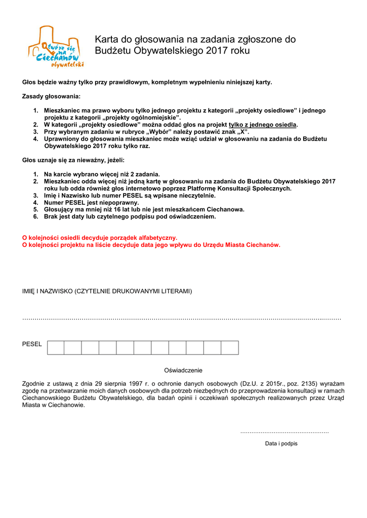 Karta do głosowania na zadania zgłoszone do Budżetu Obywatelskiego 2017 roku Głos będzie ważny tylko przy prawidłowym, kompletnym wypełnieniu niniejszej karty. Zasady głosowania: 1. Mieszkaniec ma prawo wyboru tylko jednego projektu z kategorii „projekty osiedlowe” i jednego projektu z kategorii „projekty ogólnomiejskie”. 2. W kategorii „projekty osiedlowe” można oddać głos na projekt tylko z jednego osiedla. 3. Przy wybranym zadaniu w rubryce „Wybór” należy postawić znak „X”. 4. Uprawniony do głosowania mieszkaniec może wziąć udział w głosowaniu na zadania do Budżetu Obywatelskiego 2017 roku tylko raz. Głos uznaje się za nieważny, jeżeli: 1. Na karcie wybrano więcej niż 2 zadania. 2. Mieszkaniec odda więcej niż jedną kartę w głosowaniu na zadania do Budżetu Obywatelskiego 2017 roku lub odda również głos internetowo poprzez Platformę Konsultacji Społecznych. 3. Imię i Nazwisko lub numer PESEL są wpisane nieczytelnie. 4. Numer PESEL jest niepoprawny. 5. Głosujący ma mniej niż 16 lat lub nie jest mieszkańcem Ciechanowa. 6. Brak jest daty lub czytelnego podpisu pod oświadczeniem. O kolejności osiedli decyduje porządek alfabetyczny. O kolejności projektu na liście decyduje data jego wpływu do Urzędu Miasta Ciechanów. IMIĘ I NAZWISKO (CZYTELNIE DRUKOWANYMI LITERAMI) ……………………………………………………………………………………………………………………….………..……… PESEL Oświadczenie Zgodnie z ustawą z dnia 29 sierpnia 1997 r. o ochronie danych osobowych (Dz.U. z 2015r., poz. 2135) wyrażam zgodę na przetwarzanie moich danych osobowych dla potrzeb niezbędnych do przeprowadzenia konsultacji w ramach Ciechanowskiego Budżetu Obywatelskiego, dla badań opinii i oczekiwań społecznych realizowanych przez Urząd Miasta w Ciechanowie. ………………………………………… Data i podpis KATEGORIA I PROJEKTY OSIEDLOWE ALEKSANDRÓWKA LP. NAZWA ZADANIA ORIENTACYJNY KOSZT 1 Rozbudowa parkingu osiedlowego dla samochodów osobowych wzdłuż ulicy Sikorskiego numery 2,4,6 – II etap 100 tys. zł WYBÓR ALEKSANDRÓWKA II LP. NAZWA ZADANIA ORIENTACYJNY KOSZT 1 Budowa 25 miejsc parkingowych przy ul. Gwardii Ludowej na wysokości Miejskiego Przedszkola nr 5 76 tys. zł WYBÓR BLOKI LP. NAZWA ZADANIA ORIENTACYJNY KOSZT 1 Modernizacja placu zabaw przy Miejskim Przedszkolu nr 3 w Ciechanowie 81 300.81 zł 2 „Zaciszny kącik na Blokach” przy ul. Świętochowskiego 3 „Kwiatowy zakątek na Blokach” przy ul. Wyzwolenia, Okrzei i Spółdzielczej WYBÓR 96 tys. zł 100 tys.zł KARGOSZYN LP. NAZWA ZADANIA ORIENTACYJNY KOSZT 1 Budowa chodnika przy ul. Dąbrowskiego na odcinku od ul. Waryńskiego do ul. Kicińskiego 80 tys. zł WYBÓR KWIATOWE LP. NAZWA ZADANIA ORIENTACYJNY KOSZT 1 Budowa boiska wielofunkcyjnego na terenie placu zabaw przy ul. Wesołej 100 tys. zł WYBÓR PŁOŃSKA LP. 1 NAZWA ZADANIA Budowa chodnika na części pasa drogi gminnej dojazdowej do osiedli „Witosa Apartaments” oraz „Villa Art” przy ul. Witosa ORIENTACYJNY KOSZT 58 300 zł WYBÓR PODZAMCZE LP. 1 NAZWA ZADANIA Elementy małej architektury wzdłuż kładki na błoniach zamkowych i budowa miejsc parkingowych przy ul. Parkowej – I etap ORIENTACYJNY KOSZT WYBÓR 100 tys. zł POWSTAŃCÓW WIELKOPOLSKICH LP. NAZWA ZADANIA ORIENTACYJY KOSZT 1 Budowa oświetlenia ulicznego w ul. Polskiej Organizacji Wojskowej w Ciechanowie 67 tys. zł WYBÓR PRZEMYSŁOWE LP. 1 NAZWA ZADANIA „Parowóz wraca do Ciechanowa” – rewitalizacja skweru przy ul. Fabrycznej ORIENTACYJNY KOSZT WYBÓR 100 tys. zł SŁONECZNE LP. NAZWA ZADANIA 1 Wykonanie dojazdu do placu zabaw przy ul. Kruczej oraz rozbudowa istniejącego placu zabaw przy ul. Dobrej o elementy siłowni ORIENTACYJNY KOSZT WYBÓR 100 tys. zł ŚRÓDMIEŚCIE LP. NAZWA ZADANIA 1 Modernizacja terenu „za Rossmanem” ORIENTACYJNY KOSZT WYBÓR 88 300 zł ZACHÓD LP. NAZWA ZADANIA ORIENTACYJNY KOSZT 1 Budowa boiska do siatkówki plażowej wraz z 1000 godzin zajęć rekreacyjno-sportowych 100 tys. zł WYBÓR KATEGORIA II PROJEKTY OGÓLNOMIEJSKIE LP. NAZWA ZADANIA ORIENTACYJNY KOSZT 1 Rewitalizacja i zagospodarowanie terenu rekreacyjnego zbiornika wodnego – Kąpieliska Krubin – rodzinne i bezpieczne miejsce letniej rekreacji 250 tys. zł 2 Wybudowanie zatoki parkingowej wzdłuż ul. Batalionów Chłopskich przy Domu Pomocy Społecznej „Kombatant” w Ciechanowie 70 tys. zł 3 „Ogród Fantasy” w ogrodach COEK Studio 4 Piasek na zimę do posypywania chodników 5 „Bezpiecznie korzystamy z Internetu” – zajęcia dla dzieci z klas II i III 6 Budowa skateparku na terenie Gimnazjum nr 1 7 „Lato z tenisem ziemnym” – bezpłatne zajęcia dla uczniów 8 Wyposażenie modelarni do celów szkoleniowych dzieci i młodzieży 9 Makieta dotykowa miasta Ciechanowa 10 Wielofunkcyjne boisko do piłki nożnej plażowej przy ul. Parkowej 11 Wsparcie szkolenia piłkarskiego dzieci i młodzieży oraz drużyn seniorów 12 Wspomaganie szkolenia piłki ręcznej dzieci, młodzieży oraz drużyny seniorów 13 Hala sportowa – zadaszenie lodowiska miejskiego 14 Napowietrzanie zbiornika wodnego – kanały TKKF przy ul. Gostkowskiej i Kargoszyńskiej 14 tys. zł 10 tys. zł 72 tys. zł 197 tys. zł 48 600 zł 50 tys. zł 45 tys. zł 219 350 zł 119 960 zł 95 tys. zł 426 294 zł 65 tys. zł 15 „Park Przyjazny Dzieciom i Mieszkańcom Ciechanowa „ (im. J. Dąbrowskiego) – II etap 16 „Pies w mieście” - budowa miejsca do psich zabaw 17 Impreza „VII Ciechanów wrzuć na luz i jeszcze plus” 18 19 Szkolenie oraz udział w zawodach i pokazach grupy wyczynowej Taekwon-do klubu Matogi Ciechanów Festiwal średniowieczny – „Bunt Mazowsza” 77 tys. zł 20 „Rodzina” - warsztaty edukacyjne dla ojców, matek i całych rodzin 299 tys. zł 21 „Odkryć sztukę Bolesława Biegasa” – I Ogólnopolski Plener Rzeźbiarski 22 Książkomaty plenerowe 23 Sie