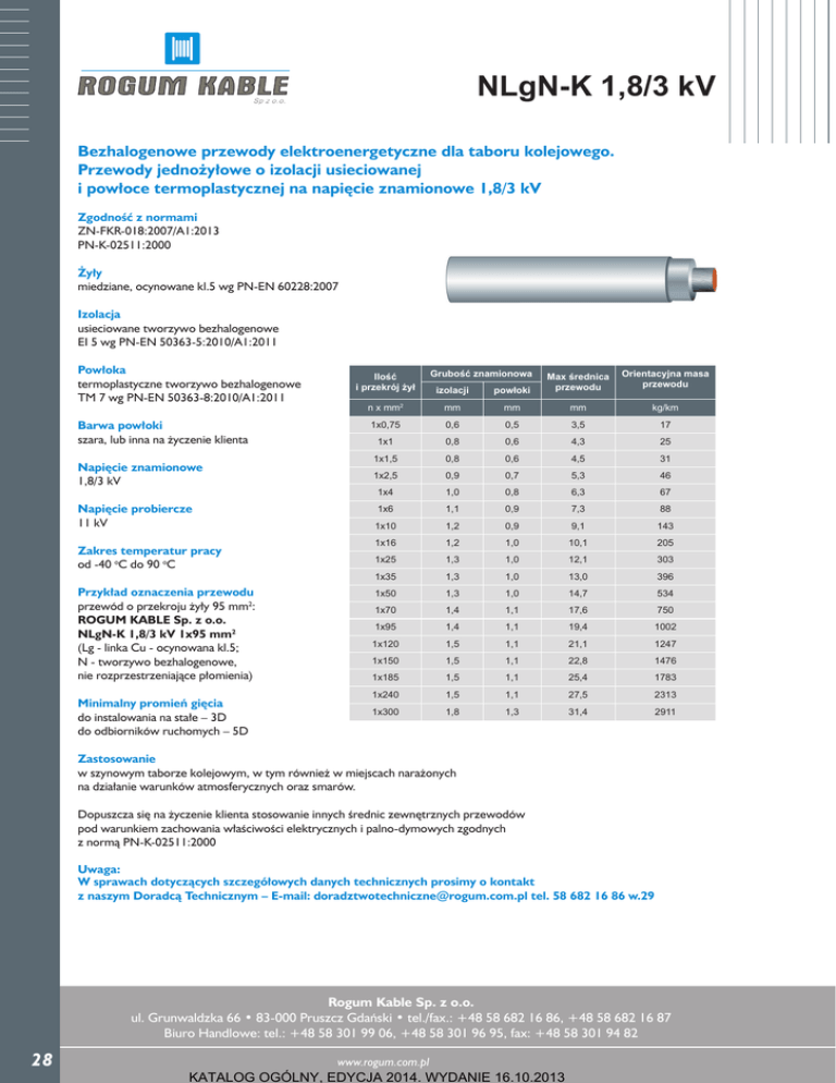 NLgN-K 1,8/3 kV Bezhalogenowe przewody elektroenergetyczne dla taboru kolejowego. Przewody jednożyłowe o izolacji usieciowanej i powłoce termoplastycznej na napięcie znamionowe 1,8/3 kV zgodność z normami ZN-FKR-018:2007/A1:2013 PN-K-02511:2000 Żyły miedziane, ocynowane kl.5 wg PN-EN 60228:2007 Izolacja usieciowane tworzywo bezhalogenowe EI 5 wg PN-EN 50363-5:2010/A1:2011 Powłoka termoplastyczne tworzywo bezhalogenowe TM 7 wg PN-EN 50363-8:2010/A1:2011 Barwa powłoki szara, lub inna na życzenie klienta napięcie znamionowe 1,8/3 kV napięcie probiercze 11 kV zakres temperatur pracy od -40 oC do 90 oC Przykład oznaczenia przewodu przewód o przekroju żyły 95 mm2: ROGUM KABLE Sp. z o.o. nLgn-K 1,8/3 kV 1x95 mm2 (Lg - linka Cu - ocynowana kl.5; N - tworzywo bezhalogenowe, nie rozprzestrzeniające płomienia) Minimalny promień gięcia do instalowania na stałe – 3D do odbiorników ruchomych – 5D Ilość i przekrój żył n x mm2 izolacji powłoki Max średnica przewodu Orientacyjna masa przewodu mm mm mm kg/km Grubość znamionowa 1x0,75 0,6 0,5 3,5 17 1x1 0,8 0,6 4,3 25 1x1,5 0,8 0,6 4,5 31 1x2,5 0,9 0,7 5,3 46 1x4 1,0 0,8 6,3 67 1x6 1,1 0,9 7,3 88 1x10 1,2 0,9 9,1 143 1x16 1,2 1,0 10,1 205 1x25 1,3 1,0 12,1 303 1x35 1,3 1,0 13,0 396 1x50 1,3 1,0 14,7 534 1x70 1,4 1,1 17,6 750 1x95 1,4 1,1 19,4 1002 1x120 1,5 1,1 21,1 1247 1x150 1,5 1,1 22,8 1476 1x185 1,5 1,1 25,4 1783 1x240 1,5 1,1 27,5 2313 1x300 1,8 1,3 31,4 2911 zastosowanie w szynowym taborze kolejowym, w tym również w miejscach narażonych na działanie warunków atmosferycznych oraz smarów. Dopuszcza się na życzenie klienta stosowanie innych średnic zewnętrznych przewodów pod warunkiem zachowania właściwości elektrycznych i palno-dymowych zgodnych z normą PN-K-02511:2000 Uwaga: w sprawach dotyczących szczegółowych danych technicznych prosimy o kontakt z naszym doradcą Technicznym – E-mail: [email protected] tel. 58 682 16 86 w.29 Rogum Kable Sp. z o.o. ul. Grunwaldzka 66 • 83-000 Pruszcz Gdański • tel./fax.: +48 58 682 16 86, +48 58 682 16 87 Biuro Handlowe: tel.: +48 58 301 99 06, +48 58 301 96 95, fax: +48 58 301 94 82 28 www.rogum.com.pl KATALOG OGÓLNY, EDYCJA 2014. WYDANIE 16.10.2013