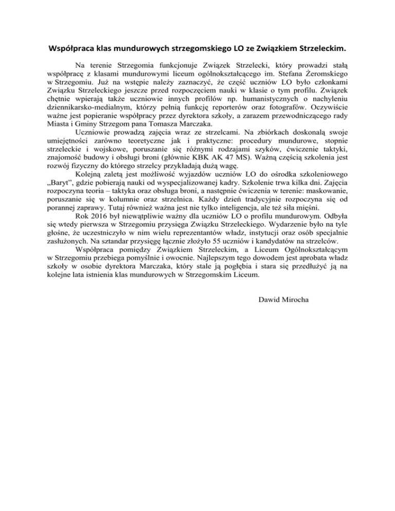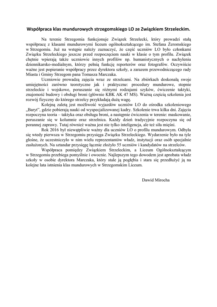 Współpraca klas mundurowych strzegomskiego LO ze Związkiem Strzeleckim. Na terenie Strzegomia funkcjonuje Związek Strzelecki, który prowadzi stałą współpracę z klasami mundurowymi liceum ogólnokształcącego im. Stefana Żeromskiego w Strzegomiu. Już na wstępie należy zaznaczyć, że część uczniów LO było członkami Związku Strzeleckiego jeszcze przed rozpoczęciem nauki w klasie o tym profilu. Związek chętnie wpierają także uczniowie innych profilów np. humanistycznych o nachyleniu dziennikarsko-medialnym, którzy pełnią funkcję reporterów oraz fotografów. Oczywiście ważne jest popieranie współpracy przez dyrektora szkoły, a zarazem przewodniczącego rady Miasta i Gminy Strzegom pana Tomasza Marczaka. Uczniowie prowadzą zajęcia wraz ze strzelcami. Na zbiórkach doskonalą swoje umiejętności zarówno teoretyczne jak i praktyczne: procedury mundurowe, stopnie strzeleckie i wojskowe, poruszanie się różnymi rodzajami szyków, ćwiczenie taktyki, znajomość budowy i obsługi broni (głównie KBK AK 47 MS). Ważną częścią szkolenia jest rozwój fizyczny do którego strzelcy przykładają dużą wagę. Kolejną zaletą jest możliwość wyjazdów uczniów LO do ośrodka szkoleniowego „Baryt”, gdzie pobierają nauki od wyspecjalizowanej kadry. Szkolenie trwa kilka dni. Zajęcia rozpoczyna teoria – taktyka oraz obsługa broni, a następnie ćwiczenia w terenie: maskowanie, poruszanie się w kolumnie oraz strzelnica. Każdy dzień tradycyjnie rozpoczyna się od porannej zaprawy. Tutaj również ważna jest nie tylko inteligencja, ale też siła mięśni. Rok 2016 był niewątpliwie ważny dla uczniów LO o profilu mundurowym. Odbyła się wtedy pierwsza w Strzegomiu przysięga Związku Strzeleckiego. Wydarzenie było na tyle głośne, że uczestniczyło w nim wielu reprezentantów władz, instytucji oraz osób specjalnie zasłużonych. Na sztandar przysięgę łącznie złożyło 55 uczniów i kandydatów na strzelców. Współpraca pomiędzy Związkiem Strzeleckim, a Liceum Ogólnokształcącym w Strzegomiu przebiega pomyślnie i owocnie. Najlepszym tego dowodem jest aprobata władz szkoły w osobie dyrektora Marczaka, który stale ją pogłębia i stara się przedłużyć ją na kolejne lata istnienia klas mundurowych w Strzegomskim Liceum. Dawid Mirocha