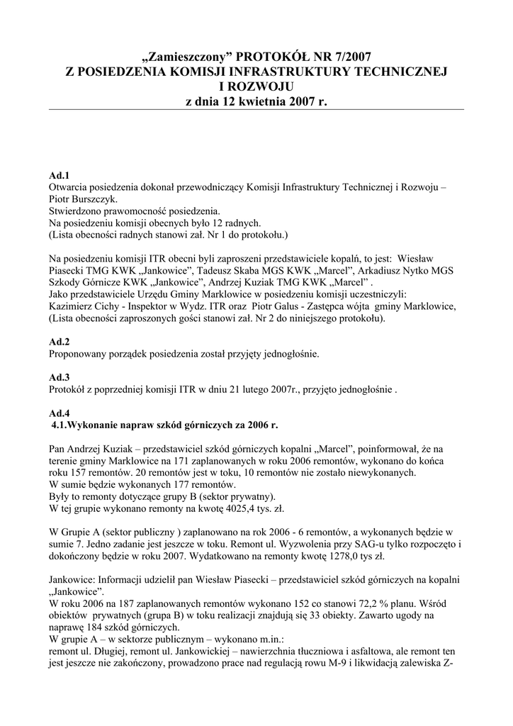 „Zamieszczony” PROTOKÓŁ NR 7/2007 Z POSIEDZENIA KOMISJI INFRASTRUKTURY TECHNICZNEJ I ROZWOJU z dnia 12 kwietnia 2007 r. Ad.1 Otwarcia posiedzenia dokonał przewodniczący Komisji Infrastruktury Technicznej i Rozwoju – Piotr Burszczyk. Stwierdzono prawomocność posiedzenia. Na posiedzeniu komisji obecnych było 12 radnych. (Lista obecności radnych stanowi zał. Nr 1 do protokołu.) Na posiedzeniu komisji ITR obecni byli zaproszeni przedstawiciele kopalń, to jest: Wiesław Piasecki TMG KWK „Jankowice”, Tadeusz Skaba MGS KWK „Marcel”, Arkadiusz Nytko MGS Szkody Górnicze KWK „Jankowice”, Andrzej Kuziak TMG KWK „Marcel” . Jako przedstawiciele Urzędu Gminy Marklowice w posiedzeniu komisji uczestniczyli: Kazimierz Cichy - Inspektor w Wydz. ITR oraz Piotr Galus - Zastępca wójta gminy Marklowice, (Lista obecności zaproszonych gości stanowi zał. Nr 2 do niniejszego protokołu). Ad.2 Proponowany porządek posiedzenia został przyjęty jednogłośnie. Ad.3 Protokół z poprzedniej komisji ITR w dniu 21 lutego 2007r., przyjęto jednogłośnie . Ad.4 4.1.Wykonanie napraw szkód górniczych za 2006 r. Pan Andrzej Kuziak – przedstawiciel szkód górniczych kopalni „Marcel”, poinformował, że na terenie gminy Marklowice na 171 zaplanowanych w roku 2006 remontów, wykonano do końca roku 157 remontów. 20 remontów jest w toku, 10 remontów nie zostało niewykonanych. W sumie będzie wykonanych 177 remontów. Były to remonty dotyczące grupy B (sektor prywatny). W tej grupie wykonano remonty na kwotę 4025,4 tys. zł. W Grupie A (sektor publiczny ) zaplanowano na rok 2006 - 6 remontów, a wykonanych będzie w sumie 7. Jedno zadanie jest jeszcze w toku. Remont ul. Wyzwolenia przy SAG-u tylko rozpoczęto i dokończony będzie w roku 2007. Wydatkowano na remonty kwotę 1278,0 tys zł. Jankowice: Informacji udzielił pan Wiesław Piasecki – przedstawiciel szkód górniczych na kopalni „Jankowice”. W roku 2006 na 187 zaplanowanych remontów wykonano 152 co stanowi 72,2 % planu. Wśród obiektów prywatnych (grupa B) w toku realizacji znajdują się 33 obiekty. Zawarto ugody na naprawę 184 szkód górniczych. W grupie A – w sektorze publicznym – wykonano m.in.: remont ul. Długiej, remont ul. Jankowickiej – nawierzchnia tłuczniowa i asfaltowa, ale remont ten jest jeszcze nie zakończony, prowadzono prace nad regulacją rowu M-9 i likwidacją zalewiska Z- 12. Nie wykonano regulacji rowu M-9 do końca i skutkiem tego pojawiło się zalewisko na ul. Długiej. Łącznie wykonano 9 zadań na kwotę – na kwotę 1503,3 tys. zł Z roku 2006 - 25 zadań remontowych przeszło do realizacji na rok 2007. Jedna sprawa jest w sądzie a większość spraw remontowych jest na ukończeniu. Na remontowanie sektora prywatnego wydatkowano łącznie 1047,7 tys. zł. (Wykazy dot. realizacji napraw szkód górniczych w roku 2006 i wykazy planowanych remontów na rok 2007 –stanowią załącznik nr 3 do niniejszego protokołu.) Radny Karwot zgłosił wniosek, aby omawiane materiały statystyczne były udostępnione radnym. Można oczywiście uważnie słuchać i notować, ale to nie jest to samo, co mieć przed sobą dokument. Inż. Kuziak powiedział, że oni wcześniej przesłali komplet dokumentów. Radny Karwot stwierdził, że swój wniosek kieruje do Zastępcy Wójta i chodzi o to, aby te dokumenty teraz były dostępne, bo my teraz je analizujemy. Zastępca Wójta odpowiedział, że można zrobić 5 minut przerwy i rozdać te materiały. (Po kilku minutach materiały zostały rozdane radnym). Ad.4.2. Plan napraw szkód górniczych na rok 2007: Kopalnia Marcel planuje na rok 2007 wykonanie 205 napraw w sektorze obiektów prywatnych (gruba B) na kwotę 4mln 395 tys. zł oraz 9 w obiektach sektora publicznego na kwotę 1mln 300 tys. zł. Kopalnia „Jankowice” na rok 2007 ma zaplanowany remont w 153 obiektach na kwotę 3 mln 291 tys. zł., oraz w 7 obiektach komunalnych na kwotę 1 mln 670 tys. zł. Kopalnia „Jankowice” wspólnie z kopalnią „Marcel” robiła w roku 2006 - naprawę zalewiska B-12. Natomiast w roku 2007 planowane jest systematyczne wypłacanie terenu o szerokości około 15 m wokół zalewiska po cenach zgodnych z ustawą o gospodarce gruntami. Kopalnie są gotowe wypłacić 10 ha gruntów. (7 ha – to jest powierzchnia zbiornika i 3 ha obszar wokół zbiornika). Obecnie prowadzone będą sprawy dot. podpisywania ugód z właścicielami. Ad. 4.3 Zmiany granic odpowiedzialności – pan Kuziak poinformował, że eksploatacja przesuwa się stopniowo w stronę północną. Nowe ugody dot. spraw prywatnych będą zawierane w Centrum Wydobywczym w Rybniku, ale te sprawy, które są już rozpoczęte będą kontynuowane tak jak dotąd. Przewodniczący Burszczyk zapytał, czy mieszkańcy są powiadomieni, że jest taka zmiana. Pan Kuziak odpowiedział, że gdy mieszkańcy napiszą do nich to zostaną powiadomieni o zmianie, a pismo zostanie przesłane do Centrum Wydobywczego. Radni wskazywali, aby zamieścić informację na ten temat w „Kurierze Marklowickim”. Radny Filipowski stwierdził, że na razie nie było mowy o wypłacie odszkodowań. Nas to interesuje, bo bardzo często podejmujemy decyzje o remontach lub budowie nowych dróg, a potem okazuje się, budynki tam są wypłacone i będą likwidowane. Inż. Kuziak odpowiedział, że nie jest w stanie dokładnie odpowiedzieć w tej sprawie. Kopalnia przygotowała harmonogram wypłat. Najpierw trzeba odszkodować budynki na Wilczku, zwłaszcza po południowej stronie ulicy Wyzwolenia, gdyż ta droga będzie dalej przebudowywana. Nie mam danych ile odszkodowaliśmy budynków w ubiegłym roku. Wiemy, że musimy dać tym ludziom trochę czasu na przygotowanie się. Radny Kocjan zapytał, czy kopalnia miała pozwolenie na zajęcie pasa drogowego przy frezowaniu nawierzchni drogi. Inż. Kuziak odpowiedział, że nie mieli takiego pozwolenia, chociaż zarządca drogi był poinformowany. Przewodniczący Br