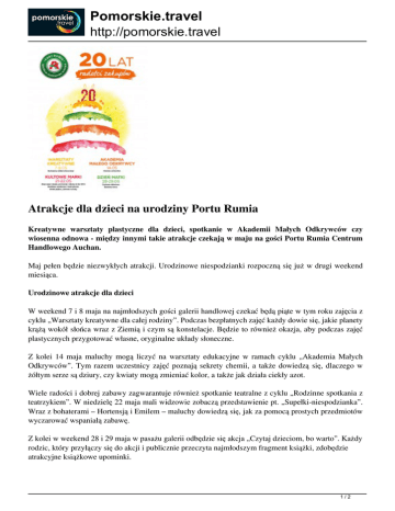 Pomorskie.travel http://pomorskie.travel Atrakcje dla dzieci na urodziny Portu Rumia Kreatywne warsztaty plastyczne dla dzieci, spotkanie w Akademii Małych Odkrywców czy wiosenna odnowa - między innymi takie atrakcje czekają w maju na gości Portu Rumia Centrum Handlowego Auchan. Maj pełen będzie niezwykłych atrakcji. Urodzinowe niespodzianki rozpoczną się już w drugi weekend miesiąca. Urodzinowe atrakcje dla dzieci W weekend 7 i 8 maja na najmłodszych gości galerii handlowej czekać będą piąte w tym roku zajęcia z cyklu „Warsztaty kreatywne dla całej rodziny”. Podczas bezpłatnych zajęć każdy dowie się, jakie planety krążą wokół słońca wraz z Ziemią i czym są konstelacje. Będzie to również okazja, aby podczas zajęć plastycznych przygotować własne, oryginalne układy słoneczne. Z kolei 14 maja maluchy mogą liczyć na warsztaty edukacyjne w ramach cyklu „Akademia Małych Odkrywców”. Tym razem uczestnicy zajęć poznają sekrety chemii, a także dowiedzą się, dlaczego w żółtym serze są dziury, czy kwiaty mogą zmieniać kolor, a także jak działa ciekły azot. Wiele radości i dobrej zabawy zagwarantuje również spotkanie teatralne z cyklu „Rodzinne spotkania z teatrzykiem”. W niedzielę 22 maja mali widzowie zobaczą przedstawienie pt. „Supełki-niespodzianka”. Wraz z bohaterami – Hortensją i Emilem – maluchy dowiedzą się, jak za pomocą prostych przedmiotów wyczarować wspaniałą zabawę. Z kolei w weekend 28 i 29 maja w pasażu galerii odbędzie się akcja „Czytaj dzieciom, bo warto”. Każdy rodzic, który przyłączy się do akcji i publicznie przeczyta najmłodszym fragment książki, zdobędzie atrakcyjne książkowe upominki. 1/2 Pomorskie.travel http://pomorskie.travel Katarzyna Lenczewska 2/2 Powered by TCPDF (www.tcpdf.org)