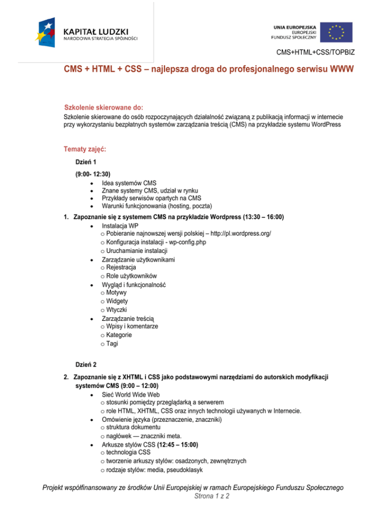 CMS+HTML+CSS/TOPBIZ CMS + HTML + CSS – najlepsza droga do profesjonalnego serwisu WWW Szkolenie skierowane do: Szkolenie skierowane do osób rozpoczynających działalność związaną z publikacją informacji w internecie przy wykorzystaniu bezpłatnych systemów zarządzania treścią (CMS) na przykładzie systemu WordPress Tematy zajęć: Dzień 1 (9:00- 12:30) Idea systemów CMS Znane systemy CMS, udział w rynku Przykłady serwisów opartych na CMS Warunki funkcjonowania (hosting, poczta) 1. Zapoznanie się z systemem CMS na przykładzie Wordpress (13:30 – 16:00) Instalacja WP o Pobieranie najnowszej wersji polskiej – http://pl.wordpress.org/ o Konfiguracja instalacji - wp-config.php o Uruchamianie instalacji Zarządzanie użytkownikami o Rejestracja o Role użytkowników Wygląd i funkcjonalność o Motywy o Widgety o Wtyczki Zarządzanie treścią o Wpisy i komentarze o Kategorie o Tagi Dzień 2 2. Zapoznanie się z XHTML i CSS jako podstawowymi narzędziami do autorskich modyfikacji systemów CMS (9:00 – 12:00) Sieć World Wide Web o stosunki pomiędzy przeglądarką a serwerem o role HTML, XHTML, CSS oraz innych technologii używanych w Internecie. Omówienie języka (przeznaczenie, znaczniki) o struktura dokumentu o nagłówek — znaczniki meta. Arkusze stylów CSS (12:45 – 15:00) o technologia CSS o tworzenie arkuszy stylów: osadzonych, zewnętrznych o rodzaje stylów: media, pseudoklasyk Projekt współfinansowany ze środków Unii Europejskiej w ramach Europejskiego Funduszu Społecznego Strona 1 z 2 CMS+HTML+CSS/TOPBIZ CMS + HTML + CSS – najlepsza droga do profesjonalnego serwisu WWW o budowa stylów: styl obiektu, klasa, identyfikator. Formatowanie tekstu (15:15 – 16:00) o tytuły o wyróżnienia o pismo: krój, kolor, wielkość o listy: nieuporządkowana, uporządkowana — menu. Dzień 3 Grafika i CSS (9:00 – 10:30) o osadzanie grafiki w dokumencie o formatowanie grafiki: wielkość obrazka, oblewanie tekstem. o zastosowanie praktyczne: tworzenie galerii o zastosowanie praktyczne: pozycjonowanie w tle o zastosowanie praktyczne: tworzenie dynamicznych pasków nawigacji (bez JS). Odsyłacze (linki) (10:45 – 12:30) Tabele (13:00 – 14:30) o prezentacja danych tabelarycznych o formatowanie elementów tabel. Tworzenie układu strony (14:45 – 16:00) Dzień 4 Formularze (9:00 – 10:30) o cel użycia formularzy o budowa formularza o rodzaje pól. Tryby kaskadowe (10:45 – 12:30) Typy elementów CSS (13:00 – 14:30) Pozycjonowanie elementów strony za pomocą CSS (14:45 – 16:00) Dzień 5 Pozycjonowanie a warstwy (9:00 – 12:00) Różnice w interpretacji CSS pomiędzy standardowymi przeglądarkami (12:45 – 15:00) o stosowanie obejść o zastępowanie mechanizmów. Modyfikacja przykładowego szablonu z WordPress’a przy użyciu (X)HTML i CSS (15:15 – 16:00) Korzyści wynikające z ukończenia szkolenia: Zapoznanie się z podstawami administracji i użytkowania systemu CMS na przykładzie WordPress. Umiejętność efektywnego wykorzystania zaawansowanych możliwości XHTML i CSS do modyfikowania serwisów WWW o złożonej strukturze. Metody szkolenia: wykład + warsztaty Czas trwania: 5 dni Projekt współfinansowany ze środków Unii Europejskiej w ramach Europejskiego Funduszu Społecznego Strona 2 z 2