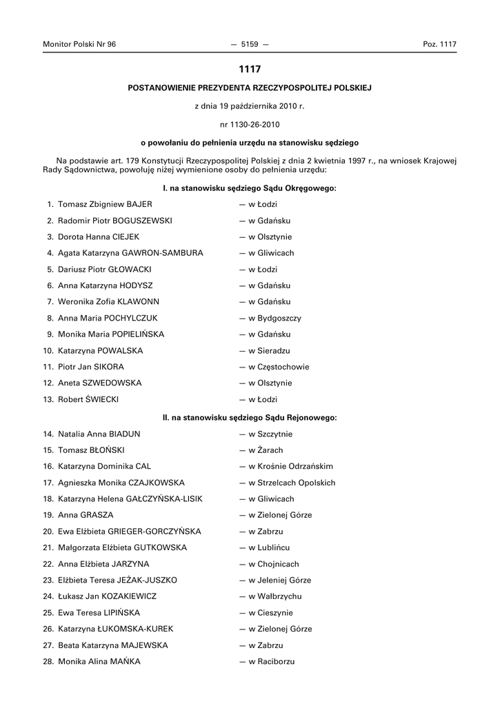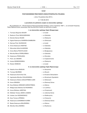 Monitor Polski Nr 96 — 5159 — Poz. 1117 1117 POSTANOWIENIE PREZYDENTA RZECZYPOSPOLITEJ POLSKIEJ z dnia 19 października 2010 r. nr 1130-26-2010 o powołaniu do pełnienia urzędu na stanowisku sędziego Na podstawie art. 179 Konstytucji Rzeczypospolitej Polskiej z dnia 2 kwietnia 1997 r., na wniosek Krajowej Rady Sądownictwa, powołuję niżej wymienione osoby do pełnienia urzędu: I. na stanowisku sędziego Sądu Okręgowego: 1. Tomasz Zbigniew BAJER — w Łodzi 2. Radomir Piotr BOGUSZEWSKI — w Gdańsku 3. Dorota Hanna CIEJEK — w Olsztynie 4. Agata Katarzyna GAWRON-SAMBURA — w Gliwicach 5. Dariusz Piotr GŁOWACKI — w Łodzi 6. Anna Katarzyna HODYSZ — w Gdańsku 7. Weronika Zofia KLAWONN — w Gdańsku 8. Anna Maria POCHYLCZUK — w Bydgoszczy 9. Monika Maria POPIELIŃSKA — w Gdańsku 10. Katarzyna POWALSKA — w Sieradzu 11. Piotr Jan SIKORA — w Częstochowie 12. Aneta SZWEDOWSKA — w Olsztynie 13. Robert ŚWIECKI — w Łodzi II. na stanowisku sędziego Sądu Rejonowego: 14. Natalia Anna BIADUN — w Szczytnie 15. Tomasz BŁOŃSKI — w Żarach 16. Katarzyna Dominika CAL — w Krośnie Odrzańskim 17. Agnieszka Monika CZAJKOWSKA — w Strzelcach Opolskich 18. Katarzyna Helena GAŁCZYŃSKA-LISIK — w Gliwicach 19. Anna GRASZA — w Zielonej Górze 20. Ewa Elżbieta GRIEGER-GORCZYŃSKA — w Zabrzu 21. Małgorzata Elżbieta GUTKOWSKA — w Lublińcu 22. Anna Elżbieta JARZYNA — w Chojnicach 23. Elżbieta Teresa JEŻAK-JUSZKO — w Jeleniej Górze 24. Łukasz Jan KOZAKIEWICZ — w Wałbrzychu 25. Ewa Teresa LIPIŃSKA — w Cieszynie 26. Katarzyna ŁUKOMSKA-KUREK — w Zielonej Górze 27. Beata Katarzyna MAJEWSKA — w Zabrzu 28. Monika Alina MAŃKA — w Raciborzu Monitor Polski Nr 96 — 5160 — 29. Romana Helena METELICA — we Wschowie 30. Robert NOWOTNIAK — w Siedlcach 31. Anna Marta PASICH — w Gliwicach 32. Krzysztof POŁOMSKI — w Piszu 33. Mariusz PTASZYŃSKI — w Siedlcach 34. Małgorzata SĄSIADEK — w Gliwicach 35. Ewelina Patrycja SERAFIN — w Rudzie Śląskiej 36. Olga Barbara SMUDA — w Nowej Soli 37. Izabela Agnieszka SZOT-HUREJ — w Muszynie 38. Anita ŻURALSKA — w Nowym Mieście Lubawskim Poz. 1117 Prezydent Rzeczypospolitej Polskiej: B. Komorowski