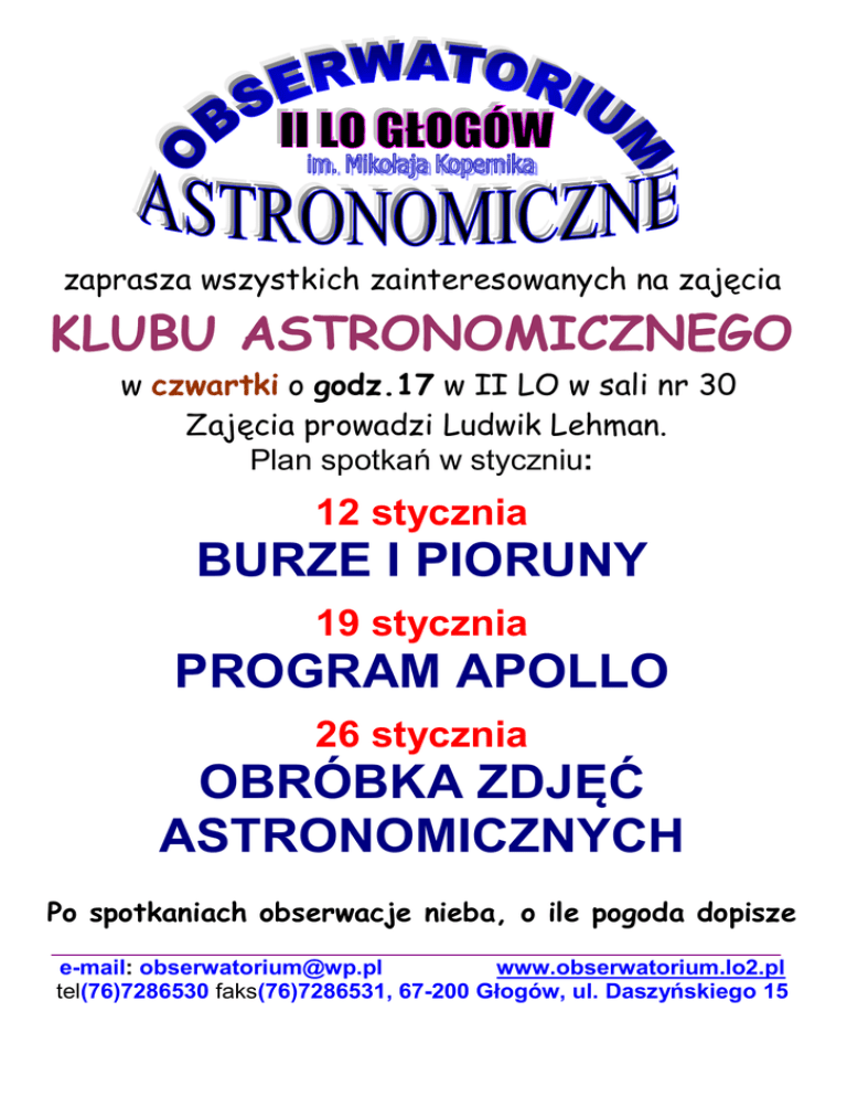 zaprasza wszystkich zainteresowanych na zajęcia KLUBU ASTRONOMICZNEGO w czwartki o godz.17 w II LO w sali nr 30 Zajęcia prowadzi Ludwik Lehman. Plan spotkań w styczniu: 12 stycznia BURZE I PIORUNY 19 stycznia PROGRAM APOLLO 26 stycznia OBRÓBKA ZDJĘĆ ASTRONOMICZNYCH Po spotkaniach obserwacje nieba, o ile pogoda dopisze e-mail: [email protected] www.obserwatorium.lo2.pl tel(76)7286530 faks(76)7286531, 67-200 Głogów, ul. Daszyńskiego 15