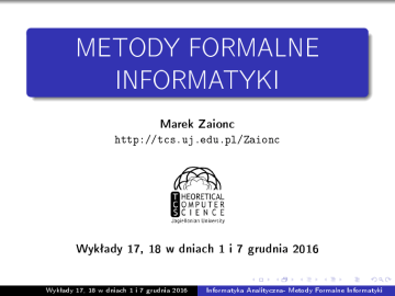 METODY FORMALNE INFORMATYKI Marek Zaionc http://tcs.uj.edu.pl/Zaionc Wykªady 17, 18 w dniach 1 i 7 grudnia 2016 Wykªady 17, 18 w dniach 1 i 7 grudnia 2016 Informatyka Analityczna- Metody Formalne Informatyki METODY FORMALNE INFORMATYKI Marek Zaionc http://tcs.uj.edu.pl/Zaionc Wykªady 17, 18 w dniach 1 i 7 grudnia 2016 Wykªady 17, 18 w dniach 1 i 7 grudnia 2016 Informatyka Analityczna- Metody Formalne Informatyki Przeliczalno±¢ Twierdzenie Zbiory liczb caªkowitych i wymiernych s¡ przeliczalne. Wykªady 17, 18 w dniach 1 i 7 grudnia 2016 Informatyka Analityczna- Metody Formalne Informatyki Nieprzeliczalno±¢ R Twierdzenie (Cantora) Zbiór liczb rzeczywistych nie jest przeliczalny. Wykªady 17, 18 w dniach 1 i 7 grudnia 2016 Informatyka Analityczna- Metody Formalne Informatyki Porównywanie mocy zbiorów Denicja . A ≤m B A <m B f : A → B. A ≤m B i nieprawda »e A ∼m B . wtw istnieje iniekcja wtw Wykªady 17, 18 w dniach 1 i 7 grudnia 2016 Informatyka Analityczna- Metody Formalne Informatyki Porównywanie mocy zbiorów Twierdzenie A ≤m B A ≤m B A <m B 1 2 3 (Nast¦puj¡ce warunki s¡ równowa»ne:) i B ≤m A to A ∼m B . i B ⊂ A to A ∼m B . i B <m C to A <m C . Wykªady 17, 18 w dniach 1 i 7 grudnia 2016 Informatyka Analityczna- Metody Formalne Informatyki Twierdzenie Cantora Bernsteina Twierdzenie (Cantora - Bernsteina) Je»eli A ≤m B i B ≤m A to A ∼m B . Wykªady 17, 18 w dniach 1 i 7 grudnia 2016 Informatyka Analityczna- Metody Formalne Informatyki Twierdzenie Cantora Twierdzenie (Cantora ) A <m P(A). Wykªady 17, 18 w dniach 1 i 7 grudnia 2016 Informatyka Analityczna- Metody Formalne Informatyki Efekty twierdze« porównawczych Twierdzenie (Cantora ) Nie istnieje zbiór wszystkich zbiorów. Wykªady 17, 18 w dniach 1 i 7 grudnia 2016 Informatyka Analityczna- Metody Formalne Informatyki Twierdzenie Ka»dy zbiór niesko«czony zawiera podzbiór przeliczalny równoliczny z Wykªady 17, 18 w dniach 1 i 7 grudnia 2016 N. Informatyka Analityczna- Metody Formalne Informatyki Denicja Zbiór nazywamy nieprzeliczalnym gdy nie jest przeliczalny. Wykªady 17, 18 w dniach 1 i 7 grudnia 2016 Informatyka Analityczna- Metody Formalne Informatyki Dowody przek¡tniowe Twierdzenie N N Zbiory 2 oraz N nie s¡ przeliczalne. Wykªady 17, 18 w dniach 1 i 7 grudnia 2016 Informatyka Analityczna- Metody Formalne Informatyki Zbiory mocy continuum Denicja Mówimy »e zbiór jest mocy continuum gdy jest równoliczny z R. Wykªady 17, 18 w dniach 1 i 7 grudnia 2016 Informatyka Analityczna- Metody Formalne Informatyki Zbiory mocy continuum Lemat Ka»dy przedziaª obustronnie otwarty jest mocy continuum. Wykªady 17, 18 w dniach 1 i 7 grudnia 2016 Informatyka Analityczna- Metody Formalne Informatyki Zbiory mocy continuum Lemat Je»eli A ⊂ R i A zawiera A jest mocy continuum. Wykªady 17, 18 w dniach 1 i 7 grudnia 2016 pewien przedziaª otwarty to Informatyka Analityczna- Metody Formalne Informatyki Zbiory mocy continuum Lemat Je»eli B ⊂ A jest przeliczalnym podzbiorem zbioru mocy continuum to A\B Wykªady 17, 18 w dniach 1 i 7 grudnia 2016 A jest mocy continuum Informatyka Analityczna- Metody Formalne Informatyki Zbiory mocy continuum Lemat Je»eli B jest przeliczalnym a A jest to A ∪ B jest mocy continuum. Wykªady 17, 18 w dniach 1 i 7 grudnia 2016 mocy continuum Informatyka Analityczna- Metody Formalne Informatyki Zbiory mocy continuum Twierdzenie 2N jest mocy continuum. Wykªady 17, 18 w dniach 1 i 7 grudnia 2016 Informatyka Analityczna- Metody Formalne Informatyki N <m R Twierdzenie N <m P(N) ∼m 2N ∼m R Wykªady 17, 18 w dniach 1 i 7 grudnia 2016 Informatyka Analityczna- Metody Formalne Informatyki Hipoteza continuum Hipoteza continuum. Kurt Gödel 1940 Hipoteza continuum jest niesprzeczno±¢ z aksjomatami teorii mnogo±ci. Paul Cohen 1963 Hipoteza continuum jest niezale»no±¢ od aksjomatów teorii mnogo±ci. Wykªady 17, 18 w dniach 1 i 7 grudnia 2016 Informatyka Analityczna- Metody Formalne Informatyki Niesko«czono±¢ Dedekinda Denicja (niesko«czono±ci Dedekinda) Zbiór X jest niesko«czony w sensie Dedekinda gdy istnieje podzbiór wªa±ciwy X0 zbioru X który jest z nim równoliczny. Twierdzenie X jest niesko«czony wtw gdy jest niesko«czony w sensie Dedekinda. Wykªady 17, 18 w dniach 1 i 7 grudnia 2016 Informatyka Analityczna- Metody Formalne Informatyki
