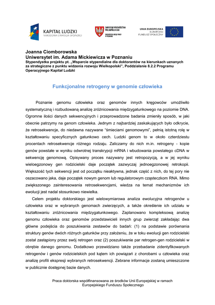 Joanna Ciomborowska Uniwersytet im. Adama Mickiewicza w Poznaniu Stypendystka projektu pt. „Wsparcie stypendialne dla doktorantów na kierunkach uznanych za strategiczne z punktu widzenia rozwoju Wielkopolski”, Poddziałanie 8.2.2 Programu Operacyjnego Kapitał Ludzki Funkcjonalne retrogeny w genomie człowieka Poznanie genomu człowieka oraz genomów innych kręgowców umożliwiło systematyczną i rozbudowaną analizę zróżnicowania międzygatunkowego na poziomie DNA. Ogromne ilości danych sekwencyjnych i przeprowadzone badania zmieniły sposób, w jaki obecnie patrzymy na genom człowieka. Jednym z najbardziej zaskakujących było odkrycie, że retrosekwencje, do niedawna nazywane “śmieciami genomowymi”, pełnią istotną rolę w kształtowaniu specyficznych gatunkowo cech. Ludzki genom to w około czterdziestu procentach retrosekwencje różnego rodzaju. Zaliczamy do nich m.in. retrogeny - kopie genów powstałe w wyniku odwrotnej transkrypcji mRNA i wbudowania powstałego cDNA w sekwencję genomową. Opisywany proces nazywany jest retropozycją, a w jej wyniku wieloegzonowy gen rodzicielski daje początek zazwyczaj jednoegzonowej retrokopii. Większość tych sekwencji jest od początku nieaktywna, jednak część z nich, do tej pory nie oszacowano jaka, daje początek nowym genom lub regulatorowym cząsteczkom RNA. Mimo zwiększonego zainteresowania retrosekwencjami, wiedza na temat mechanizmów ich ewolucji jest nadal stosunkowo niewielka. Celem projektu doktorskiego jest wielowymiarowa analiza ewolucyjna retrogenów u człowieka oraz w wybranych genomach zwierzęcych, a także określenie ich udziału w kształtowaniu zróżnicowania międzygatunkowego. Zaplanowano kompleksową analizę genomu człowieka oraz genomów przedstawicieli innych grup zwierząt zakładając dwa główne podejścia do poszukiwania zestawów do badań: (1) na podstawie porównania struktury genów dwóch różnych gatunków przy założeniu, że w toku ewolucji gen rodzicielski został zastąpiony przez swój retrogen oraz (2) poszukiwanie par retrogen-gen rodzicielski w obrębie danego genomu. Dodatkowo przewidziano także przebadanie zidentyfikowanych retrogenów i genów rodzicielskich pod kątem ich powiązań z chorobami u człowieka oraz analizę profili ekspresji wybranych retrosekwencji. Zebrane informacje zostaną umieszczone w publicznie dostępnej bazie danych. Praca doktorska współfinansowana ze środków Unii Europejskiej w ramach Europejskiego Funduszu Społecznego Pomimo zaawansowania biologii molekularnej dalecy jesteśmy od zrozumienia genetycznych podstaw wielu chorób. Jednym z poważniejszych problemów jest to, że wyniki badań na zwierzętach modelowych stosunkowo rzadko przekładają się na sukcesy w badaniach klinicznych. Jednym z najistotniejszych czynników wpływających na zróżnicowanie międzygatunkowe jest powstawanie nowych, specyficznych dla danego gatunku genów. Źródłem takich właśnie genów są, uważane przez długi czas za “śmieci genomowe”, retrogeny. Poznawanie różnic międzygatunkowych staje się więc naturalną potrzebą w obliczu wielu badań medycznych, szczególnie tych związanych z podłożem chorób genetycznych. Warto zauważyć, że wyniki naszych analiz są istotnie nie tylko z punktu widzenia genomiki porównawczej, ale przede wszystkim mogą być wykorzystane przez inne jednostki naukowo-badawcze w województwie wielkopolskim, a także firmy farmaceutyczne. Informacja dotycząca międzygatunkowego zróżnicowania genów może mieć kluczowe znaczenie w projektowaniu eksperymentów biologicznych i medycznych. Stworzenie w ramach projektu bazy danych retrogenów pozwoli usystematyzować istniejącą wiedzę i ułatwi dostęp wielu badaczom do informacji. Będzie to pierwsza tego typu baza danych w Wielkopolsce, jak i w Polsce, wpłynie więc znacząco na promowanie rejonu w kraju i za granicą oraz będzie stanowiła znakomite narzędzie edukacyjne dla studentów wyższych uczelni na terenie naszego województwa. Warto też zaznaczyć, że wyniki uzyskane w trakcie realizacji projektu doktoranckiego będą opublikowane w czasopismach o ogólnoświatowym zasięgu. Wpłynie to w istotny sposób na promowanie Wielkopolski i prowadzonych tu badań. Podsumowując, zaplanowane i zrealizowane już w ramach pracy doktorskiej analizy pozwolą znacząco wzbogacić istniejącą na ten temat wiedzę, zidentyfikować nowe funkcjonalne retrogeny, a także znaleźć te, które mogą mieć powiązania ze znanymi chorobami u ludzi. Wyniki naszych analiz będą istotnie nie tylko z punktu widzenia bioinformatyki czy genomiki porównawczej, ale i w dziedzinie medycyny, czy genetyki. Opracowane, scharakteryzowane i opisane podczas realizacji projektu metody bioinformatyczne, a także umiejętność posługiwania się szeroką gamą narzędzi mogą stać się obiektem zainteresowania różnych przedsiębiorców na terenie województwa wielkopolskiego. Dodatkowa możliwość praktycznego zastosowania wyników badań opisywanego projektu doktorskiego przejawia się poprzez organizowanie szkoleń, konferencji, prowadzenie konsultacji naukowych w różnych ośrodkach badawczych oraz przedsiębiorstwach. Zaplanowane działania, opracowanie metod, wykorzystanie wielu narzędzi i poruszenie nowych aspektów analiz sprawiają, że projekt jest znaczący dla rozwoju województwa wielkopolskiego. Praca doktorska współfinansowana ze środków Unii Europejskiej w ramach Europejskiego Funduszu Społecznego