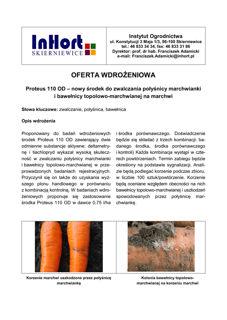 Instytut Ogrodnictwa ul. Konstytucji 3 Maja 1/3, 96-100 Skierniewice tel.: 46 833 34 34, fax: 46 833 31 86 Dyrektor: prof. dr hab. Franciszek Adamicki e-mail: [email protected] OFERTA WDROŻENIOWA Proteus 110 OD – nowy środek do zwalczania połyśnicy marchwianki i bawełnicy topolowo-marchwianej na marchwi Słowa kluczowe: zwalczanie, połyśnica, bawełnica Opis wdrożenia Proponowany do badań wdrożeniowych środek Proteus 110 OD zawierający dwie odmienne substancje aktywne: deltametrynę i tiachlopryd wykazał wysoką skuteczność w zwalczaniu połyśnicy marchwianki i bawełnicy topolowo-marchwianej w przeprowadzonych badaniach rejestracyjnych. Przyczynił się on także do uzyskania wyższego plonu handlowego w porównaniu z kombinacją kontrolną. W badaniach wdrożeniowych proponuje się zastosowanie środka Proteus 110 OD w dawce 0,75 l/ha i środka porównawczego. Doświadczenie będzie się składać z trzech kombinacji: badanego środka, środka porównawczego i kontroli) Każda kombinacja wystąpi w czterech powtórzeniach. Termin zabiegu będzie określony na podstawie sygnalizacji. Analizie będą podlegać korzenie podczas zbioru, w liczbie 100 sztuk/powtórzenie. Korzenie będą oceniane względem obecności na nich bawełnicy topolowo-marchwianej i uszkodzeń spowodowanych przez połyśnicę marchwiankę. l Korzenie marchwi uszkodzone przez połyśnicę marchwiankę Kolonia bawełnicy topolowomarchwianej na korzeniu marchwi Innowacyjność wdrożeniowa – efekty gospodarcze i społeczne Badania przyczynią się do sprawniejszej kontroli populacji szkodników w uprawie marchwi. Pośrednio pozwolą na ograniczenie zużycia środków ochrony roślin i wystąpienia ras odpornych na stosowane obecnie insektycydy, a w dalszej konsekwencji produkcji żywności lepszej jakości, wolnej od pozostałości stosowanych środków ochrony. Podmioty, do których skierowana jest oferta wdrożeniowa Ośrodki doradztwa rolniczego z rejonów, gdzie jest uprawiana marchew i występują problemy z ochroną przed połyśnicą marchwianką i bawełnicą topolowo-marchwianą Twórcy oferty wdrożeniowej: Zakład Ochrony Roślin Warzywnych Autor: mgr. inż. Andrzej Lewandowski tel. 46 833 33 33 e-mail: [email protected] Współautor: mgr inż. Dariusz Rybczyński