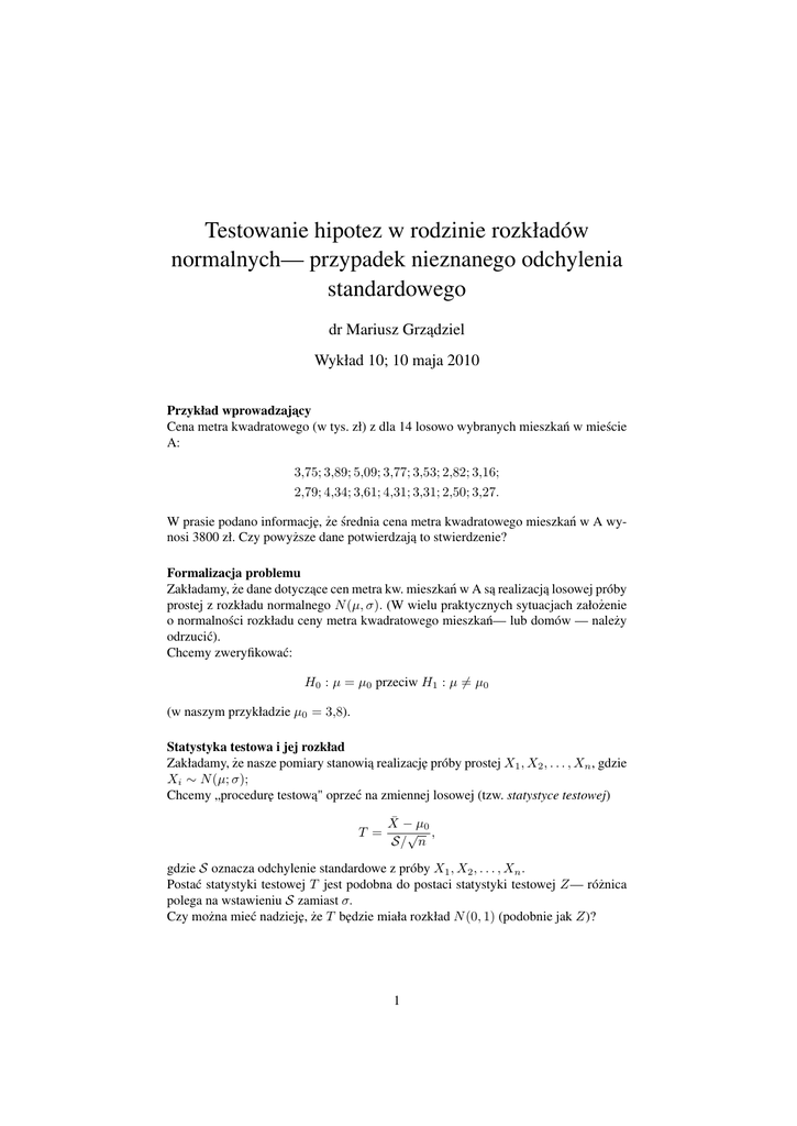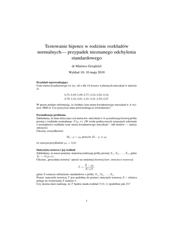 Testowanie hipotez w rodzinie rozkładów normalnych— przypadek nieznanego odchylenia standardowego dr Mariusz Grzadziel ˛ Wykład 10; 10 maja 2010 Przykład wprowadzajacy ˛ Cena metra kwadratowego (w tys. zł) z dla 14 losowo wybranych mieszkań w mieście A: 3,75; 3,89; 5,09; 3,77; 3,53; 2,82; 3,16; 2,79; 4,34; 3,61; 4,31; 3,31; 2,50; 3,27. W prasie podano informacj˛e, że średnia cena metra kwadratowego mieszkań w A wynosi 3800 zł. Czy powyższe dane potwierdzaja˛ to stwierdzenie? Formalizacja problemu Zakładamy, że dane dotyczace ˛ cen metra kw. mieszkań w A sa˛ realizacja˛ losowej próby prostej z rozkładu normalnego N (µ, σ). (W wielu praktycznych sytuacjach założenie o normalności rozkładu ceny metra kwadratowego mieszkań— lub domów — należy odrzucić). Chcemy zweryfikować: H0 : µ = µ0 przeciw H1 : µ 6= µ0 (w naszym przykładzie µ0 = 3,8). Statystyka testowa i jej rozkład Zakładamy, że nasze pomiary stanowia˛ realizacj˛e próby prostej X1 , X2 , . . . , Xn , gdzie Xi ∼ N (µ; σ); Chcemy „procedur˛e testowa" ˛ oprzeć na zmiennej losowej (tzw. statystyce testowej) T = X̄ − µ0 √ , S/ n gdzie S oznacza odchylenie standardowe z próby X1 , X2 , . . . , Xn . Postać statystyki testowej T jest podobna do postaci statystyki testowej Z— różnica polega na wstawieniu S zamiast σ. Czy można mieć nadziej˛e, że T b˛edzie miała rozkład N (0, 1) (podobnie jak Z)? 1 0 1 2 3 4 Histogram dla z 2.5 3.0 3.5 4.0 4.5 5.0 z Rysunek 1: Histogram liczebności dla danych dotyczacych ˛ ceny metra kw. mieszkań w A, wyrażonych w tys. zł; dane sa˛ zapisane w zmiennej z 0.2 0.0 0.1 y 0.3 0.4 Rozkład statystyki testowej T Można pokazać, że statystyka testowa T ma rozkład t-Studenta z n − 1 stopniami swobody; udowodnił to W. Gosset (pseudonim Student) na poczatku ˛ XX w. Wykres g˛estości rozkładu t-Studenta z n − 1 stopniami swobody jest „spłaszczony” w stosunku do wykresu g˛estości rozkładu normalnego N (0, 1) (por. Rys. 1). Analityczne określenie g˛estości rozkładu t-Studenta wymaga znajomości funkcji gamma (definiuje si˛e ja˛ za pomoca˛ odpowiedniej całki niekoreślonej por. ksia˛żk˛e J. Koronackiego i J. Mielniczuka, str. 201). −3 −2 −1 0 1 2 3 x Rysunek 2: Wykresy g˛estości rozkładów normalnych: normalnego N (0, 1) (linia cia˛ gła), t-Studenta z dwoma 4 st. swobody (linia „kreskowana”), t-Studenta z 12 st. swobody (linia „kropkowana”). Obszar krytyczny 2 Dla ustalonego poziomu istotności α i hipotezy alternatywnej H1 obszar krytyczny ma postać: (−∞, −t1−α/2,n−1 ] ∪ [t1−α/2,n−1 , ∞) gdzie t1−α/2,n−1 oznacza kwantyl rz˛edu 1−α/2 rozkładu t-Studenta z n−1 stopniami swobody. Definicja 1. Kwantylem rz˛edu u, u ∈ (0, 1), rozkładu typu ciagłego ˛ z funckja˛ g˛estości g dodatnia˛ na przedziale I i równa˛ zeru poza tym przedziałem, b˛edziemy nazywali liczb˛e cu spełniajac ˛ a˛ równość: F (cu ) = u, Rt gdzie F jest dystrybuanta˛ rozkładu (tj. F (t) = −∞ g(x)dx). Przykład— obliczenia Chcemy zweryfikować hipotez˛e H0 : µ = 3,8 przeciw H1 : µ 6= 3,8 przyjmujac ˛ poziom istotności α = 0,05. Znajdujemy w tablicach lub obliczamy korzystajac ˛ z pakietu statystycznego (np. R-a): t1−0,05/2;13 = t0,975;13 ≈ 2,160 Obszar krytyczny jest wi˛ec równy: (−∞; −2,160] ∪ [2,160; ∞). Obliczenia— c.d. Obliczamy t, wartość statystyki testowej T : t= 3,581 − 3,8 x̄ − µ0 √ = √ ≈ −1,18. s/ n 0.694/ 14 Wartość statystyki testowej t nie należy do obszaru krytycznego— nie ma podstaw do odrzucenia H0 i przyj˛ecia hipotezy H1 przy przyj˛etym poziomie istotności α = 0,05. p-wartość jest równa: 2 × (1 − F (1,18)) ≈ 0,26 gdzie F oznacza dystrybuant˛e rozkładu t-Studenta z 13 stopniami swobody. Hipotezy alternatywne jednostronne W przypadku, gdy hipoteza alternatywna jest prawostronna, tj. gdy testujemy 0 H0 : µ = µ0 przeciw H1 : µ > µ0 obszar krytyczny ma postać [t1−α,n−1 , ∞); analogicznie, gdy weryfikujemy 00 H0 : µ = µ0 przeciw H1 : µ < µ0 obszar krytyczny ma postać (−∞, −t1−α,n−1 ]. 3 Przykład— obliczenia w środowisku R Obliczamy ceny metra kw. w 14 mieszkaniach w mieście A i zapisujemy je w zmiennej z z<-c(3.75,3.89,5.09,3.77,3.53,2.82,3.16,2.79, 4.34,3.61,4.31,3.31,2.50,3.27) Przykład— obliczenia w środowisku R— c.d. Nast˛epnie wydajemy polecenie t.test z odpowiednimi parametrami: > t.test(z,mu=3.8) One Sample t-test data: z t = -1.1777, df = 13, p-value = 0.26 alternative hypothesis: true mean is not equal to 3.8 95 percent confidence interval: 3.180491 3.982366 sample estimates: mean of x 3.581429 Obliczenia— sa˛ wykonane dokładniej (z mniejszymi bł˛edami zaokragleń) ˛ niż uprzednio przedstawione rachunki; wartość statystyki testowej t = −1,1777; df — degrees of freedom– liczba stopni swobody; p-value (p-wartośc): 0,26 95 percent confidence interval:- 95-procentowy przedział ufności- przedziałom ufności b˛edzie poświ˛econy nast˛epny wykład. Polecana literatura Balasubramanian Narasimhan, Student’s T Distribution, http://www-stat.stanford.edu/ naras/jsm/TDensity/TDensity.html J. Koronacki i J. Mielniczuk, Statystyka dla studentów kierunków technicznych i przyrodniczych, WNT 2001, str. 228–229. 4