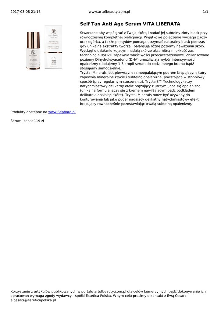 2017-03-08 21:16 www.artofbeauty.com.pl 1/1 Self Tan Anti Age Serum VITA LIBERATA Stworzone aby współgrać z Twoją skórą i nadać jej subtelny złoty blask przy równoczesnej kompletnej pielęgnacji. Wyjątkowe połączenie wyciągu z róży oraz ogórka, a także peptydów pomaga utrzymać naturalny blask podczas gdy unikalne ekstrakty tworzą i balansują różne poziomy nawilżenia skóry. Wyciągi o działaniu kojącym nadają skórze aksamitną miękkość zaś technologia HyH2O zapewnia właściwości przeciwstarzeniowe. Zbilansowane poziomy Dihydroksyacetonu (DHA) umożliwiają wybór intensywności opalenizny (dodajemy 1-3 kropli serum do codziennego kremu bądź stosujemy samodzielnie). Trystal Minerals jest pierwszym samoopalającym pudrem brązującym który zapewnia mineralne krycie i subtelną opaleniznę, powstającą w stopniowy sposób (przy regularnym stosowaniu). Trystal3™ Technology łączy natychmiastowy delikatny efekt brązujący z utrzymującą się opalenizną (unikalna formuła łączy się z kremem nawilżającym bądź podkładem delikatnie opalając skórę). Trystal Minerals może być używany do konturowania lub jako puder nadający delikatny natychmiastowy efekt brązujący równocześnie pozostawiając trwałą subtelną opaleniznę. Produkty dostępne na www.Sephora.pl Serum: cena: 119 zł Korzystanie z artykułów publikowanych w portalu artofbeauty.com.pl dla celów komercyjnych bądź dokonywanie ich opracowań wymaga zgody wydawcy - spółki Estetica Polska. W tym celu prosimy o kontakt z Ewą Cesarz, [email protected]