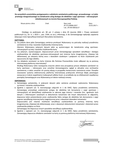 Do wszystkich uczestników postępowania o udzielenie zamówienia publicznego prowadzonego w trybie przetargu nieograniczonego na świadczenie usług dostępu do obiektów i zajęć sportowo – rekreacyjnych zlokalizowanych na terenie Rzeczypospolitej Polskiej. Wasze pismo z dnia: Znak: Nasz znak: ZP.272.00006.2017 l.dz.: ZP.KW-00016/17 Data: 23.01.2017 r. Działając na podstawie art. 38 ust. 2 ustawy z dnia 29 stycznia 2004 r. Prawo zamówień publicznych (t.j. Dz. U. z 2015 r., poz. 2164, ze zm.), informuję, iż do Zamawiającego wpłynęły zapytania dotyczące treści Specyfikacji Istotnych Warunków Zamówienia. ZAPYTANIA: 1. Czy jedyne dane jakie Zamawiający zamierza przekazać Wykonawcy na potrzeby realizacji przedmiotu zamówienia to imię i nazwisko Użytkownika imiennej karty. Zdaniem Wykonawcy jedynymi danymi jakie są wystarczające do świadczenia usług sportoworekreacyjnych są imię i nazwisko Użytkownika karty 2. Czy jedynym, wystarczającym, dopuszczonym przez Zamawiającego sposobem weryfikacji i dostępu użytkowników do obiektów sportowo-rekreacyjnych jest imienna karta (magnetyczna, chipowa lub zbliżeniowa), po okazaniu której wraz z dowodem osobistym i podpisem na liście Użytkownik jest wpuszczany do tego obiektu. 3. Czy składanie zamówień na karty imienne dla Państwa Pracowników może odbywać się za pomocą internetowej platformy internetowej? Według Wykonawcy takie rozwiązania znacznie ułatwi oraz przyspieszy proces składania zamówień na karty sportowo – rekreacyjne oraz umożliwi Zamawiającemu wgląd w aktualne oraz archiwalne zamówienia, a także umożliwi ich prostą edycję w przypadku konieczności naniesienia zmian. Ponadto stosowanie systemu elektronicznej platformy internetowej praktycznie eliminuje błędy powstające zazwyczaj w trakcie wypełniania tradycyjnych plików Excel, co przekłada się na efektywność współpracy pomiędzy Zamawiającym oraz Wykonawcą w trakcie realizacji umowy. ODPOWIEDZI: 1. Zamawiający potwierdza, iż jedynymi danymi jakie zamierza przekazać wybranemu Wykonawcy są imiona i nazwiska użytkowników. 2. Zgodnie z zapisami ust. 9, stanowiącego załącznik nr 1 do SIWZ, Opisu przedmiotu zamówienia, Zamawiający przewiduje uzależnienie wstępu do obiektów lub korzystania z zajęć sportowo – rekreacyjnych od identyfikacji użytkownika w zakresie jego imienia i nazwiska (tzn. zgodności tych danych z informacjami zawartymi w dokumencie tożsamości lub innym dokumencie ze zdjęciem), dopuszcza także potwierdzenie przez użytkownika faktu wstępu do obiektów lub skorzystania z zajęć poprzez weryfikację imiennej karty magnetycznej wraz z okazanym dowodem tożsamości. Dopuszczalna jest również możliwość weryfikacji użytkowników za pomocą imiennej karty (magnetycznej, chipowej lub zbliżeniowej), wraz z okazanym dokumentem tożsamości i złożeniem przez użytkownika podpisu na liście. Zamawiający nie dopuszcza innych sposobów weryfikacji użytkowników. 3. Zgodnie z zapisami ust. 11, stanowiącego załącznik nr 1 do SIWZ, Opisu przedmiotu zamówienia, Zamawiający dopuszcza składanie zamówień na karty za pomocą platformy internetowej Wykonawcy. Starostwo Powiatowe w Poznaniu, ul. Jackowskiego 18, 60-509 Poznań tel. centrala (61) 8410-500, email: [email protected]