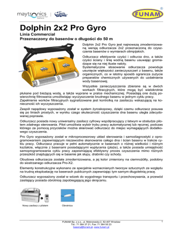 Dolphin 2x2 Pro Gyro Linia Commercial Przeznaczony do basenów o długości do 50 m Dolphin 2x2 Pro Gyro jest najnowszą zmodernizowaną wersją odkurzacza 2x2 przeznaczoną do czyszczenia basenów o wymiarach olimpijskich. Odkurzacz efektywnie czyści i odkurza dno, a także czyści ściany i linię wodną basenu usuwając gromadzące się na niej tłuste naloty. Systematyczne stosowanie odkurzacza powoduje usunięcie większości zanieczyszczeń z basenu, także organicznych, co w istotny sposób ogranicza zużycie preparatów chemicznych używanych do uzdatniania wody basenowej. Wszystkie zanieczyszczenia zbierane są w dwóch workach filtracyjnych, które mogą być wielokrotnie płukane pod bieżącą wodą, a także wyprane w pralce mechanicznej. Posiadają one dużą powierzchnię filtrowania umożliwiając wyczyszczenie brudnego basenu w jednym cyklu pracy. Zapełnienie worków filtracyjnych sygnalizowane jest kontrolką na zasilaczu wskazującą na konieczność ich wyczyszczenia. Zespół napędowy wyposażony został w system żyroskopowy, dzięki czemu odkurzacz posuwa się po liniach prostych, w wyniku czego skuteczność czyszczenia dna basenu uległa zdecydowanej poprawie. Odkurzacz posiada nowy uniwersalny zasilacz cyfrowy współpracujący z łatwym w obsłudze pilotem zdalnego sterowania. Pilot umożliwia wybór trybu pracy automatycznej lub ręcznej, podczas którego za pomocą przycisków można skierować odkurzacz do miejsc wymagających dodatkowego czyszczenia. Pro Gyro wyposażony został w mikroprocesorowy układ sterowania i samodiagnostyki z oprogramowaniem zapewniającym niezawodne skanowanie całego dna i ścian basenu w trakcie cyklu pracy. Odkurzacz pracuje w pełni automatycznie w basenach o różnej wielkości i różnym kształcie, włącznie z basenami posiadającymi wypłycenia (plaże), a także posiada umiejętność samoprogramowania cyklu pracy zapewniającą efektywny proces czyszczenia mimo różnych przeszkód znajdujących się w basenie jak słupy, drabinki czy schody. Obudowa odkurzacza została zmodernizowana, a jej kolor zmieniony na ciemnożółty, podobny do siostrzanego odkurzacza Pro-X2. Elementy konstrukcyjne wykonano ze specjalnie wzmacnianych tworzyw sztucznych ze względu na trudną eksploatację na basenach publicznych zapewniając tym samym długoletnią pracę. Odkurzacz wyposażony został w wózek do wygodnego transportu i przechowywania, a przewód zasilający posiada obrotnicę zapobiegającą jego skręcaniu. Nowy zasilacz z pilotem Obrotnica FUNAM Sp. z o.o., ul. Mokronoska 2, 52-407 Wrocław Tel.: 71 364 37 21, Fax: 71 364 55 23 [email protected], www.funam.pl 1 Cechy odkurzacza 2x2 Pro Gyro Doskonała skuteczność czyszczenia i odkurzania dna, ścian i linii wodnej basenu. Cykl pracy (czyszczenia) do wyboru: 4, 6 lub 8 godzin, po czym następuje automatyczne wyłączenie odkurzacza. Zespół napędowy wyposażono w system żyroskopowy, dzięki czemu odkurzacz porusza się po liniach prostych, a skuteczność odkurzania dna basenu jest zdecydowanie lepsza. Zespoły napędowe posiadają zabezpieczenie przed przeciążeniem. Pilot zdalnego sterowania umożliwia wybór trybu czyszczenia automatycznego lub ręcznego, a także wybór programu czyszczenia i parametrów pracy automatycznej. Cztery szczotki i dwa zespoły napędowe polepszają zdecydowanie właściwości manewrowe odkurzacza podczas pracy automatycznej i ręcznej. Nowy zasilacz cyfrowy posiada kontrolkę wskazującą na konieczność wyczyszczenia worka. Przewód zasilający o długości 40 m posiada obrotnicę zapobiegającą jego skręcaniu. Wyposażony jest w mocny wózek do wygodnego transportu i przechowywania odkurzacza. Standardowo wyposażony w szczotkę CB (Combi Brush - szczotka PVC z dwoma pierścieniami Wonder) przeznaczoną do basenów wykonanych z żywic poliestrowych i stali nierdzewnej, basenów wyłożonych folią PVC, a także basenów pokrytych różnymi rodzajami szorstkiej ceramiki. Gwarancja – 24 miesiące, przy czym gwarancja na zespół napędowy – 3 000 godzin pracy. Pilot zdalnego sterowania Pilot umożliwia wybór trybu pracy ręcznej (sterowanie ruchami odkurzacza) oraz trybu pracy automatycznej. W czasie pracy ręcznej sterowanie ruchami odkurzacza odbywa się za pomocą czterech przycisków. Po zmianie trybu pracy na automatyczny możliwy jest wybór parametrów oraz rodzaju czyszczenia obrazowanych za pomocą umieszczonych na wyświetlaczu ikonek: Długość cyklu pracy (czyszczenia): - cykl szybki 4 godziny, - cykl skuteczny do codziennego czyszczenia 6 godzin (nastawa domyślna), - cykl ekstra skuteczny 8 godzin. Zwłoka rozpoczęcia pracy (umożliwia opadnięcie zanieczyszczeń na dno basenu): - bez zwłoki (nastawa domyślna), - zwłoka 1 godz, - zwłoka 2 godz. Rodzaj czyszczenia: - standard (nastawa domyślna) - czyszczenie dna, ścian i linii wodnej basenu, - ultra czyszczenie dna i narożników basenu (zwiększone ssanie i wolniejsze ruchy odkurzacza) - zwykłe czyszczenie dna i narożników basenu, - czyszczenie ścian i linii wodnej basenu. Zasięg nadajnika pilota Baterie zasilające 50 m 2xAAA FUNAM Sp. z o.o., ul. Mokronoska 2, 52-407 Wrocław Tel.: 71 364 37 21, Fax: 71 364 55 23 [email protected], www.funam.pl 2 Dane techniczne Cykl pracy (czyszczenia) Długość przewodu zasilającego Obrotnica Dokładność filtrowania Powierzchnia filtrowania Prędkość czyszczenia liniowa Prędkość czyszczenia powierzchni Szerokość czyszczenia Szczotki Wydajność pomp Napięcie zasilające zespoły napędowe Pobór mocy zespołów napędowych Zasilacz Napięcie zasilania pierwotne Napięcie zasilania wtórne Stopień ochrony zasilacza Wózek Masa (bez przewodu) Masa wózka Wymiary kartonu z odkurzaczem 4 / 6 / 8 godzin 40 m tak - zabezpieczenie przed skręcaniem przewodu 50 µm i 70 µm (dwa zestawy worków filtracyjnych) 15 500 cm2 900 m/godz 700 m2/godz 0,9 m CB, jako opcja szczotki WB 2 x 17 m3/godz 27 VDC 200 W uniwe