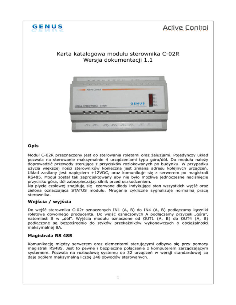 Karta katalogowa modułu sterownika C-02R Wersja dokumentacji 1.1 Opis Moduł C-02R przeznaczony jest do sterowania roletami oraz żaluzjami. Pojedynczy układ pozwala na sterowanie maksymalnie 4 urządzeniami typu góra/dół. Do modułu należy doprowadzić przewody sterujące z przycisków rozlokowanych po budynku. W przypadku użycia większej ilości sterowników konieczna jest zmiana adresu kolejnych urządzeń. Układ zasilany jest napięciem +12VDC, oraz komunikuje się z serwerem po magistrali RS485. Moduł został tak zaprojektowany aby nie było możliwe jednoczesne naciśnięcie przycisku góra, dół zabezpieczając silnik przed uszkodzeniem. Na płycie czołowej znajdują się czerwone diody indykujące stan wszystkich wyjść oraz zielona oznaczająca STATUS modułu. Mruganie cykliczne sygnalizuje normalną pracę sterownika. Wejścia / wyjścia Do wejść sterownika C-02r oznaczonych IN1 (A, B) do IN4 (A, B) podłączamy łączniki roletowe dowolnego producenta. Do wejść oznaczonych A podłączamy przycisk „góra”, natomiast B w „dół”. Wyjścia modułu oznaczone od OUT1 (A, B) do OUT4 (A, B) podłączone są bezpośrednio do styków przekaźników wykonawczych o obciążalności maksymalnej 8A. Magistrala RS 485 Komunikację między serwerem oraz elementami sterującymi odbywa się przy pomocy magistrali RS485. Jest to pewne i bezpieczne połączenie z komputerem zarządzającym systemem. Pozwala na rozbudowę systemu do 32 urządzeń w wersji standardowej co daje ogółem maksymalną liczbę 248 obwodów sterowanych. 1 Ustawianie adresu modułu Modułowi C-02r standardowo przypisany jest adres 20. W przypadku gdy w instalacji wykorzystujemy więcej niż jeden układ konieczna jest zmiana adresu na inny. Do tego celu służą zworki na płycie głównej sterownika. Zasilanie Moduł zasilany jest napięciem +12VDC. Dane techniczne Napięcie zasilania modułu........................................................12VDC Maksymalna obciążalność wyjść................................................8A 230VAC Prąd maksymalny....................................................................200mA Temperatura pracy..................................................................-25÷ 50°C Montaż szyna TH35.................................................................(8 modułów 140 mm) 2