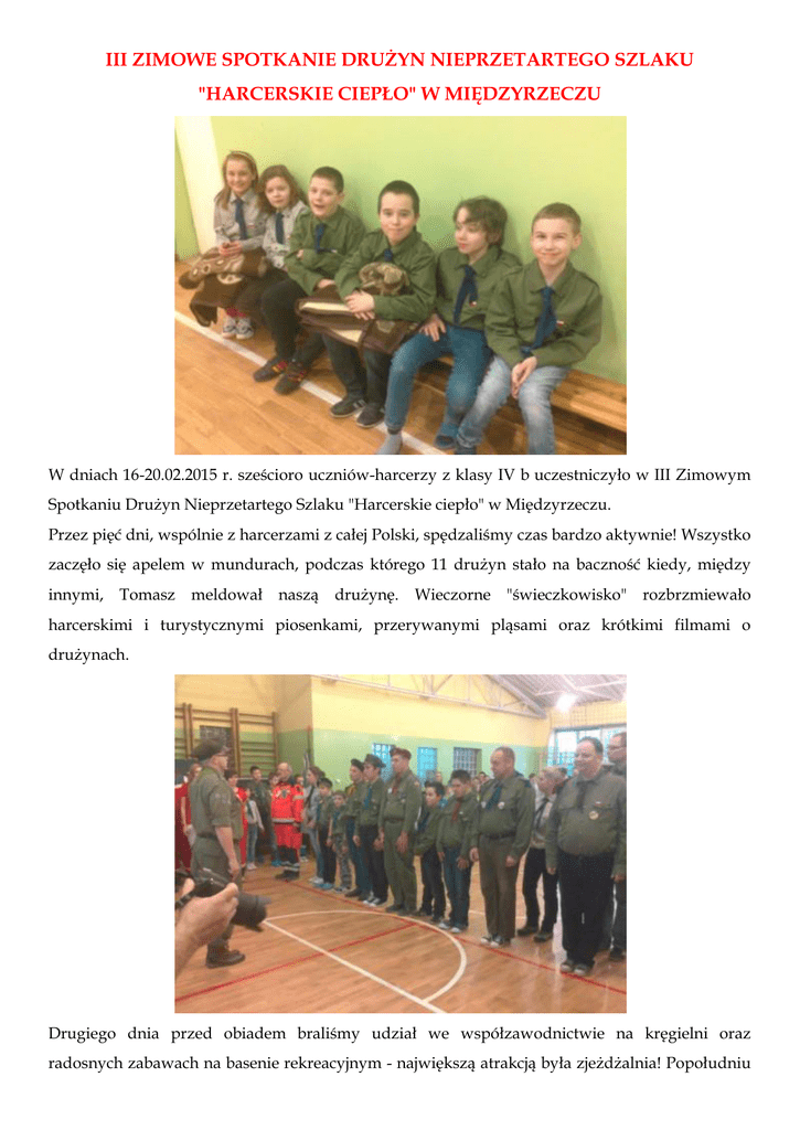 III ZIMOWE SPOTKANIE DRUŻYN NIEPRZETARTEGO SZLAKU "HARCERSKIE CIEPŁO" W MIĘDZYRZECZU W dniach 16-20.02.2015 r. sześcioro uczniów-harcerzy z klasy IV b uczestniczyło w III Zimowym Spotkaniu Drużyn Nieprzetartego Szlaku "Harcerskie ciepło" w Międzyrzeczu. Przez pięć dni, wspólnie z harcerzami z całej Polski, spędzaliśmy czas bardzo aktywnie! Wszystko zaczęło się apelem w mundurach, podczas którego 11 drużyn stało na baczność kiedy, między innymi, Tomasz meldował naszą drużynę. Wieczorne "świeczkowisko" rozbrzmiewało harcerskimi i turystycznymi piosenkami, przerywanymi pląsami oraz krótkimi filmami o drużynach. Drugiego dnia przed obiadem braliśmy udział we współzawodnictwie na kręgielni oraz radosnych zabawach na basenie rekreacyjnym - największą atrakcją była zjeżdżalnia! Popołudniu odbyły się zajęcia Przygotowaliśmy zdrowe kulinarne. kolorowe kanapki i oraz pomogliśmy w zrobieniu sałatki jarzynowej. Wieczorem tańczyliśmy na dyskotece "black&white" i braliśmy udział w nagraniu teledysku do piosenki "Ona tu jest i tańczy dla mnie". W środę po śniadaniu mogliśmy sprawdzić się w różnych konkurencjach sportowych, m.in. w rzutkach, przejściu równoważnym po ławeczce, kręglach, rzutach do kosza i do celu, slalomie oraz odbiciach piłeczki rakietą tenisową. Wspieraliśmy się w wykonywaniu zadań ruchowych kibicując sobie wzajemnie. W związku z tym, że była to Środa Popielcowa wybraliśmy się do kościoła. Po Mszy Św. zwiedzaliśmy centrum Międzyrzecza. Po kolacji odbyła się nauka prostych słów w języku migowym oraz zajęcia z wykorzystania zmysłów poza wzrokiem i słuchem. Czwartek spędziliśmy w Przytocznej, gdzie odbyła się gra terenowa wokół jeziorka Przytoczno, ognisko z kiełbaskami oraz pokaz filmu "Czarne stopy". Po powrocie do Międzyrzecza obejrzeliśmy pokaz ratowników medycznych oraz oglądaliśmy wnętrze i sprzęt w karetce. Na końcowym apelu wszystkim harcerzom rozdane zostały drobne nagrody, a nasza drużyna została wyróżniona za całokształt zdobywając I miejsce i otrzymała specjalną nagrodę płaskorzeźbę lilijki harcerskiej! Zimowe Spotkanie w Międzyrzeczu dostarczyło nam ogromnie dużo "harcerskiego ciepła", pozwoliło nawiązać nowe przyjaźnie, ale przede wszystkim umożliwiło każdemu stać się bardziej samodzielnym i zadowolonym z siebie.