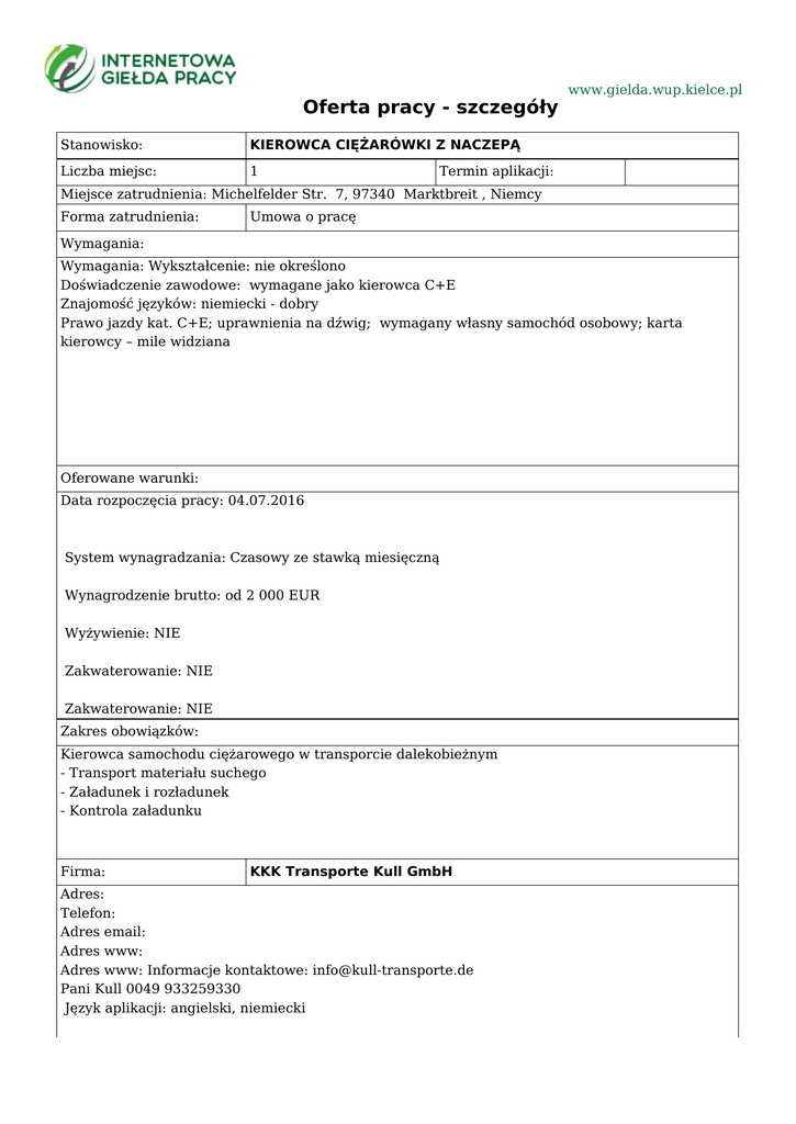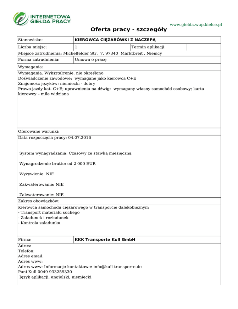 Oferta pracy - szczegóły Stanowisko: KIEROWCA CIĘŻARÓWKI Z NACZEPĄ Liczba miejsc: 1 www.gielda.wup.kielce.pl Termin aplikacji: Miejsce zatrudnienia: Michelfelder Str. 7, 97340 Marktbreit , Niemcy Forma zatrudnienia: Umowa o pracę Wymagania: Wymagania: Wykształcenie: nie określono Doświadczenie zawodowe: wymagane jako kierowca C+E Znajomość języków: niemiecki - dobry Prawo jazdy kat. C+E; uprawnienia na dźwig; wymagany własny samochód osobowy; karta kierowcy – mile widziana Oferowane warunki: Data rozpoczęcia pracy: 04.07.2016 System wynagradzania: Czasowy ze stawką miesięczną Wynagrodzenie brutto: od 2 000 EUR Wyżywienie: NIE Zakwaterowanie: NIE Zakwaterowanie: NIE Zakres obowiązków: Kierowca samochodu ciężarowego w transporcie dalekobieżnym - Transport materiału suchego - Załadunek i rozładunek - Kontrola załadunku Firma: KKK Transporte Kull GmbH Adres: Telefon: Adres email: Adres www: Adres www: Informacje kontaktowe: [email protected] Pani Kull 0049 933259330 Język aplikacji: angielski, niemiecki Sposób aplikowania: bezpośrednio do pracodawcy Sposób przekazania dokumentów: e-mail Wymagane dokumenty: CV Uwagi: Identyfikator oferty: 10000-1138446021-S Instytucja koordynująca ofertę: Dolnośląski Wojewódzki Urząd Pracy Filia we Wrocławiu Urząd Pracy dokłada wszelkich starań, aby oferty pracy będące w zasobach urzędu, były rzetelne i wiarygodne. Ponieważ wszystkie oferty pracy pochodzą od osób trzecich Urząd Pracy zastrzega, że odpowiedzialność za ewentualne rozbieżności pomiędzy warunkami pracy zaprezentowanymi w niniejszej ofercie a warunkami zaproponowanymi przez potencjalnego pracodawcę ponosi pracodawca.