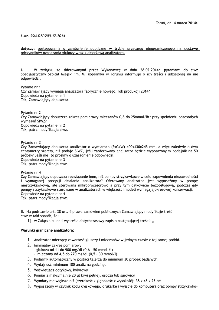 Toruń, dn. 4 marca 2014r. L.dz. SSM.DZP.200.17.2014 dotyczy: postępowania o zamówienie publiczne w trybie przetargu nieograniczonego na dostawę odczynników oznaczania glukozy wraz z dzierżawą analizatora. I. W związku ze skierowanymi przez Wykonawcę w dniu 28.02.2014r. pytaniami do siwz Specjalistyczny Szpital Miejski im. M. Kopernika w Toruniu informuje o ich treści i udzielonej na nie odpowiedzi. Pytanie nr 1 Czy Zamawiający wymaga analizatora fabrycznie nowego, rok produkcji 2014? Odpowiedź na pytanie nr 1 Tak, Zamawiający dopuszcza. Pytanie nr 2 Czy Zamawiający dopuszcza zakres pomiarowy mleczanów 0,8 do 25mmol/litr przy spełnieniu pozostałych wymagań SIWZ? Odpowiedź na pytanie nr 2 Tak, patrz modyfikacja siwz. Pytanie nr 3 Czy Zamawiający dopuszcza analizator o wymiarach (SxGxW) 400x430x245 mm, a więc zaledwie o dwa centymetry szerszy, niż podaje SIWZ, jeśli zaoferowany analizator będzie wyposażony w podajnik na 50 próbek? Jeśli nie, to prosimy o uzasadnienie odpowiedzi. Odpowiedź na pytanie nr 3 Tak, patrz modyfikacja siwz. Pytanie nr 4 Czy Zamawiający dopuszcza rozwiązanie inne, niż pompy strzykawkowe w celu zapewnienia niezawodności i wymaganej precyzji działania analizatora? Oferowany analizator jest wyposażony w pompę niestrzykawkową, ale sterowaną mikroprocesorowo a przy tym całkowicie bezobsługową, podczas gdy pompy strzykawkowe stosowane w analizatorach w większości modeli wymagają okresowej konserwacji. Odpowiedź na pytanie nr 4 Tak, patrz modyfikacja siwz. II. Na podstawie art. 38 ust. 4 prawa zamówień publicznych Zamawiający modyfikuje treść siwz w taki sposób, że: 1) w Załączniku nr 1 wykreśla dotychczasowy zapis o następującej treści: „ Warunki graniczne analizatora: 1. Analizator mierzący zawartość glukozy i mleczanów w jednym czasie z tej samej próbki. 2. Minimalny zakres pomiarowy: 3. 4. 5. 6. 7. 8. - glukoza od 11 do 900 mg/dl (0,6 – 50 mmol /l) - mleczany od 4,5 do 270 mg/dl (0,5 – 30 mmol/l) Podajnik automatyczny w postaci talerza do minimum 30 próbek badanych. Wydajność minimum 100 analiz na godzinę. Wyświetlacz dotykowy, kolorowy. Pomiar z maksymalnie 20 μl krwi pełnej, osocza lub surowicy. Wymiary nie większe niż (szerokość x głębokość x wysokość): 38 x 45 x 25 cm Wyposażony w czytnik kodu kreskowego, drukarkę i wyjście do komputera oraz pompy strzykawko- 9. we dla zwiększenia niezawodności i precyzji działania. System powinien zapewnić możliwość pracy w oparciu o odczynniki dostarczane w próbówkach 1,5 – 2 ml i kapilary end-to-end. Wymagania konieczne : 1. Termin ważności odczynników minimum 6 miesięcy 2. Dostarczający dokona raz w roku na własny koszt przeglądu serwisowego analizatora. 3. Do wyceny zostaną wliczone wszystkie niezbędne odczynniki, standardy, płyny płuczące, elementy jednorazowego użytku (bez materiału kontrolnego) niezbędne do wykonania oznaczenia. 4. Ilość oznaczeń na 36 miesięcy – 90 000. Lp. Parametr 1 glukoza 2 * Ilość oznaczeń Ilość opakowań /podać/ Ilość testów w opakowan iu Cena jedn. netto opak. Wartość netto Vat% Wartość brutto Nazwa handlowa/ Producent 90 000 Ogółem *Podać wszystkie ceny: odczynników, materiałów niezbędnych do wykonywania oznaczeń tj. standardów, płynów płuczących, elementów jednorazowego użytku (bez materiału kontrolnego) niezbędnych do wykonania oznaczenia itd. Lp. Nazwa j.m. Ilość 1 Dzierżawa analizatora ….................................... (podać nazwę producenta i typ analizatora) Ogółem: m-c 36 Cena netto za 1 m-c Wartość netto Vat% Wartość brutto Wartość brutto zamówienia: (odczynniki, standardy, płyny płuczące, elementy jednorazowego użytku (bez materiału kontrolnego) niezbędne do wykonania oznaczenia+dzierżawa analizatora) - ..................... ”, a w miejsce wykreślonego zapisu wprowadza nowy zapis o następującej treści: „ Warunki graniczne analizatora: 1. Analizator mierzący zawartość glukozy i mleczanów w jednym czasie z tej samej próbki. 2. Minimalny zakres pomiarowy: 3. 4. 5. 6. 7. 8. 9. - glukoza od 11 do 900 mg/dl (0,6 – 50 mmol /l) - mleczany od 4,5 do 270 mg/dl (od 0,5-0,8 do 25–30 mmol/l) Podajnik automatyczny w postaci talerza do minimum 30 próbek badanych. Wydajność minimum 100 analiz na godzinę. Wyświetlacz dotykowy, kolorowy. Pomiar z maksymalnie 20 μl krwi pełnej, osocza lub surowicy. Wymiary nie większe niż (szerokość x głębokość x wysokość): 38-40 x 43-45 x 24,5-25 cm Wyposażony w czytnik kodu kreskowego, drukarkę i wyjście do komputera oraz pompy strzykawkowe lub sterownik mikroprocesorowy dla zwiększenia niezawodności i precyzji działania. System powinien zapewnić możliwość pracy w oparciu o odczynniki dostarczane w próbówkach 1,5 – 2 ml i kapilary end-to-end. Wymagania konieczne : 1. Termin ważności odczynników minimum 6 miesięcy 2. Dostarczający dokona raz w roku na własny koszt przeglądu serwisowego analizatora. 3. Do wyceny zostaną wliczone wszystkie niezbędne odczynniki, standardy, płyny płuczące, elementy jednorazowego użytku (bez materiału kontrolnego) niezbędne do wykonania oznaczenia. 4. Ilość oznaczeń na 36 miesięcy – 90 000. Lp. Parametr 1 glukoza 2 * Ilość oznaczeń Ilość opakowań /podać/ Ilość testów w opakowaniu Cena jedn. netto opak. Wartość netto Vat% Wartość brutto Nazwa handlowa/ Producent 90 000 Ogółem *Podać wszystkie ceny: odczynników, materiałów niezbędnych do wykonywania oznaczeń tj. standardów, płynów płuczących, elementów jednorazowego użytku (bez materiału kontrolnego) niezbędnych do wykonania oznaczenia itd. Lp. Nazwa j.m. Ilość 1 Dzierżawa analizatora ….................................... (podać nazwę producenta i typ analizatora) Ogółem: m-c 36 Cena netto za 1 m-c Wartość netto Vat% Wartość brutto Wartość brutto zamówienia: (odczynniki, standardy, płyny płuczące, elementy