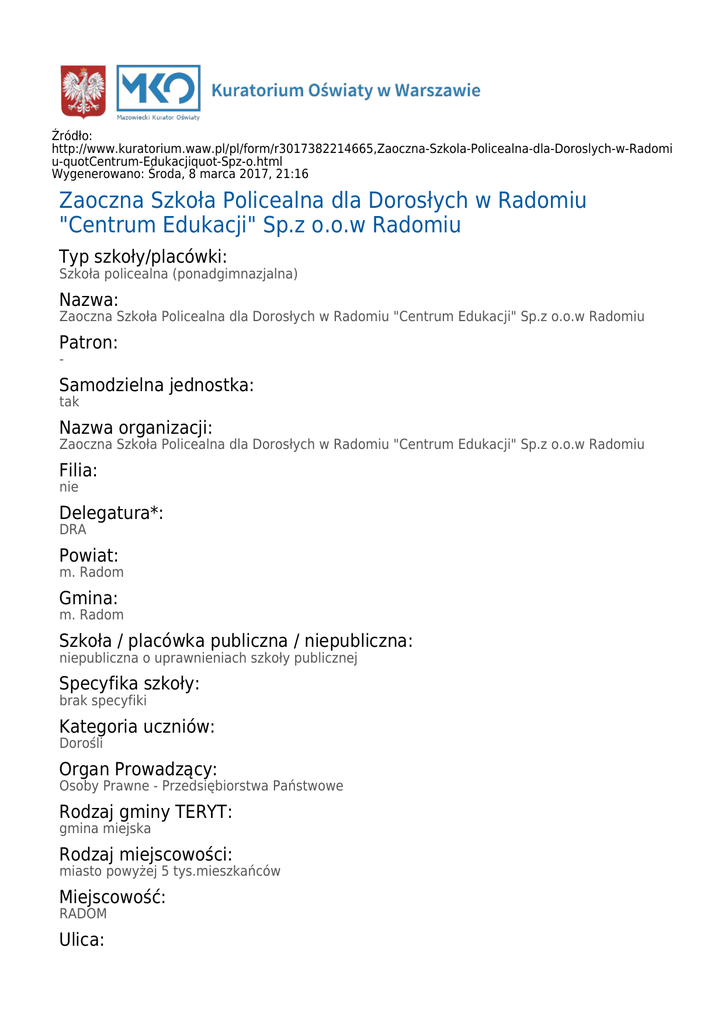 Źródło: http://www.kuratorium.waw.pl/pl/form/r3017382214665,Zaoczna-Szkola-Policealna-dla-Doroslych-w-Radomi u-quotCentrum-Edukacjiquot-Spz-o.html Wygenerowano: Środa, 8 marca 2017, 21:16 Zaoczna Szkoła Policealna dla Dorosłych w Radomiu "Centrum Edukacji" Sp.z o.o.w Radomiu Typ szkoły/placówki: Szkoła policealna (ponadgimnazjalna) Nazwa: Zaoczna Szkoła Policealna dla Dorosłych w Radomiu "Centrum Edukacji" Sp.z o.o.w Radomiu Patron: - Samodzielna jednostka: tak Nazwa organizacji: Zaoczna Szkoła Policealna dla Dorosłych w Radomiu "Centrum Edukacji" Sp.z o.o.w Radomiu Filia: nie Delegatura*: DRA Powiat: m. Radom Gmina: m. Radom Szkoła / placówka publiczna / niepubliczna: niepubliczna o uprawnieniach szkoły publicznej Specyfika szkoły: brak specyfiki Kategoria uczniów: Dorośli Organ Prowadzący: Osoby Prawne - Przedsiębiorstwa Państwowe Rodzaj gminy TERYT: gmina miejska Rodzaj miejscowości: miasto powyżej 5 tys.mieszkańców Miejscowość: RADOM Ulica: Tybla 7/11 Kod: 26-600 Telefon: 483629757 E-mail: [email protected] Strona WWW: www.ce.radom.pl ● ● * W – m.st. Warszawa i powiaty okołowarszawskie: grodziski, legionowski, miński, nowodworski, otwocki, piaseczyński, pruszkowski, sochaczewski, warszawski zachodni, wołomiński, żyrardowski DCI - Delegatura w Ciechanowie DOS - Delegatura w Ostrołęce DPŁ – Delegatura w Płocku DRA - Delegatura w Radomiu DSI – Delegatura w Siedlcach ** Pozycje: patron, nr telefonu, adres e-mail, strona www, ulica, nr domu, rodzaj miejscowości, dzielnica są nieobowiązkowe, stąd jeśli szkoła/placówka nie wypełniła tego pola w Systemie Informacji Oświatowej, to nie będą one widoczne w wyszukiwarce.