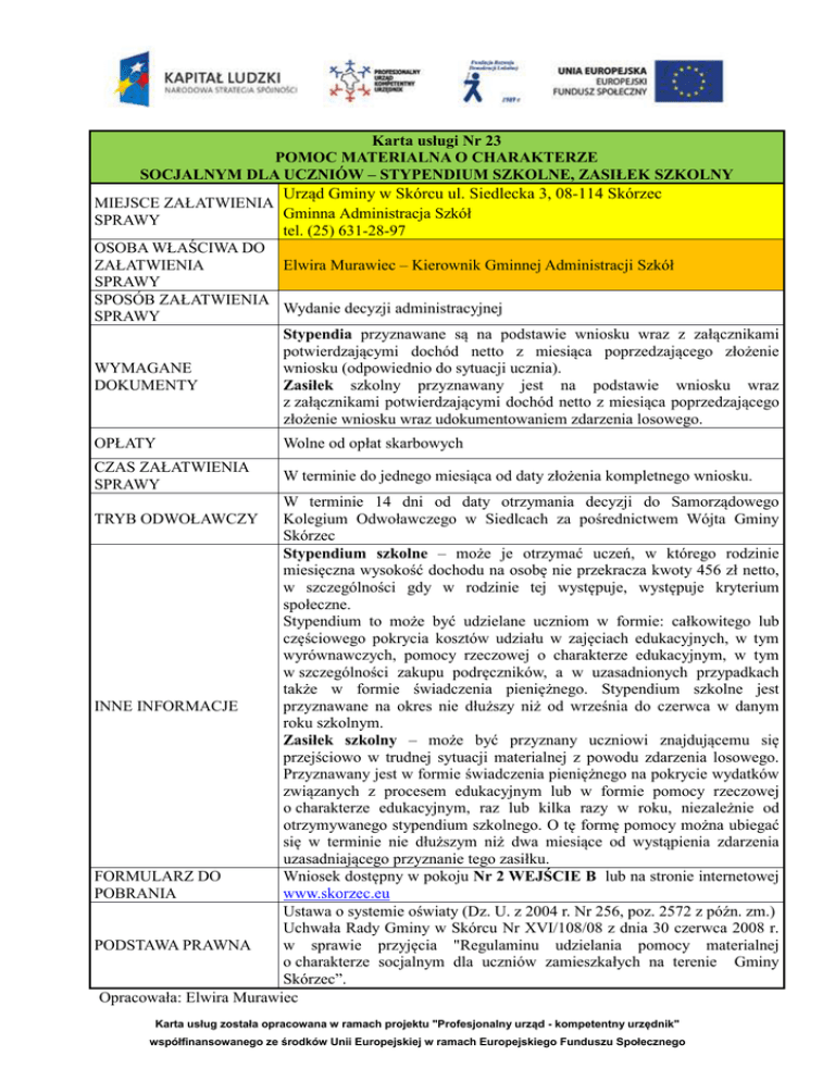Karta usługi Nr 23 POMOC MATERIALNA O CHARAKTERZE SOCJALNYM DLA UCZNIÓW – STYPENDIUM SZKOLNE, ZASIŁEK SZKOLNY Urząd Gminy w Skórcu ul. Siedlecka 3, 08-114 Skórzec MIEJSCE ZAŁATWIENIA Gminna Administracja Szkół SPRAWY tel. (25) 631-28-97 OSOBA WŁAŚCIWA DO Elwira Murawiec – Kierownik Gminnej Administracji Szkół ZAŁATWIENIA SPRAWY SPOSÓB ZAŁATWIENIA Wydanie decyzji administracyjnej SPRAWY Stypendia przyznawane są na podstawie wniosku wraz z załącznikami potwierdzającymi dochód netto z miesiąca poprzedzającego złożenie wniosku (odpowiednio do sytuacji ucznia). WYMAGANE Zasiłek szkolny przyznawany jest na podstawie wniosku wraz DOKUMENTY z załącznikami potwierdzającymi dochód netto z miesiąca poprzedzającego złożenie wniosku wraz udokumentowaniem zdarzenia losowego. OPŁATY Wolne od opłat skarbowych CZAS ZAŁATWIENIA SPRAWY W terminie do jednego miesiąca od daty złożenia kompletnego wniosku. W terminie 14 dni od daty otrzymania decyzji do Samorządowego TRYB ODWOŁAWCZY Kolegium Odwoławczego w Siedlcach za pośrednictwem Wójta Gminy Skórzec Stypendium szkolne – może je otrzymać uczeń, w którego rodzinie miesięczna wysokość dochodu na osobę nie przekracza kwoty 456 zł netto, w szczególności gdy w rodzinie tej występuje, występuje kryterium społeczne. Stypendium to może być udzielane uczniom w formie: całkowitego lub częściowego pokrycia kosztów udziału w zajęciach edukacyjnych, w tym wyrównawczych, pomocy rzeczowej o charakterze edukacyjnym, w tym w szczególności zakupu podręczników, a w uzasadnionych przypadkach także w formie świadczenia pieniężnego. Stypendium szkolne jest INNE INFORMACJE przyznawane na okres nie dłuższy niż od września do czerwca w danym roku szkolnym. Zasiłek szkolny – może być przyznany uczniowi znajdującemu się przejściowo w trudnej sytuacji materialnej z powodu zdarzenia losowego. Przyznawany jest w formie świadczenia pieniężnego na pokrycie wydatków związanych z procesem edukacyjnym lub w formie pomocy rzeczowej o charakterze edukacyjnym, raz lub kilka razy w roku, niezależnie od otrzymywanego stypendium szkolnego. O tę formę pomocy można ubiegać się w terminie nie dłuższym niż dwa miesiące od wystąpienia zdarzenia uzasadniającego przyznanie tego zasiłku. FORMULARZ DO Wniosek dostępny w pokoju Nr 2 WEJŚCIE B lub na stronie internetowej POBRANIA www.skorzec.eu Ustawa o systemie oświaty (Dz. U. z 2004 r. Nr 256, poz. 2572 z późn. zm.) Uchwała Rady Gminy w Skórcu Nr XVI/108/08 z dnia 30 czerwca 2008 r. PODSTAWA PRAWNA w sprawie przyjęcia "Regulaminu udzielania pomocy materialnej o charakterze socjalnym dla uczniów zamieszkałych na terenie Gminy Skórzec”. Opracowała: Elwira Murawiec Karta usług została opracowana w ramach projektu "Profesjonalny urząd - kompetentny urzędnik" współfinansowanego ze środków Unii Europejskiej w ramach Europejskiego Funduszu Społecznego