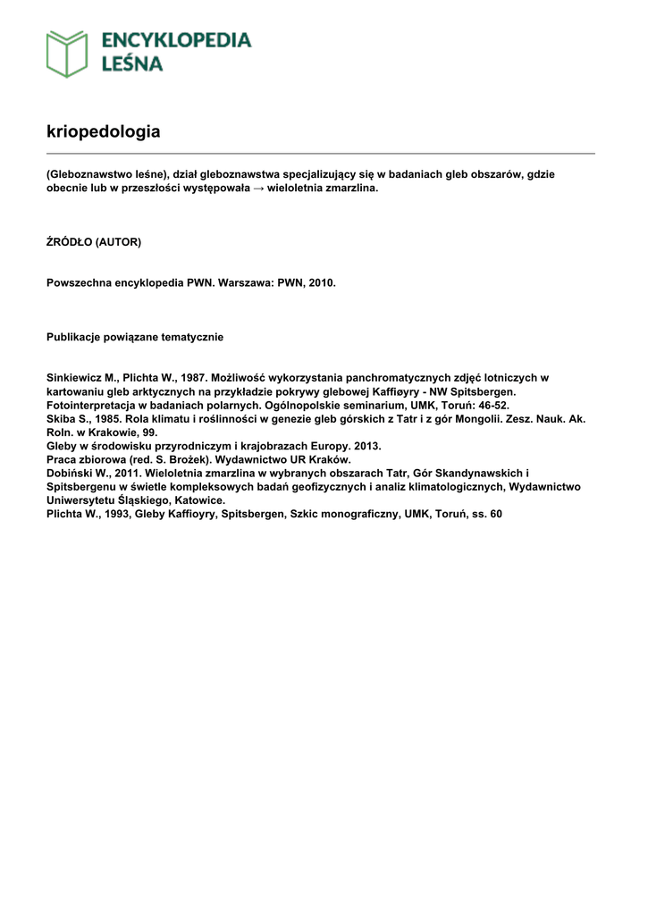 kriopedologia (Gleboznawstwo leśne), dział gleboznawstwa specjalizujący się w badaniach gleb obszarów, gdzie obecnie lub w przeszłości występowała → wieloletnia zmarzlina. ŹRÓDŁO (AUTOR) Powszechna encyklopedia PWN. Warszawa: PWN, 2010. Publikacje powiązane tematycznie Sinkiewicz M., Plichta W., 1987. Możliwość wykorzystania panchromatycznych zdjęć lotniczych w kartowaniu gleb arktycznych na przykładzie pokrywy glebowej Kaffiøyry - NW Spitsbergen. Fotointerpretacja w badaniach polarnych. Ogólnopolskie seminarium, UMK, Toruń: 46-52. Skiba S., 1985. Rola klimatu i roślinności w genezie gleb górskich z Tatr i z gór Mongolii. Zesz. Nauk. Ak. Roln. w Krakowie, 99. Gleby w środowisku przyrodniczym i krajobrazach Europy. 2013. Praca zbiorowa (red. S. Brożek). Wydawnictwo UR Kraków. Dobiński W., 2011. Wieloletnia zmarzlina w wybranych obszarach Tatr, Gór Skandynawskich i Spitsbergenu w świetle kompleksowych badań geofizycznych i analiz klimatologicznych, Wydawnictwo Uniwersytetu Śląskiego, Katowice. Plichta W., 1993, Gleby Kaffioyry, Spitsbergen, Szkic monograficzny, UMK, Toruń, ss. 60