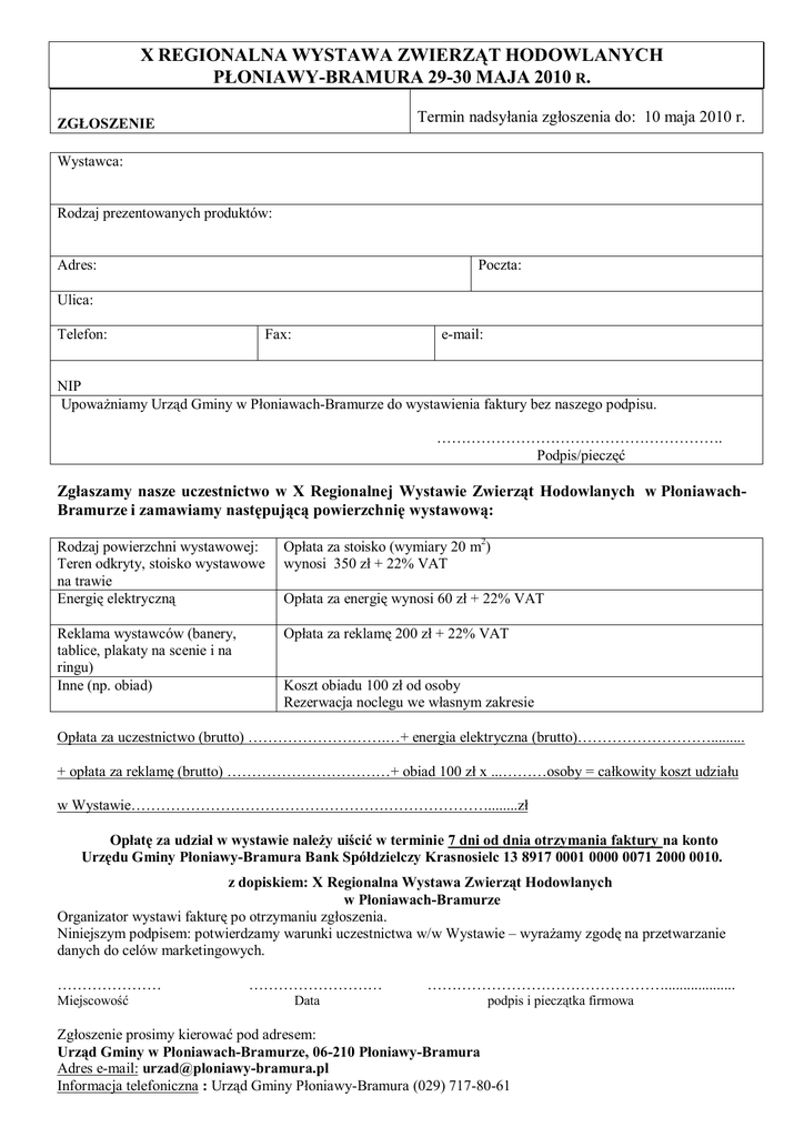 X REGIONALNA WYSTAWA ZWIERZĄT HODOWLANYCH PŁONIAWY-BRAMURA 29-30 MAJA 2010 R. Termin nadsyłania zgłoszenia do: 10 maja 2010 r. ZGŁOSZENIE Wystawca: Rodzaj prezentowanych produktów: Adres: Poczta: Ulica: Telefon: Fax: e-mail: NIP Upoważniamy Urząd Gminy w Płoniawach-Bramurze do wystawienia faktury bez naszego podpisu. …………………………………………………. Podpis/pieczęć Zgłaszamy nasze uczestnictwo w X Regionalnej Wystawie Zwierząt Hodowlanych w PłoniawachBramurze i zamawiamy następującą powierzchnię wystawową: Rodzaj powierzchni wystawowej: Teren odkryty, stoisko wystawowe na trawie Energię elektryczną Opłata za stoisko (wymiary 20 m2) wynosi 350 zł + 22% VAT Reklama wystawców (banery, tablice, plakaty na scenie i na ringu) Inne (np. obiad) Opłata za reklamę 200 zł + 22% VAT Opłata za energię wynosi 60 zł + 22% VAT Koszt obiadu 100 zł od osoby Rezerwacja noclegu we własnym zakresie Opłata za uczestnictwo (brutto) ……………………….…+ energia elektryczna (brutto)………………………......... + opłata za reklamę (brutto) ……………………………+ obiad 100 zł x ...………osoby = całkowity koszt udziału w Wystawie………………………………………………………………........zł Opłatę za udział w wystawie należy uiścić w terminie 7 dni od dnia otrzymania faktury na konto Urzędu Gminy Płoniawy-Bramura Bank Spółdzielczy Krasnosielc 13 8917 0001 0000 0071 2000 0010. z dopiskiem: X Regionalna Wystawa Zwierząt Hodowlanych w Płoniawach-Bramurze Organizator wystawi fakturę po otrzymaniu zgłoszenia. Niniejszym podpisem: potwierdzamy warunki uczestnictwa w/w Wystawie – wyrażamy zgodę na przetwarzanie danych do celów marketingowych. ………………… Miejscowość ……………………… Data …………………………………………................... podpis i pieczątka firmowa Zgłoszenie prosimy kierować pod adresem: Urząd Gminy w Płoniawach-Bramurze, 06-210 Płoniawy-Bramura Adres e-mail: [email protected] Informacja telefoniczna : Urząd Gminy Płoniawy-Bramura (029) 717-80-61
