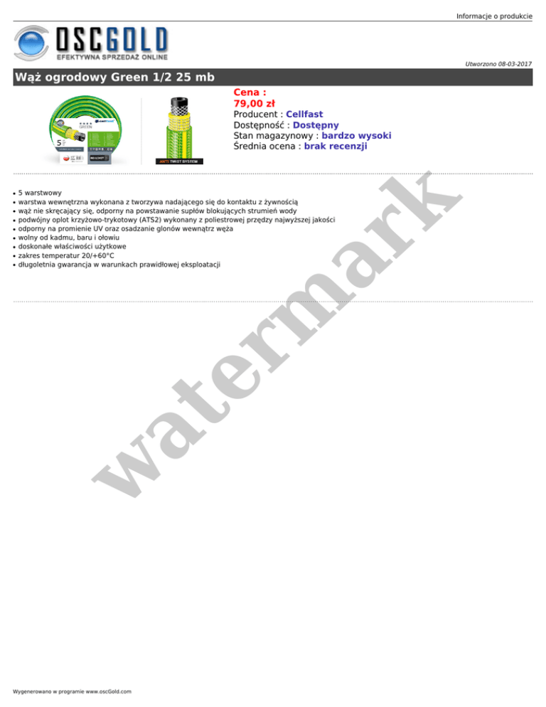 Informacje o produkcie Utworzono 08-03-2017 Wąż ogrodowy Green 1/2 25 mb Cena : 79,00 zł Producent : Cellfast Dostępność : Dostępny Stan magazynowy : bardzo wysoki Średnia ocena : brak recenzji ● ● ● ● ● ● ● w at ● 5 warstwowy warstwa wewnętrzna wykonana z tworzywa nadającego się do kontaktu z żywnością wąż nie skręcający się, odporny na powstawanie supłów blokujących strumień wody podwójny oplot krzyżowo-trykotowy (ATS2) wykonany z poliestrowej przędzy najwyższej jakości odporny na promienie UV oraz osadzanie glonów wewnątrz węża wolny od kadmu, baru i ołowiu doskonałe właściwości użytkowe zakres temperatur 20/+60°C długoletnia gwarancja w warunkach prawidłowej eksploatacji er m ar k ● Wygenerowano w programie www.oscGold.com
